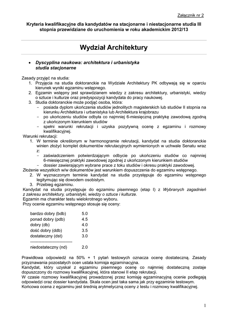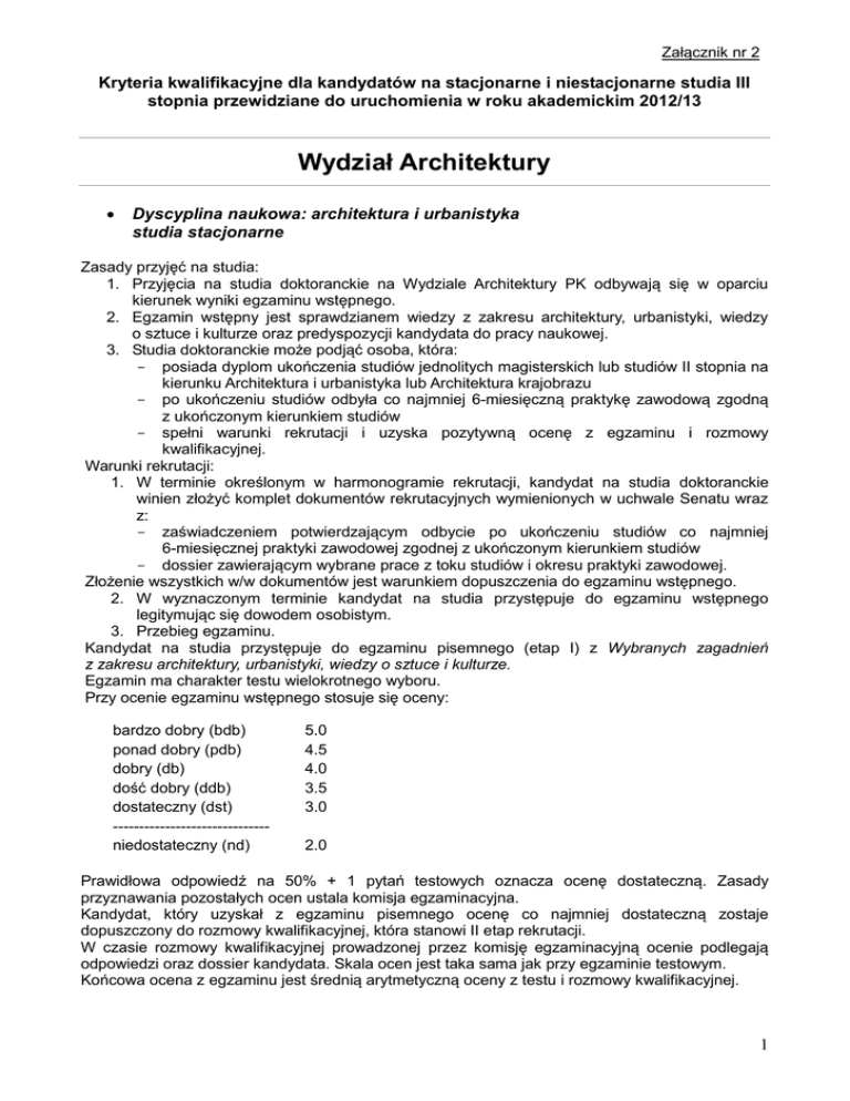 Załącznik nr 2 Kryteria kwalifikacyjne dla kandydatów na stacjonarne i niestacjonarne studia III stopnia przewidziane do uruchomienia w roku akademickim 2012/13 Wydział Architektury Dyscyplina naukowa: architektura i urbanistyka studia stacjonarne Zasady przyjęć na studia: 1. Przyjęcia na studia doktoranckie na Wydziale Architektury PK odbywają się w oparciu kierunek wyniki egzaminu wstępnego. 2. Egzamin wstępny jest sprawdzianem wiedzy z zakresu architektury, urbanistyki, wiedzy o sztuce i kulturze oraz predyspozycji kandydata do pracy naukowej. 3. Studia doktoranckie może podjąć osoba, która: - posiada dyplom ukończenia studiów jednolitych magisterskich lub studiów II stopnia na kierunku Architektura i urbanistyka lub Architektura krajobrazu - po ukończeniu studiów odbyła co najmniej 6-miesięczną praktykę zawodową zgodną z ukończonym kierunkiem studiów - spełni warunki rekrutacji i uzyska pozytywną ocenę z egzaminu i rozmowy kwalifikacyjnej. Warunki rekrutacji: 1. W terminie określonym w harmonogramie rekrutacji, kandydat na studia doktoranckie winien złożyć komplet dokumentów rekrutacyjnych wymienionych w uchwale Senatu wraz z: - zaświadczeniem potwierdzającym odbycie po ukończeniu studiów co najmniej 6-miesięcznej praktyki zawodowej zgodnej z ukończonym kierunkiem studiów - dossier zawierającym wybrane prace z toku studiów i okresu praktyki zawodowej. Złożenie wszystkich w/w dokumentów jest warunkiem dopuszczenia do egzaminu wstępnego. 2. W wyznaczonym terminie kandydat na studia przystępuje do egzaminu wstępnego legitymując się dowodem osobistym. 3. Przebieg egzaminu. Kandydat na studia przystępuje do egzaminu pisemnego (etap I) z Wybranych zagadnień z zakresu architektury, urbanistyki, wiedzy o sztuce i kulturze. Egzamin ma charakter testu wielokrotnego wyboru. Przy ocenie egzaminu wstępnego stosuje się oceny: bardzo dobry (bdb) ponad dobry (pdb) dobry (db) dość dobry (ddb) dostateczny (dst) -----------------------------niedostateczny (nd) 5.0 4.5 4.0 3.5 3.0 2.0 Prawidłowa odpowiedź na 50% + 1 pytań testowych oznacza ocenę dostateczną. Zasady przyznawania pozostałych ocen ustala komisja egzaminacyjna. Kandydat, który uzyskał z egzaminu pisemnego ocenę co najmniej dostateczną zostaje dopuszczony do rozmowy kwalifikacyjnej, która stanowi II etap rekrutacji. W czasie rozmowy kwalifikacyjnej prowadzonej przez komisję egzaminacyjną ocenie podlegają odpowiedzi oraz dossier kandydata. Skala ocen jest taka sama jak przy egzaminie testowym. Końcowa ocena z egzaminu jest średnią arytmetyczną oceny z testu i rozmowy kwalifikacyjnej. 1 Wydział Inżynierii Lądowej Dyscyplina naukowa: budownictwo Dyscyplina naukowa: transport studia stacjonarne O przyjęciu na stacjonarne studia III stopnia decyduje miejsce na liście rankingowej ustalane na podstawie: - średniej ocen z toku studiów I i II stopnia z wagą 0,5 albo studiów jednolitych magisterskich - punktów przyznanych na podstawie rozmowy kwalifikacyjnej w skali 2-5. Wynik rozmowy niższy niż 3 uniemożliwia przyjęcie na studia. W czasie rozmowy kwalifikacyjnej oceniane będą: - prezentacja oryginalnych aspektów pracy dyplomowej oraz możliwości dalszego rozwijania podjętej w niej tematyki - dotychczasowe zainteresowania naukowe (znajomość literatury – czasopism naukowych, monografii, działalność w Kołach Naukowych, konferencjach, własne publikacje) - omówienie wybranej tematyki pracy naukowej (nie będzie to traktowane jako zobowiązanie do jej podjęcia w przyszłości) i artykułu naukowego, którego kopię należy przynieść na rozmowę. Wydział Inżynierii Środowiska Dyscyplina naukowa: inżynieria środowiska studia stacjonarne O przyjęcie na studia III stopnia w dyscyplinie naukowej Inżynieria środowiska może ubiegać się osoba, która posiada tytuł magistra inżyniera lub magistra w zakresie kierunków technicznych albo Matematyki, Fizyki, Chemii lub Informatyki. O przyjęciu na stacjonarne studia III stopnia decyduje miejsce na liście rankingowej ustalane na podstawie sumy: - średnia ocen z toku studiów (jednolitych magisterskich albo studiów I i II stopnia) - punktów przyznanych na podstawie rozmowy kwalifikacyjnej w skali 2-5. Ocena z rozmowy kwalifikacyjnej jest średnią arytmetyczną ocen członków komisji rekrutacyjnej. Rozmowa kwalifikacyjna składa się z dwóch części: 1. Zagadnienia związane z dotychczasową pracą naukowo-zawodową: - praca dyplomowa (problematyka pracy dyplomowej, teoretyczny lub eksperymentalny sposób prowadzenia badań, wykorzystanie literatury) - uczestnictwo w organizacjach naukowych (np. Koła Naukowe) - pełnione funkcje w zakładzie pracy 2. Zagadnienia związane z przyszłą pracą naukową: - motywy podjęcia studiów doktoranckich na Wydziale Inżynierii Środowiska - zagadnienia z zakresu inżynierii wodnej, geotechniki, inżynierii sanitarnej, ogrzewnictwa i klimatyzacji, szczególnie interesujące kandydata. Poza dokumentami wymienionymi w uchwale Senatu, kandydat winien złożyć pisemną zgodę profesora lub doktora habilitowanego na podjęcie funkcji opiekuna naukowego. 2 Wydział Inżynierii i Technologii Chemicznej Dyscyplina naukowa: inżynieria chemiczna Dyscyplina naukowa: technologia chemiczna studia stacjonarne Do studiowania na studiach III stopnia dopuszczona może być wyłącznie osoba, która posiada co najmniej tytuł magistra lub równorzędny, spełnia ustalone warunki rekrutacji oraz ukończyła jeden z następujących kierunków studiów: Chemia, Technologia chemiczna, Inżynieria chemiczna, Biotechnologia, Nanotechnologia, Inżynieria materiałowa, Inżynieria środowiska. Kandydat może zostać przyjęty na I rok studiów na podstawie postępowania kwalifikacyjnego, którego elementami są: wyniki egzaminu wstępnego (egzamin pisemny) z podstaw technologii chemicznej/inżynierii chemicznej oraz wyniki rozmowy kwalifikacyjnej. Podczas postępowania rekrutac