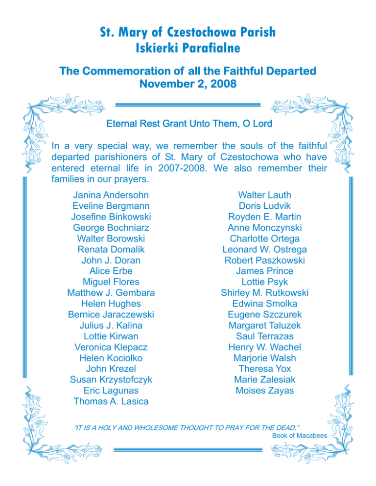 St. Mary of Czestochowa Parish Iskierki Parafialne The Commemoration of all the Faithful Departed November 2, 2008 Eternal Rest Grant Unto Them, O Lord In a very special way, we remember the souls of the faithful departed parishioners of St. Mary of Czestochowa who have entered eternal life in 2007-2008. We also remember their families in our prayers. Janina Andersohn Eveline Bergmann Josefine Binkowski George Bochniarz Walter Borowski Renata Domalik John J. Doran Alice Erbe Miguel Flores Matthew J. Gembara Helen Hughes Bernice Jaraczewski Julius J. Kalina Lottie Kirwan Veronica Klepacz Helen Kociolko John Krezel Susan Krzystofczyk Eric Lagunas Thomas A. Lasica Walter Lauth Doris Ludvik Royden E. Martin Anne Monczynski Charlotte Ortega Leonard W. Ostrega Robert Paszkowski James Prince Lottie Psyk Shirley M. Rutkowski Edwina Smolka Eugene Szczurek Margaret Taluzek Saul Terrazas Henry W. Wachel Marjorie Walsh Theresa Yox Marie Zalesiak Moises Zayas “IT IS A HOLY AND WHOLESOME THOUGHT TO PRAY FOR THE DEAD.” Book of Macabees Sunday November 2, Sunday, Commemoration of All the Faithful Departed, (All Souls Day) 7:30 †Holy Souls in 2008 Book of Remembrance 9:00 †Holy Souls in 2008 Book of Remembrance 10:30 †Za zmarłych wymienionych w wypominkach 12:30 †Por los Difuntos 5:PM †Por los Difuntos 7PM †Za zmarłych wymienionych w wypominkach November 3, Monday, Martin de Torres, religious 7:00 †Holy Souls in Book of Remembrance 8:00 †John Tetlak (Dorothy Tetlak) November 4, Tuesday, Charles Borromeo, bishop 7:00 †Evelyn Bergman 8:00 †Adam Kasperski (Dorothy Tetlak) November 5, Wednesday, Weekday 7:00 †Rose Borowiak (Diane Bishop) 8:00 †Marie Zalesiak (Frances Lipka) 8:30 Eucharistic Adoration until 7PM 7PM El Circulo de Oración November 6, Thursday, Weekday 7:00 †Holy Souls in Book of Remembrance 8:00 †Evelyn Bergman November 7, Friday, Weekday 7:00 For good health for Kim Tross (Women’s Club) 8:00 For good health for Loretta Bolociuch (Women’s Club) 8:30 Adoration 7PM Polish Mass November 8, Saturday, Weekday 8:00 †J & C. Alexander 5:00 †Dorothy Tomczak (Ron Tomczak) †Genevieve Kowalski (Julie Zurawski) †Marie Zalesiak (Zabinski, G. & C) †Teofila & Stanley Matysiak †Rose & Frank Kuzara †Robert Kuzara †Frank Kuzara, Jr. Sunday, November 9, Dedication of the Lateran Basilica in Rome 7:30 Parishioners 9:00 †Holy Souls in Book of Remembrance 10:30 W intencji Bogu wiadomej prosi Stanisław O zdrowie i Boże bł. dla Ewelinki Majerczyk z okazji 5 urodzin Iskierki Parafialne 12:30 5:00 7:00 O szcześliwą podróz do Polski dla Stanisława Klimczuka †Jan i Bronisława Sowinski (family & friends) †Halina Czykier (od męża) †Edward Ptak (od żony i dzieci) †Andrzej Gil (w 30 miesięcy) †Józef Gil (w 4-tym miesięcu) †Weronika Klepacz (rodzina) †Feliks Nowakowski (family) †Krzysztof Tylka †Jan Tylka †Tadeusz Szczęśniak Por los feligreses †Por los Difuntos †Maria i Jan Szczepaniak oraz ich zmarłych rodziców †Walter Cooper †Józef Charyton Czesław, Helena, Stanisława, Karolina Charyton Lector Schedule November 8, 2008 5pm Martha Stolarski, Sr. Magdalene November 9, 2008 7:30 John Kociolko 9:00 Marissa Martinez, Eric Batrez 10:30 Alicja Krzak, Waldemar Lipka 12:30 Esteban Talavera, Marisol Ortiz Juan Rodriguez, Maria Rodriguez 5:00 Humberto Tellez, Trinidad Torrez Linda Ramirez, Martha Brito Eucharistic Ministers November 8, 2008 5pm Joanne & Larry Napoletano November 9, 2008 7:30 Ed Hennessy 9:00 Myra Rodriguez, Christine Zaragoza, John Kulaga, Rafael Ayala 10:30 Rafal T. Bielobradek 12:30 Marisol Ortiz, Olivia Ortiz, Linda Ramirez 5:00 Ma. Clara Nava, Enrique GarciaWEDDING BANNS There is a promise of marriage between…. II. Diana D. Maciejewski & John Belda II. Marisol del Rosio Brambila & Angel A. Rangel St. Mary of Czestochowa Sunday Collection October 26, 2008 10/25 5:00PM $730.00 10/26 7:30AM $353.00 9:00AM $776.00 The colossal Christmas Raffle has now been rolled out. Tickets are $5 each or 3 tickets for $10. Prizes are $1,000, $400, and $100. The drawing will be held on December 19, 2008 at 9AM in Makuch Hall. Winner need not be present. Representatives of the school will be at selected Masses beginning November 8th. Tickets can also be delivered to your house...call Mr. Theis at (708) 6565010 ext. 56. All proceeds will benefit our parish school. Please consider buying books, movies, music, games and software from a brand-new website that functions like Amazon.com for the benefit our school. You’ll receive a 25% discount off the list price of popular fiction and non-fiction books and our school will receive 6% of the sales to be used for enriching our instructional programs. Please share this site https:// smczestochowa.MyLibraryBookstore.comwith your friends and family who would enjoy the discounts. Thank you for supporting our school. Tickets for Wigilia 2008 are available from Committee members this weekend. Tickets are $25 per adult and $10 for children 12 yrs. & under. Tickets are also available during office hours Monday through Friday, 9am to 5pm at the rectory. The Wigilia will be held at our Parish Social Center on Sunday December 7th beginning with an 11am Mass, a delicious dinner, entertainment, raffles and dancing. Have you purchased your SPLIT THE POT raffle tickets? The cost is just $1 per ticket...you may be the lucky winner! Is God calling you to walk in the footsteps of St. Francis of Assisi? The Secular Franciscan Order is a religious order within the Catholic Church open to married and single members of the laity. Secular Franciscans work together in local fraternities to deepen their own spirituality and to strive to conform their lives more fully to the Gospel of Christ. If this is appeals to you, please call Florence Metler at(847)-966-7612 or Dale Blum at (773)-744-7779 for more information. The next RELIGION EDUCATION CLASS will be held on Saturday, November 15, 2008. We welcome in bapti