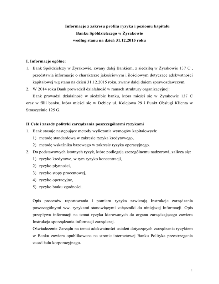 Informacje z zakresu profilu ryzyka i poziomu kapitału Banku Spółdzielczego w Żyrakowie według stanu na dzień 31.12.2015 roku I. Informacje ogólne: 1. Bank Spółdzielczy w Żyrakowie, zwany dalej Bankiem, z siedzibą w Żyrakowie 137 C , przedstawia informacje o charakterze jakościowym i ilościowym dotyczące adekwatności kapitałowej wg stanu na dzień 31.12.2015 roku, zwany dalej dniem sprawozdawczym. 2. W 2014 roku Bank prowadził działalność w ramach struktury organizacyjnej: Bank prowadzi działalność w siedzibie banku, która mieści się w Żyrakowie 137 C oraz w filii banku, która mieści się w Dębicy ul. Kolejowa 29 i Punkt Obsługi Klienta w Straszęcinie 125 G. II Cele i zasady polityki zarządzania poszczególnymi ryzykami 1. Bank stosuje następujące metody wyliczania wymogów kapitałowych: 1) metodę standardową w zakresie ryzyka kredytowego, 2) metodę wskaźnika bazowego w zakresie ryzyka operacyjnego. 2. Do podstawowych istotnych ryzyk, które podlegają szczególnemu nadzorowi, zalicza się: 1) ryzyko kredytowe, w tym ryzyko koncentracji, 2) ryzyko płynności, 3) ryzyko stopy procentowej, 4) ryzyko operacyjne, 5) ryzyko braku zgodności. Opis procesów raportowania i pomiaru ryzyka zawierają Instrukcje zarządzania poszczególnymi ww. ryzykami stanowiącymi załączniki do niniejszej Informacji. Opis przepływu informacji na temat ryzyka kierowanych do organu zarządzającego zawiera Instrukcja sporządzania informacji zarządczej. Oświadczenie Zarządu na temat adekwatności ustaleń dotyczących zarządzania ryzykiem w Banku zawiera opublikowana na stronie internetowej Banku Polityka przestrzegania zasad ładu korporacyjnego. 1 W Banku funkcjonuje Strategia zarządzania poszczególnymi rodzajami ryzyka, która stanowi załącznik do niniejszej informacji. Ponadto w ramach Założeń do planu ekonomiczno-finansowego w Banku funkcjonują polityki w zakresie zarządzania następującymi rodzajami ryzyka: 1) Polityka kredytowa 2) Polityka płynności 3) Polityka zarządzania ryzykiem stopy procentowej 4) Polityka w zakresie ryzyka operacyjnego 5) Polityka zgodności 6) Polityka kapitałowa 7) Polityka bezpieczeństwa informacji Które stanowią załączniki do niniejszej informacji. 3. W strukturze organizacyjnej Banku funkcjonuje Samodzielne stanowisko ds. analiz i zarządzania ryzykami, który na dzień sprawozdawczy roku obejmował swoim zakresem monitorowanie poszczególnych rodzajów ryzyk oraz adekwatności kapitałowej. Informacje na temat metod, procesów, technik redukcji ryzyka zawierają załączniki do niniejszej Informacji. 4. W Banku nie powołano Komitetu ds. ryzyk. III. Fundusze własne 1. Poniższe zestawienie przedstawia poziom poszczególnych pozycji funduszy własnych Banku według stanu na dzień 31.12.2015 roku. stan na Stan na 31.12.2015r. 31.12.2014r. 8 342 916 7 660 095 W tym Fundusz udziałowy 192 906 193 085 Pomniejszenia kapitału Tier I 41 354 43 580 8 150 010 7 616 598 Kapitał Tier II bez pomniejszeń 0 0 Pomniejszenia Kapitału Tier II 0 0 Kapitał Tier II po korektach 0 0 Rodzaj funduszu Kapitał Tier I bez pomniejszeń Kapitał Tier I po korektach 2 Razem fundusze własne (suma kapitału Tier I i Tier II z uwzględnieniem korekt) Łączny wskaźnik kapitałowy 8 281 562 7 616 515 20,14% 20,09% Szczegółowe pozycje kapitału zawiera załącznik do niniejszej informacji opracowany na podstawie załącznika nr 6 do Rozporządzenia 1423/2013 Parlamentu Europejskiego z dnia 20 grudnia 2013r. 3. Bank nie dokonywał sekurytyzacji aktywów. IV Adekwatność kapitałowa 1. Metody wyliczania ekspozycji na ryzyko oraz wymogów kapitałowych minimalnych i wewnętrznych zawiera „Procedura szacowania kapitału wewnętrznego i adekwatności kapitałowej” stanowiąca załącznik do niniejszej Informacji. 2. Poniższa tabela przedstawia kwoty stanowiące 8% ekspozycji ważonej ryzykiem dla każdej z kategorii ekspozycji. Stan na dzień Wyszczególnienie Lp. 31.12.2015 r. w zł 1. Ekspozycje wobec rządów centralnych lub banków centralnych 2. Ekspozycje wobec samorządów regionalnych lub władz lokalnych 83 83 877 3. Ekspozycje wobec podmiotów sektora publicznego 4. Ekspozycje wobec instytucji 5. Ekspozycje wobec przedsiębiorstw 518 296 6. Ekspozycje detaliczne 252 393 7. Ekspozycje 0 251 860 zabezpieczone hipotekami na nieruchomościach 8. Ekspozycje, których dotyczy niewykonanie zobowiązania 9. Ekspozycje z tytułu jednostek uczestnictwa lub udziałów w instytucjach zbiorowego inwestowania 1 552 748 48 311 0 3 10. Ekspozycje kapitałowe 42 708 11. Inne ekspozycje 84 529 12. Ekspozycje pozabilansowe 68 390 RAZEM 2 903 195 3. Poniższe zestawienie przedstawia poziom minimalnych wymogów kapitałowych na poszczególne rodzaje ryzyka: Wyszczególnienie Lp. Kwota 1. ryzyko kredytowe 2 906 195 2. ryzyko rynkowe (walutowe) 0 3. przekroczenie limitu dużych ekspozycji 0 4. przekroczenie progu koncentracji zaangażowań w podmioty 0 spoza sektora finansowego 5. ryzyko operacyjne 386 000 RAZEM 3 289 195 4. Poniższe zestawienie przedstawia poziom wewnętrznych wymogów kapitałowych na poszczególne rodzaje ryzyka. Wyszczególnienie Kwota 1. ryzyko płynności 0 2. ryzyko stopy procentowej w księdze bankowej 0 3. ryzyko koncentracji zaangażowań 0 4. ryzyko kapitałowe 0 RAZEM 0 V. Ryzyko kredytowe 1. Według stanu na dzień sprawozdawczy Bank stosował definicje należności przeterminowanych, zagrożonych oraz metody ustalania korekt wartości i rezerw w oparciu o zapisy Rozporządzenia Ministra Finansów w sprawie klasyfikacji ekspozycji kredytowych oraz tworzenia rezerw na ryzyko kredytowe. 4 2. Bank w swoich analizach nie uwzględnia ryzyka geograficznego, ponieważ Bank funkcjonuje na terenie jednego obszaru geograficznego, określonego w Statucie Banku, zatwierdzonego przez Komisję Nadzoru Finansowego. 3. Ekspozycje kredytowe według wyceny bilansowej (po korektach rachunkowych) na dzień sprawozdawczy, bez uwzględn
