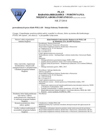 Załącznik nr 1 do Procedury KPLB NR -1 wyd. 6 z dnia 06.12.2013 r. PLAN BADANIA BIEGŁOŚCI / PORÓWNANIA MIĘDZYLABORATORYJNEGO (niepotrzebne skreślić) NR 27/2014 (wpisuje Sekretariat POLLAB) prowadzonych przez Klub POLLAB – Sekcję Ochrony Środowiska Uwaga: Uzupełniając poniższą tabelę należy wypełnić te obszary, które są istotne dla konkretnego PT/ILC lub wpisać „nie dotyczy” w przypadku wyłączenia. Nazwa i adres organizatora badania biegłości Imię i nazwisko, organizacja koordynatora i innych osób zaangażowanych w projektowanie i działanie programu badania biegłości Działania, które będą podzlecane oraz nazwy i adresy podwykonawców włączonych w realizację programu badania biegłości Kryteria uczestnictwa, które należy spełnić Liczba i rodzaj oczekiwanych uczestników programu badania biegłości Klub Polskich Laboratoriów Badawczych POLLAB ul. Kłobucka 23A; 02-699 Warszawa Koordynator: Dariusz Piotrowski Kierownik Pracowni Terenowej w Rzeszowie Wojewódzki Inspektorat Ochrony Środowiska w Rzeszowie ul. Langiewicza 26, 35-101 Rzeszów tel.: (17) 854-36-83 fax: (17) 850-53-77 e-mail: [email protected] Wykształcenie wyższe – hydrogeologia i ochrona środowiska, Uniwersytet Śląski, 2001 Szkolenia: − Obsługa pyłomierza grawimetrycznego, EMIO, 2007 − Aspekty prawne pomiarów emisji, CE2 Centrum Edukacji, 2011 − Pomiary emisji do powietrza – kompetencje techniczne, CE2 Centrum Edukacji, 2012 − Obsługa analizatora gazów, MRU, 2013 Weryfikator: Jadwiga Jakubowska Główny specjalista Wojewódzki Inspektorat Ochrony Środowiska w Rzeszowie ul. Langiewicza 26, 35-101 Rzeszów tel.: (16) 678-44-96 fax: (17) 850-53-77 e-mail: [email protected] Wykształcenie wyższe – chemia spożywcza, Politechnika Łódzka, 1983 Szkolenia: − Oznaczanie zanieczyszczeń metodą spektrometrycznej absorpcji atomowej, WIOŚ w Piotrkowie Trybunalskim, 1995 − Techniki instrumentalne w analizie chemicznej, AVI-LAB ,1997 − Międzylaboratoryjne badania biegłości i sterowanie jakością, PROLAB, 2008 − Ważenie – teoria i praktyka, RADWAG, 2008 Nie dotyczy Członkostwo w Klubie POLLAB Badania powinny być wykonane metodami akredytowanymi lub zgłoszonymi do akredytacji 2 laboratoria wykonujące rutynowo pomiary emisji zanieczyszczeń do powietrza: Wojewódzki Inspektorat Ochrony Środowiska w Rzeszowie, Laboratorium AB 447 Wojewódzki Inspektorat Ochrony Środowiska w Warszawie, Laboratorium AB 322 Strona 1 z 3 Załącznik nr 1 do Procedury KPLB NR -1 wyd. 6 z dnia 06.12.2013 r. Wybór wielkości mierzonej (-ych) lub właściwości objętych badaniem biegłości, łącznie z informacją co uczestnicy mają identyfikować, mierzyć lub badać Opis zakresu wartości lub właściwości, lub obydwu, spodziewanych dla obiektów badania biegłości Potencjalne główne źródła błędów występujących w odniesieniu do badania biegłości Wymagania dotyczące wytwarzania, nadzorowania jakości, magazynowania i dystrybucji obiektów badania biegłości Racjonalne środki zapobiegawcze w celu zapobieżenia zmowie pomiędzy uczestnikami lub fałszowaniu wyników oraz procedury, które będą uruchomione jeżeli mieć będzie miejsce podejrzenie zmowy lub fałszowania wyników. Opis informacji, którą należy dostarczyć uczestnikom oraz harmonogram realizacji kolejnych etapów programu Częstość lub daty dystrybucji obiektów badań biegłości do uczestników, ostateczne terminy przekazania wyników przez uczestników i, jeżeli zasadne, daty, kiedy uczestnicy powinni wykonać badania lub pomiary Wszelkie informacje dotyczące metod lub procedur, potrzebne uczestnikom do przygotowania materiału do badań i przeprowadzenia badań lub pomiarów Obiekt badań: gazy odlotowe pochodzące z procesu spalania węgla kamiennego Miejsce pomiarów: Fenice Poland Sp. z o.o ul. Hetmańska 120 35-078 Rzeszów Zakres badań: − pobieranie próbek pyłu, − stężenie pyłu, − stężenia metali w pyle (Cd, Pb) − strumień objętości gazu, − stężenie SO2, − stężenie NOx, − stężenie CO, − stężenie CO2, − stężenie O2 Pobieranie próbek i pomiary in situ powinny być wykonane równocześnie przez uczestników ILC i w powtórzeniu. Spodziewane są wartości stężeń zanieczyszczeń mniejsze od standardów emisyjnych Niestabilność parametrów stanu (temperatury, przepływu) i składu chemicznego gazu w przewodzie – minimalizowanie błędów poprzez wybór miejsca i lokalizacji punktów pobierania próbek zgodnie z normą Problemy w pracy urządzeń oczyszczających gazy odlotowe, duża zmienność procesu technologicznego – brak możliwości minimalizacji błędów Nie dotyczy Źródłowe dane pomiarowe uzyskane w trakcie pobierania próbek i pomiarów in situ są automatycznie rejestrowane w pamięci analizatorów i nie ma możliwości ich zmiany. Ponadto laboratorium akredytowane powinno mieć procedury zapobiegające dokonywaniu zmian w zapisach przechowywanych elektroniczne i zachowywać zapisy źródłowe przez ustalony czas. W przypadku podejrzenia zmowy lub fałszowania wyników, koordynator wystąpi do kierowników laboratoriów uczestniczących w porównaniu z wnioskiem o przegląd zapisów technicznych i ocenę prawidłowości działań. Jeśli podejrzenie będzie uzasadnione, koordynator powiadomi o tym fakcie organizatora i wyniki porównania zostaną unieważnione. Koordynator co najmniej tydzień przed planowanym porównaniem przekaże uczestnikom następujące dokumenty: − Plan porównania międzylaboratoryjnego − Formularz wyników badań do raportowania końcowych wyników oraz dane kontaktowe Sprawozdanie z porównania zostanie opracowane i przekazane organizatorowi w ciągu 3 tygodni od przekazania wyników przez uczestników porównania. Po akceptacji sprawozdania przez organizatora koordynator przekaże je uczestnikom wraz ze świadectwem uczestnictwa zawierającym numer kodowy uczestnika Termin porównania