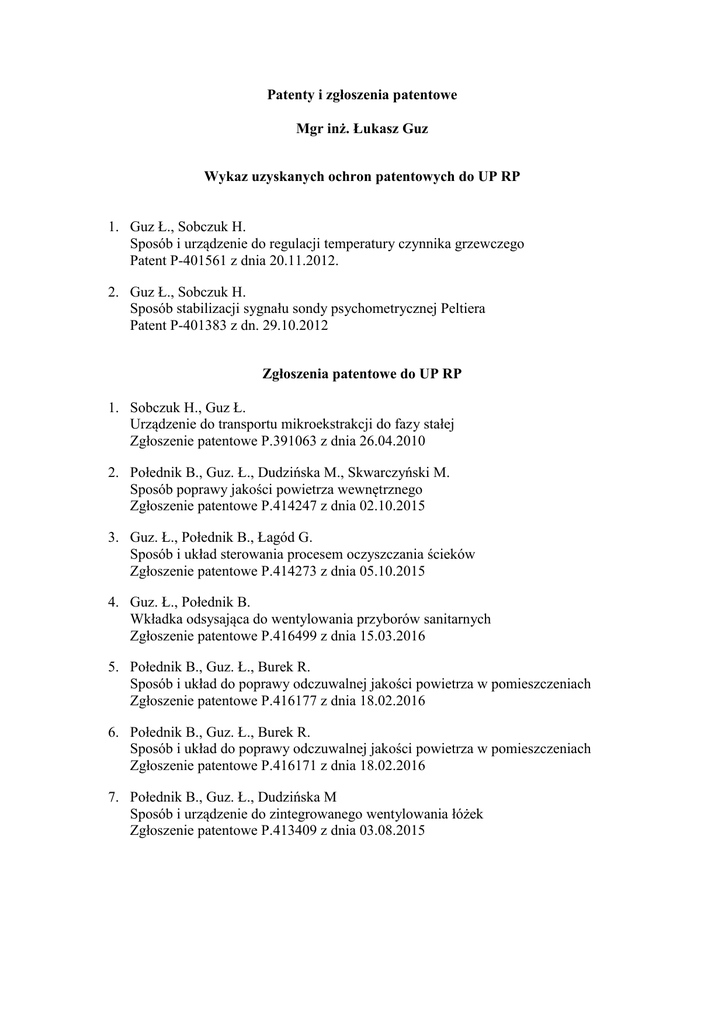 Patenty i zgłoszenia patentowe Mgr inż. Łukasz Guz Wykaz