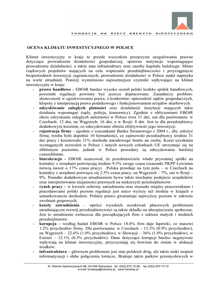 OCENA KLIMATU INWESTYCYJNEGO W POLSCE Klimat inwestycyjny w kraju to przede wszystkim przejrzyste uregulowania prawne dotyczące prowadzenia działalności gospodarczej, sprawne instytucje wspomagające prowadzenie działalności, a także stan infrastruktury oraz zasoby kapitału ludzkiego. Mimo rządowych projektów mających na celu wspieranie przedsiębiorczości i przyciągnięcie bezpośrednich inwestycji zagranicznych, prowadzenie działalności w Polsce nadal napotyka na wiele utrudnień. Poniżej wymieniono najważniejsze czynniki wpływające na klimat inwestycyjny w kraju: - prawo handlowe - EBOiR bardzo wysoko ocenił polski kodeks spółek handlowych, pozostałe regulacje powinny być jeszcze dopracowane. Zasadniczy problem: skuteczność w egzekwowaniu prawa, a konkretnie: opieszałość sądów gospodarczych, kłopoty z interpretacją prawa podatkowego i funkcjonowaniem urzędów skarbowych. - odzyskiwanie zaległych płatności oraz działalność instytucji mających takie działania wspomagać (sądy, policja, komornicy). Zgodnie z obliczeniami EBOiR okres odzyskania zaległych należności w Polsce trwa 31 dni, zaś dla porównania: w Czechach: 12 dni, na Węgrzech: 16 dni, a w Rosji: 8 dni. Jest to dla przedsiębiorcy dodatkowym kosztem, co zdecydowanie obniża efektywność jego inwestycji. - rejestracja firmy - zgodnie z szacunkami Banku Światowego z 2004 r., aby założyć firmę, trzeba było dopełnić 10 formalności, co zajmowało przedsiębiorcy średnio 31 dni pracy i kosztowało 21% dochodu narodowego brutto na osobę. Koszt uzyskania wymaganych zezwoleń w Polsce i innych nowych członkach UE utrzymuje się na zbliżonym poziomie, jednak w Polsce procedury są zdecydowanie bardziej czasochłonne. - biurokracja - EBOiR oszacował, że przedstawiciele władz prywatnej spółki na kontakty z urzędami poświęcają średnio 9.5% swego czasu (szacunki PKPP Lewiatan mówią nawet o 17% czasu pracy) . Polska przoduje na tym polu – w Czechach na kontakty z urzędami poświęca się 2.5% czasu pracy, na Węgrzech – 7%, zaś w Rosji – 9%. Ponadto dodatkowym utrudnieniem bywa także niechętne podejście urzędników oraz interpretowanie niejasności prawnych na niekorzyść przedsiębiorców. - rynek pracy – w kwestii ochrony zatrudnienia oraz stosunki między pracownikami i pracodawcami polski poziom regulacji jest nieco wyższy niż średnia w krajach o umiarkowanym dochodzie. Polskie prawo gwarantuje najwyższy poziom w zakresie zwolnień grupowych. - koszty zatrudnienia – oprócz wysokich oczekiwań płacowych problemem utrudniającym rozwój przedsiębiorczości są także składki na ubezpieczenie społeczne. Jest to utrudnienie zwłaszcza dla początkujących firm z sektora małych i średnich przedsiębiorstw. - korupcja – według badań EBOiR w Polsce 18.6% firm daje łapówki, co stanowi 1.2% przychodów firmy. Dla porównania: w Czechach – 13.3% (0.9% przychodów), na Węgrzech – 22.6% (1.0% przychodów), w Słowacji – 36% (1.0% przychodów), w Estonii – 12.1% (0.3% przychodów). Dane dotyczące korupcji bardzo negatywnie wpływają na klimat inwestycyjny, przyczyniają się bowiem do zmian w alokacji środków. - infrastruktura – głównym problemem jest stan polskich dróg, ale także niski stopień informatyzacji i słabe połączenia lotnicze. Brakuje także parków przemysłowych w Al. Stanów Zjednoczonych 68, 04-036 Warszawa, tel. (022) 870 73 60, fax (022) 870 73 72 e-mail: [email protected], www.fukrehip.pl - - - regionach o najwyższej stopie bezrobocia. Problemy infrastrukturalne mają tym większą wagę, że umniejszają skalę jednej z większych zalet polskiego rynku, którym jest jego centralne położenie. ochrona praw własności intelektualnej – obowiązujące w Polsce prawo odpowiada standardom międzynarodowym, jednak jego jakość jest nienajlepsza, jest ono bowiem zbyt skomplikowane i obejmuje zbyt wiele obszarów. Ponadto problemem jest kwesta wprowadzania obowiązującego prawa w życie. kapitał ludzki – inwestorzy na ogół chwalą sobie kwalifikacje i motywację do pracy polskich pracowników. Docenia się dobre zrozumienie rynku przez polskich partnerów, jak również dobór odpowiednich partnerów w biznesie. Inwestorzy zauważają, że koszty zatrudnienia w Polsce są niższe niż w Europie Zachodniej, ale wyższe w porównaniu do innych państw regionu. sytuacja ekonomiczna – bodźcem do inwestowania jest stabilny wzrost gospodarczy, niska inflacja oraz niskie podatki dla firm. www.case.com.pl/dym\n/servFile.php?plik_id=82089&nlang=19 www.mnii.gov.pl Al. Stanów Zjednoczonych 68, 04-036 Warszawa, tel. (022) 870 73 60, fax (022) 870 73 72 e-mail: [email protected], www.fukrehip.pl