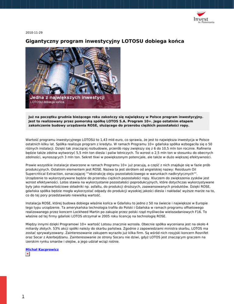 2010-11-29 Gigantyczny program inwestycyjny LOTOSU dobiega końca Już na początku grudnia bieżącego roku zakończy się największy w Polsce program inwestycyjny. Jest to realizowany przez pomorską spółkę LOTOS S.A. Program 10+. Jego ostatnim etapem zakończenie budowy urządzenia ROSE, służącego do przerobu ciężkich pozostałości ropy. Wartość programu inwestycyjnego LOTOSU to 1,43 mld euro, co sprawia, że jest to największa inwestycja w Polsce ostatnich kilku lat. Spółka realizuje program z kredytu. W ramach Programu 10+ gdańska spółka wzbogaciła się o 50 różnych instalacji. Dzięki tak znaczącej rozbudowie, przerób ropy zwiększy się z 6 do 10,5 mln ton rocznie. Rafineria będzie także zdolna wytworzyć 5,5 mln ton diesla i paliw lotniczych. To wzrost o 2,5 mln ton w stosunku do obecnych zdolności, wynoszących 3 mln ton. Sekret tkwi w powiększonym potencjale, ale także w dużo większej efektywności. Prawie wszystkie instalacje stworzone w ramach Programu 10+ już pracują, a część z nich znajduje się w fazie prób produkcyjnych. Ostatnim elementem jest ROSE. Nazwa ta jest skrótem od angielskiej nazwy: Residuum Oil Supercritical Extraction, oznaczającej ""ekstrakcję oleju pozostałościowego w warunkach nadkrytycznych"". Urządzenie to wykorzystywane będzie do przerobu ciężkich pozostałości ropy. Kluczem do zwiększenia zysków jest wzrost efektywności. Lotos stawia na wykorzystanie pozostałości poprodukcyjnych, które dotychczas wykorzystywane były jako małowartościowe składniki np. asfaltu, do produkcji droższych, zaawansowanych produktów. Dzięki ROSE, gdańska spółka będzie mogła wykorzystać odpady do produkcji wysokiej jakości diesla i nakładać wyższe marże na to, co do tej pory przedstawiało niewielką wartość. Instalacja ROSE, której budowa dobiega właśnie końca w Gdańsku to jedno z 50 na świecie i największe w Europie tego typu urządzenie. Ta amerykańska technologia trafiła do Polski i Gdańska w ramach programu offsetowego realizowanego przez koncern Lockheed Martin po zakupie przez polski rząd myśliwców wielozadaniowych F16. To właśnie od tej firmy gdański LOTOS otrzymał w 2005 roku licencję na technologię ROSE. Między innymi dzięki Programowi 10+ wartość Lotosu znacznie wzrosła. Obecnie spółka wyceniana jest na około 4 miliardy złotych. 53% akcji spółki należy do skarbu państwa. Zgodnie z zapowiedziami ministra skarbu, LOTOS ma zostać sprywatyzowany. Zainteresowanie zakupem wyraziło już kilka firm. Są wśród nich rosyjski koncern Rosnifet oraz Socar z Azerbejdżanu. Zainteresowanie ze strony Socaru nie dziwi, gdyż LOTOS jest znaczącym graczem na izerskim rynku smarów i olejów, a jego udział wciąż rośnie. Michał Kacprowicz 1 Autor MK 2