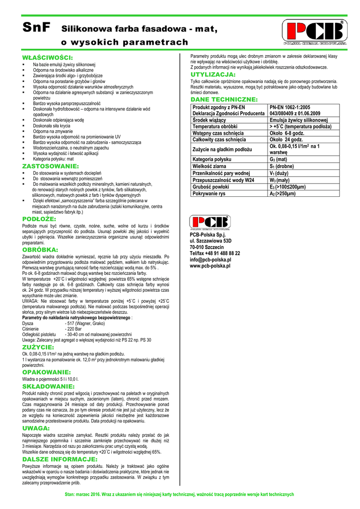SnF Silikonowa farba fasadowa - mat, o wysokich parametrach WŁAŚCIWOŚCI: Na bazie emulsji żywicy silikonowej Odporna na środowisko alkaliczne Zawierająca środki algo- i grzybobójcze Odporna na porastanie grzybów i glonów Wysoka odporność działanie warunków atmosferycznych Odporna na działanie agresywnych substancji w zanieczyszczonym powietrzu Bardzo wysoka paroprzepuszczalność Doskonała hydrofobowość – odporna na intensywne działanie wód opadowych Doskonale odpierająca wodę Doskonała siła krycia Odporna na zmywanie Bardzo wysoka odporność na promieniowanie UV Bardzo wysoka odporność na zabrudzenia - samoczyszcząca Wodorozcieńczalna, o neutralnym zapachu Wysoka wydajność i łatwość aplikacji Kategoria połysku: mat ZASTOSOWANIE: Do stosowania w systemach dociepleń Do stosowania wewnątrz pomieszczeń Do malowania wszelkich podłoży mineralnych, kamieni naturalnych, do renowacji starych nośnych powłok z tynków, farb silikatowych, silikonowych, matowych powłok z farb i tynków dyspersyjnych Dzięki efektowi „samoczyszczenia” farba szczególnie polecana w miejscach narażonych na duże zabrudzenia (szlaki komunikacyjne, centra miast, sąsiedztwo fabryk itp.) Parametry produktu mogą ulec drobnym zmianom w zakresie deklarowanej klasy nie wpływając na właściwości użytkowe i obróbkę. Z podanych informacji nie wynikają jakiekolwiek roszczenia odszkodowawcze. UTYLIZACJA: Tylko całkowicie opróżnione opakowania nadają się do ponownego przetworzenia. Resztki materiału, wysuszone, mogą być potraktowane jako odpady budowlane lub śmieci domowe. DANE TECHNICZNE: Produkt zgodny z PN-EN Deklaracja Zgodności Producenta Środek wiążący Temperatura obróbki Wstępny czas schnięcia Całkowity czas schnięcia Zużycie na gładkim podłożu Kategoria połysku Wielkość ziarna Przenikalność pary wodnej Przepuszczalność wody W24 Grubość powłoki Pokrywanie rys PN-EN 1062-1:2005 043/080409 z 01.06.2009 Emulsja żywicy silikonowej > +5˚C (temperatura podłoża) Około 6-8 godz. Około 24 godz. Ok. 0,08-0,15 l/1m2 na 1 warstwę G3 (mat) S1 (drobne) V1 (duży) W3 (mały) E3 (>100≤200µm) A2 (>250µm) PODŁOŻE: Podłoże musi być równe, czyste, nośne, suche, wolne od kurzu i środków separujących przyczepność do podłoża. Usunąć powłoki złej jakości i wypełnić ubytki i pęknięcia. Wszelkie zanieczyszczenia organiczne usunąć odpowiednimi preparatami. OBRÓBKA: Zawartość wiadra dokładnie wymieszać, ręcznie lub przy użyciu mieszadła. Po odpowiednim przygotowaniu podłoża malować pędzlem, wałkiem lub natryskując. Pierwszą warstwę gruntującą nanosić farbę rozcieńczając wodą max. do 5% . Po ok. 6-8 godzinach malować drugą warstwę bez rozcieńczania farby. W temperaturze +20˚C i wilgotności względnej powietrza 65% wstępne schnięcie farby następuje po ok. 6-8 godzinach. Całkowity czas schnięcia farby wynosi ok. 24 godz. W przypadku niższej temperatury i wyższej wilgotności powietrza czas wysychanie może ulec zmianie. UWAGA: Nie stosować farby w temperaturze poniżej +5˚C i powyżej +25˚C (temperatura malowanego podłoża). Nie malować podczas bezpośredniej operacji słońca, przy silnym wietrze lub niebezpieczeństwie deszczu. Parametry do nakładania natryskowego bezpowietrznego : Dysza - 517 (Wagner, Grako) Ciśnienie - 220 Bar Odległość pistoletu - 30-40 cm od malowanej powierzchni Uwaga: Zalecany jest agregat o większej wydajności niż PS 22 np. PS 30 PCB-Polska Sp.j. ul. Szczawiowa 53D 70-010 Szczecin Tel/fax +48 91 488 88 22 [email protected] www.pcb-polska.pl ZUŻYCIE: Ok. 0,08-0,15 l/1m2 na jedną warstwę na gładkim podłożu. 1 l wystarcza na pomalowanie ok. 12,0 m2 przy jednokrotnym malowaniu gładkiej powierzchni. OPAKOWANIE: Wiadra o pojemności 5 l i 10,0 l. SKŁADOWANIE: Produkt należy chronić przed wilgocią i przechowywać na paletach w oryginalnych opakowaniach w miejscu suchym, zacienionym (latem), chronić przed mrozem. Czas magazynowania 24 miesiące od daty produkcji. Przechowywanie ponad podany czas nie oznacza, że po tym okresie produkt nie jest już użyteczny, lecz że ze względu na konieczność zapewnienia jakości niezbędne jest każdorazowe samodzielne przetestowanie produktu. Data produkcji na opakowaniu. UWAGA: Napoczęte wiadra szczelnie zamykać. Resztki produktu należy przelać do jak najmniejszego pojemnika i szczelnie zamknięte przechowywać nie dłużej niż 3 miesiące. Narzędzia od razu po zakończeniu prac umyć czystą wodą. Wszelkie dane odnoszą się do temperatury +20C i wilgotności względnej 65%. DALSZE INFORMACJE: Powyższe informacje są opisem produktu. Należy je traktować jako ogólne wskazówki w oparciu o nasze badania i doświadczenia praktyczne, które jednak nie uwzględniają wymogów konkretnego przypadku zastosowania. W związku z tym zalecamy przeprowadzenie prób. Stan: marzec 2016. Wraz z ukazaniem się niniejszej karty technicznej, ważność tracą poprzednie wersje kart technicznych