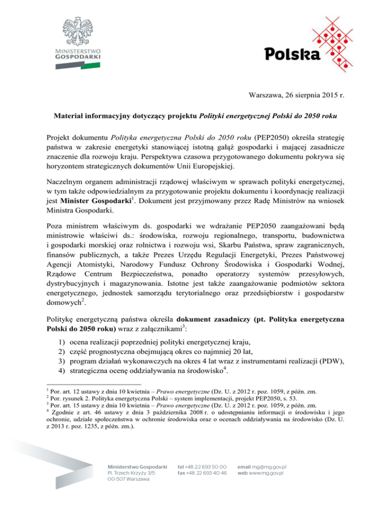 Warszawa, 26 sierpnia 2015 r. Materiał informacyjny dotyczący projektu Polityki energetycznej Polski do 2050 roku Projekt dokumentu Polityka energetyczna Polski do 2050 roku (PEP2050) określa strategię państwa w zakresie energetyki stanowiącej istotną gałąź gospodarki i mającej zasadnicze znaczenie dla rozwoju kraju. Perspektywa czasowa przygotowanego dokumentu pokrywa się horyzontem strategicznych dokumentów Unii Europejskiej. Naczelnym organem administracji rządowej właściwym w sprawach polityki energetycznej, w tym także odpowiedzialnym za przygotowanie projektu dokumentu i koordynację realizacji jest Minister Gospodarki1. Dokument jest przyjmowany przez Radę Ministrów na wniosek Ministra Gospodarki. Poza ministrem właściwym ds. gospodarki we wdrażanie PEP2050 zaangażowani będą ministrowie właściwi ds.: środowiska, rozwoju regionalnego, transportu, budownictwa i gospodarki morskiej oraz rolnictwa i rozwoju wsi, Skarbu Państwa, spraw zagranicznych, finansów publicznych, a także Prezes Urzędu Regulacji Energetyki, Prezes Państwowej Agencji Atomistyki, Narodowy Fundusz Ochrony Środowiska i Gospodarki Wodnej, Rządowe Centrum Bezpieczeństwa, ponadto operatorzy systemów przesyłowych, dystrybucyjnych i magazynowania. Istotne jest także zaangażowanie podmiotów sektora energetycznego, jednostek samorządu terytorialnego oraz przedsiębiorstw i gospodarstw domowych2. Politykę energetyczną państwa określa dokument zasadniczy (pt. Polityka energetyczna Polski do 2050 roku) wraz z załącznikami3: 1) 2) 3) 4) 1 ocena realizacji poprzedniej polityki energetycznej kraju, część prognostyczna obejmującą okres co najmniej 20 lat, program działań wykonawczych na okres 4 lat wraz z instrumentami realizacji (PDW), strategiczna ocenę oddziaływania na środowisko4. Por. art. 12 ustawy z dnia 10 kwietnia – Prawo energetyczne (Dz. U. z 2012 r. poz. 1059, z późn. zm. Por. rysunek 2. Polityka energetyczna Polski – system implementacji, projekt PEP2050, s. 53. 3 Por. art. 15 ustawy z dnia 10 kwietnia – Prawo energetyczne (Dz. U. z 2012 r. poz. 1059, z późn. zm. 4 Zgodnie z art. 46 ustawy z dnia 3 października 2008 r. o udostępnianiu informacji o środowisku i jego ochronie, udziale społeczeństwa w ochronie środowiska oraz o ocenach oddziaływania na środowisko (Dz. U. z 2013 r. poz. 1235, z późn. zm.). 2 Celem głównym polityki energetycznej kraju jest tworzenie warunków dla stałego i zrównoważonego rozwoju sektora energetycznego, przyczyniającego się do rozwoju gospodarki narodowej, zapewnienia bezpieczeństwa energetycznego państwa oraz zaspokojenia potrzeb energetycznych przedsiębiorstw i gospodarstw domowych. Realizacji celu głównego mają służyć trzy równoważne cele operacyjne: (I) zapewnienie bezpieczeństwa energetycznego kraju, (II) zwiększenie konkurencyjności i efektywności energetycznej gospodarki narodowej w ramach wewnętrznego rynku energii UE, oraz (III) ograniczenie oddziaływania energetyki na środowisko. Celom operacyjnym przyporządkowano po 3 obszary interwencji5. Szczegółowe działania służące realizacji tych celów w perspektywie 4 lat zostały rozpisane w tym układzie na ponad 180 działań wykonawczych. Ich spis ze wskazaniem terminu realizacji, zakresu odpowiedzialności oraz zasadności realizacji stanowi załącznik 3 do PEP2050 – Program działań wykonawczych na lata 2015-2018 (PDW). Polityka energetyczna Polski do 2050 roku wskazuje również kierunki restrukturyzacji i przekształceń własnościowych mających na celu zapewnienie bezpieczeństwa energetycznego kraju, a także kierunki prac naukowo-badawczych w celu tworzenia zaplecza rozwoju technologii energetycznych oraz kierunki współpracy międzynarodowej w zakresie energetyki. Wyznaczono także projekty priorytetowe mające szczególne znaczenie dla implementacji polityki energetycznej kraju: (1) efektywne zagospodarowanie rodzimych zasobów paliw stałych, (2) poprawa efektywności energetycznej, w tym rozwój kogeneracji, (3) wprowadzenie energetyki jądrowej, (4) wykorzystanie potencjału gazu ze złóż niekonwencjonalnych, (5) rozwój energetyki odnawialnej, (6) rozwój energetyki prosumenckiej, (7) rozwój inteligentnych sieci energetycznych, (8) rozwój połączeń transgranicznych, (9) zapewnienie warunków rozwoju infrastruktury wytwórczej6. W dokumencie scharakteryzowano obecny stan sektora energetycznego, zawarto ocenę sytuacji oraz wnioski. Wskazano również uwarunkowania wewnętrzne, międzynarodowe i ponadnarodowe, które wpływają lub mogą wpłynąć na kształt sektora energetycznego. W PEP2050 przedstawiono 3 scenariusze rozwoju sektora energetycznego – wiodący oraz dwa alternatywne, o charakterze analitycznym. Wszystkie zakładają rozwój sieci energetycznych, w tym sieci inteligentnych, rozbudowę połączeń międzysystemowych, wsparcie dla odnawialnych źródeł energii do 2035 r., realizację Polskiego programu energetyki jądrowej (PPEJ), zwiększanie efektywności energetycznej w gospodarce, a także szereg zmian na rynku energii elektrycznej, szczególnie dotyczące odbiorców energii. W dokumencie przyjęto, że polityka energetyczna Polski będzie realizowana wg tzw. scenariusza zrównoważonego, który przewiduje, że w 2050 r. bilans energetyczny Polski będzie zbliżony do tego, który ukształtuje się ok. 2035 r. (w wyniku realizacji podjętych już 5 6 Por. rysunek 1. Architektura celów polityki energetycznej, projekt PEP2050, s. 7. Por. rysunek 1. Architektura… oraz pkt. 2.3. projektu PEP2050, s. 7, 11-15. str. 2 działań lub decyzji oraz kontynuacji dotychczasowych trendów zmian w bilansie). Zakłada się zachowanie znaczącej, choć ograniczonej w stosunku do stanu obecnego, roli węgla i ropy naftowej oraz umiarkowany wzrost znaczenia gazu ziemnego, zwiększenie udziału energii ze źródeł odnawialnych (w wyniku realizacji wynikających z przepisów unijnych) i włączenia