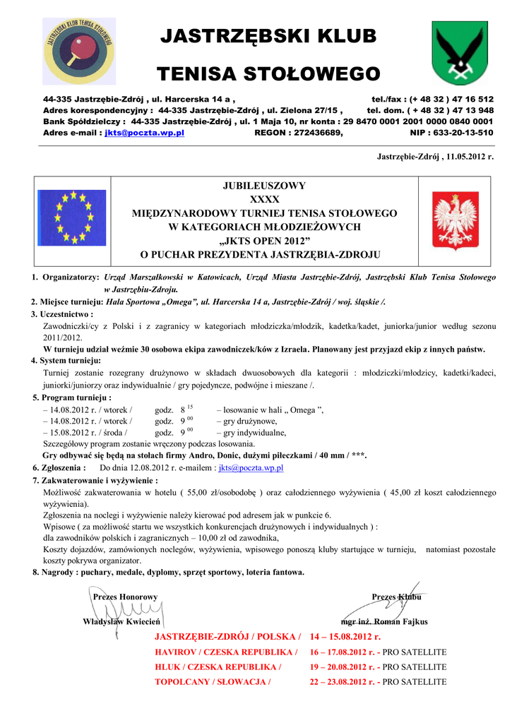 JASTRZĘBSKI KLUB TENISA STOŁOWEGO 44-335 Jastrzębie-Zdrój , ul. Harcerska 14 a , tel./fax : (+ 48 32 ) 47 16 512 Adres korespondencyjny : 44-335 Jastrzębie-Zdrój , ul. Zielona 27/15 , tel. dom. ( + 48 32 ) 47 13 948 Bank Spółdzielczy : 44-335 Jastrzębie-Zdrój , ul. 1 Maja 10, nr konta : 29 8470 0001 2001 0000 0840 0001 Adres e-mail : [email protected] REGON : 272436689, NIP : 633-20-13-510 Jastrzębie-Zdrój , 11.05.2012 r. JUBILEUSZOWY XXXX MIĘDZYNARODOWY TURNIEJ TENISA STOŁOWEGO W KATEGORIACH MŁODZIEŻOWYCH „JKTS OPEN 2012” O PUCHAR PREZYDENTA JASTRZĘBIA-ZDROJU 1. Organizatorzy: Urząd Marszałkowski w Katowicach, Urząd Miasta Jastrzębie-Zdrój, Jastrzębski Klub Tenisa Stołowego w Jastrzębiu-Zdroju. 2. Miejsce turnieju: Hala Sportowa „Omega”, ul. Harcerska 14 a, Jastrzębie-Zdrój / woj. śląskie /. 3. Uczestnictwo : Zawodniczki/cy z Polski i z zagranicy w kategoriach młodziczka/młodzik, kadetka/kadet, juniorka/junior według sezonu 2011/2012. W turnieju udział weźmie 30 osobowa ekipa zawodniczek/ków z Izraela. Planowany jest przyjazd ekip z innych państw. 4. System turnieju: Turniej zostanie rozegrany drużynowo w składach dwuosobowych dla kategorii : młodziczki/młodzicy, kadetki/kadeci, juniorki/juniorzy oraz indywidualnie / gry pojedyncze, podwójne i mieszane /. 5. Program turnieju : – 14.08.2012 r. / wtorek / godz. 8 15 – losowanie w hali „ Omega ”, – 14.08.2012 r. / wtorek / godz. 9 00 – gry drużynowe, – 15.08.2012 r. / środa / godz. 9 00 – gry indywidualne, Szczegółowy program zostanie wręczony podczas losowania. Gry odbywać się będą na stołach firmy Andro, Donic, dużymi piłeczkami / 40 mm / ***. 6. Zgłoszenia : Do dnia 12.08.2012 r. e-mailem : [email protected] 7. Zakwaterowanie i wyżywienie : Możliwość zakwaterowania w hotelu ( 55,00 zł/osobodobę ) oraz całodziennego wyżywienia ( 45,00 zł koszt całodziennego wyżywienia). Zgłoszenia na noclegi i wyżywienie należy kierować pod adresem jak w punkcie 6. Wpisowe ( za możliwość startu we wszystkich konkurencjach drużynowych i indywidualnych ) : dla zawodników polskich i zagranicznych – 10,00 zł od zawodnika, Koszty dojazdów, zamówionych noclegów, wyżywienia, wpisowego ponoszą kluby startujące w turnieju, natomiast pozostałe koszty pokrywa organizator. 8. Nagrody : puchary, medale, dyplomy, sprzęt sportowy, loteria fantowa. Prezes Honorowy Władysław Kwiecień Prezes Klubu mgr inż. Roman Fajkus JASTRZĘBIE-ZDRÓJ / POLSKA / 14 – 15.08.2012 r. HAVIROV / CZESKA REPUBLIKA / 16 – 17.08.2012 r. - PRO SATELLITE HLUK / CZESKA REPUBLIKA / 19 – 20.08.2012 r. - PRO SATELLITE TOPOLCANY / SŁOWACJA / 22 – 23.08.2012 r. - PRO SATELLITE