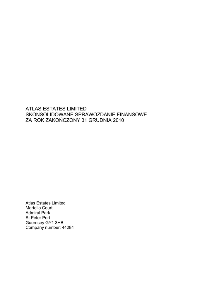 ATLAS ESTATES LIMITED SKONSOLIDOWANE SPRAWOZDANIE FINANSOWE ZA ROK ZAKOŃCZONY 31 GRUDNIA 2010 Atlas Estates Limited Martello Court Admiral Park St Peter Port Guernsey GY1 3HB Company number: 44284 ATLAS ESTATES LIMITED Spis treści Strona 3 Wstęp 4 Wybrane dane finansowe 5 List Przewodniczącego Rady Dyrektorów 10 Raport Zarządzającego Nieruchomościami 21 Opis Portfela Nieruchomości 23 Członkowie Rady Dyrektorów – Atlas Estates Limited 24 Członkowie Rady Dyrektorów i zespół zarządzający wyższego szczebla - Atlas Management Company Limited (Zarządzający Nieruchomościami) 25 Sprawozdanie Rady Dyrektorów 36 Raport w Sprawie Wynagrodzeń 39 Oświadczenie Rady Dyrektorów 40 Raport niezależnego biegłego rewidenta 42 Sprawozdania finansowe 48 Stosowane zasady rachunkowości 58 Noty do skonsolidowanego sprawozdania finansowego 92 Główne spółki zależne oraz spółki joint venture 2 ATLAS ESTATES LIMITED Wstęp Atlas Estates Limited („Atlas” lub „Spółka”) jest spółką inwestycyjną zamkniętą wpisaną do rejestru na wyspie Guernsey, inwestującą w nieruchomości w krajach Europy Środkowo-Wschodniej. Akcje Atlas zostały dopuszczone do obrotu na rynku Alternative Investment Market („AIM”) z dniem 1 marca 2006 r. Od 12 lutego 2008 r. akcje Spółki są również notowane na Giełdzie Papierów Wartościowych w Warszawie („GPW”). 15 października 2010 r. Rada Dyrektorów ogłosiła, że Nadzwyczajne Walne Zgromadzenie Akcjonariuszy przyjęło Uchwałę Szczególną w sprawie anulowania dopuszczenia akcji zwykłych Spółki do obrotu na rynku AIM Giełdy Papierów Wartościowych w Londynie. Spółka i jej podmioty zależne („Grupa”) prowadzi działalność inwestycyjną na rynkach nieruchomości w krajach Europy Środkowej i Wschodniej z wyłączeniem krajów byłego Związku Radzieckiego. W chwili obecnej Grupa prowadzi inwestycje w Polsce, na Węgrzech, w Rumunii oraz Bułgarii, inwestując w generujące dochód aktywa i przedsięwzięcia deweloperskie. Aktywa Spółki są zarządzane przez Atlas Management Company Limited („AMC”), spółkę powołaną w celu zarządzania portfelem nieruchomości Spółki. AMC zapewnia Spółce zespół menedżerów dysponujący doświadczeniem i dogłębną znajomością procesów inwestycyjnych na rynku nieruchomości oraz w zakresie działalności deweloperskiej. AMC posiada w szczególności ugruntowane doświadczenie w zarządzaniu działalnością inwestycyjną i deweloperską oraz nieruchomościami w krajach Europy Środkowej i Wschodniej. 3 ATLAS ESTATES LIMITED Wybrane dane finansowe Wybrane pozycje skonsolidowanego sprawozdania finansowego Przychody Zysk brutto ze sprzedaży Zmniejszenie wartości nieruchomości inwestycyjnych Strata z działalności operacyjnej Strata brutto Strata za rok Strata przypisana akcjonariuszom Jednostki Dominującej Przepływy pieniężne netto z działalności operacyjnej Przepływy pieniężne netto z działalności inwestycyjnej Przepływy pieniężne netto z działalności finansowej Zwiększenie /(zmniejszenie) stanu środków pieniężnych Aktywa trwałe Aktywa obrotowe Aktywa ogółem Zobowiązania krótkoterminowe Zobowiązania długoterminowe Zobowiązania ogółem Aktywa netto Wyemitowany kapitał zakładowy i kapitał rezerwowy przypisany akcjonariuszom Jednostki Dominującej Liczba akcji wyemitowanych Podstawowa strata na akcję (w eurocentach) Podstawowa wartość aktywów netto na akcję (EUR) Skorygowana wartość aktywów netto (w tys. EUR) (1) Skorygowana wartość aktywów netto na akcję (EUR) Rok zakończony 31 grudnia 2010 w tys. EUR Rok zakończony 31 grudnia 2009 w tys. EUR 100 763 20 472 (16 198) (7 958) (15 028) (12 453) 47 279 15 549 (35 558) (47 132) (57 023) (49 218) (12 493) (48 677) 20 652 (1 219) (20 381) (10 424) 339 12 212 1 985 (2 237) 275 290 100 363 402 125 (90 161) (185 339) (295 895) 106 230 280 558 156 151 463 300 (211 942) (118 016) (349 402) 113 898 105 736 113 166 46 852 014 46 852 014 (26,7) 2,25 (103,9) 2,42 137 942 2,94 138 360 2,95 (1) Pozycja „Skorygowana wartość aktywów netto” obejmuje zyski (pomniejszone o podatek odroczony) z tytułu wyceny nieruchomości deweloperskich stanowiących zapasy oraz gruntów w leasingu operacyjnym, które nie zostały ujęte w bilansie wg ich wartości godziwej. 4 ATLAS ESTATES LIMITED List Przewodniczącego Rady Dyrektorów Szanowni Państwo, Z przyjemnością przekazuję Państwu skonsolidowane wyniki finansowe Atlas Estates Limited („Atlas”, „Spółka”) i jej podmiotów zależnych (łącznie „Grupa”) za rok zakończony 31 grudnia 2010 r. Okres ten był bardzo wymagający dla inwestorów zaangażowanych na rynku nieruchomości w Europie Środkowo-Wschodniej, ze względu na wciąż odczuwane skutki niekorzystnej sytuacji gospodarczej na świecie. Do głównych czynników wpływających na działalność Grupy należą ograniczony dostęp do kapitału, brak znaczącej poprawy w zakresie wycen nieruchomości oraz niestabilność gospodarek w regionie Europy Środkowo-Wschodniej. Długoterminowy rozwój aktywów znajdujących się w portfelu inwestycyjnym Grupy uzależniony jest od dostępu do kapitału. Banki, które wcześniej finansowały wzrost w Europie Środkowo-Wschodniej, starają się ograniczyć swoje zaangażowanie w tym regionie w reakcji na spadające wyceny nieruchomości oraz niestabilną sytuację gospodarczą. Starają się zwłaszcza ograniczyć kredyty na pozyskanie gruntów pod zabudowę. W takiej sytuacji rynkowej Grupa przyjęła strategię defensywną, skoncentrowaną na utrzymaniu relacji z bankami, ścisłej kontroli kosztów, wybranych inwestycjach w nakłady kapitałowe oraz planowaniu i zapewnieniu realizacji projektów zgodnie z założonym harmonogramem i w ramach przyjętego budżetu. W drugim kwartale 2010 r. Atlas stał się przedmiotem oferty przejęcia ze strony Fragiolig Holdings Limited („Fragiolig”), spółki w 100% zależnej od Iz