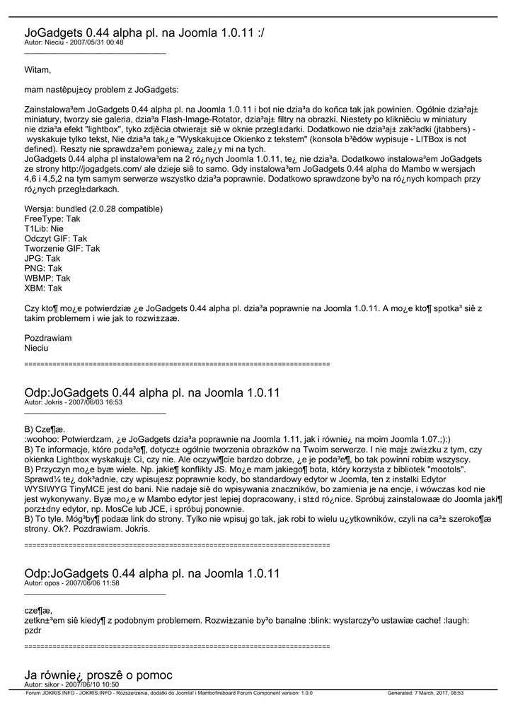 Czy kto¶ mo¿e potwierdziæ ¿e JoGadgets 0.44 alpha pl. dzia³a poprawnie na Joomla 1.0.11. A mo¿e kto¶ spotka³ siê z