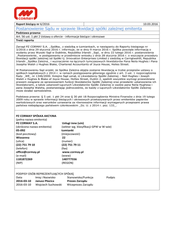 Raport bieżący nr 6/2016 10.03.2016 Postanowienie Sądu w sprawie likwidacji spółki zależnej emitenta Podstawa prawna: Art. 56 ust. 1 pkt 2 Ustawy o ofercie - informacje bieżące i okresowe Treść raportu Zarząd PZ CORMAY S.A. _Spółka_ z siedzibą w Łomiankach, w nawiązaniu do Raportu bieżącego nr 3/2016 z dnia 29 stycznia 2016 r. informuje, że w dniu 9 marca 2016 r. Spółka powzięła informację o wydaniu przez Wysoki Sąd w Dublinie, Republika Irlandii _Sąd_ w dniu 22 lutego 2016 r. postanowienia _Postanowienie_ w postępowaniu w przedmiocie wniosku z dnia 28 stycznia 2016 r. o wszczęcie procedury likwidacji spółki zależnej od Spółki tj. Innovation Enterprises Limited z siedzibą w Carrigtwohill, Republika Irlandii _Spółka Zależna_ i wyznaczenie na łącznych tymczasowych likwidatorów Pana Neila Hughes i Pana Josepha Walsh z Hughes Blake, Chartered Accountants of Joyce House, Holies Street. W Postanowieniu Sąd orzekł, że Spółka Zależna objęta zostanie likwidacją w trybie przepisów ustawy o spółkach kapitałowych z 2014 r. w ramach postępowania głównego zgodnie z art. 3 ust. 1 rozporządzenia Rady _WE_ nr 1346/2000. Kolejno Sąd uznał, iż Likwidatorzy Spółki Zależnej – Neil Hughes i Joseph Walsh z Hughes & Blake of Joyce House, HolIes Street, Dublin 2, spełnili wszystkie wymogi przewidziane prawem związane ze sprawowaniem funkcji likwidatorów Spółki Zależnej oraz przesłanki ustanowienia ich likwidatorami, a także ustanowił Łącznych Likwidatorów Spółki Zależnej w osobie pana Neila Hughesa i pana Josepha Walsha, postanawiając jednocześnie, że każdy z Łącznych Likwidatorów Spółki Zależnej może działać samodzielnie. Podstawa prawna: § 5 ust. 1 pkt 24 oraz § 30 pkt 18 Rozporządzenia Ministra Finansów z dnia 19 lutego 2009 roku w sprawie informacji bieżących i okresowych przekazywanych przez emitentów papierów wartościowych oraz warunków uznawania za równoważne informacji wymaganych przepisami prawa państwa niebędącego państwem członkowskim _Dz. U. z 2014 r. poz. 133_. PZ CORMAY SPÓŁKA AKCYJNA (pełna nazwa emitenta) PZ CORMAY S.A. (skrócona nazwa emitenta) 05-092 (kod pocztowy) Wiosenna (ulica) (22) 751 79 10 (telefon) [email protected] (e-mail) 1181872269 (NIP) Usługi inne (uin) (sektor wg. klasyfikacji GPW w W-wie) Łomianki (miejscowość) 22 (numer) (22) 751 79 11 (fax) www.cormay.pl (www) 140777556 (REGON) PODPISY OSÓB REPREZENTUJĄCYCH SPÓŁKĘ Data Imię i Nazwisko Stanowisko/Funkcja 2016-03-10 Janusz Płocica Prezes Zarządu 2016-03-10 Wojciech Suchowski Wiceprezes Zarządu Podpis
