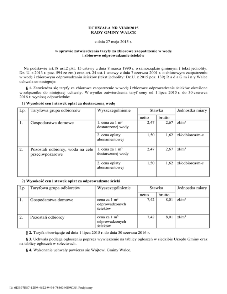 UCHWAŁA NR VI/40/2015 RADY GMINY WALCE z dnia 27 maja 2015 r. w sprawie zatwierdzenia taryfy za zbiorowe zaopatrzenie w wodę i zbiorowe odprowadzanie ścieków Na podstawie art.18 ust.2 pkt. 15 ustawy z dnia 8 marca 1990 r. o samorządzie gminnym ( tekst jednolity: Dz. U. z 2013 r. poz. 594 ze zm.) oraz art. 24 ust.1 ustawy z dnia 7 czerwca 2001 r. o zbiorowym zaopatrzeniu w wodę i zbiorowym odprowadzaniu ścieków (tekst jednolity: Dz.U. z 2015 poz. 139) R a d a G m i n y Walce uchwala co następuje: § 1. Zatwierdza się taryfy za zbiorowe zaopatrzenie w wodę i zbiorowe odprowadzanie ścieków określone w załączniku do niniejszej uchwały. W wyniku zatwierdzenia taryf ceny od 1 lipca 2015 r. do 30 czerwca 2016 r. wyniosą odpowiednio: 1) Wysokość cen i stawek opłat za dostarczoną wodę Lp. Taryfowa grupa odbiorców Wyszczególnienie Stawka 1. Gospodarstwa domowe 1. cena za 1 m3 dostarczonej wody 2,47 2,67 zł/m3 2. cena opłaty abonamentowej 1,50 1,62 zł/odbiorca/m-c 2,47 2,67 zł/m3 1,50 1,62 zł/odbiorca/m-c netto 2. Pozostali odbiorcy, woda na cele 1. cena za 1 m3 dostarczonej wody przeciwpożarowe 2. cena opłaty abonamentowej Jednostka miary brutto 2) Wysokość cen i stawek opłat za odprowadzone ścieki Lp Taryfowa grupa odbiorców Wyszczególnienie Stawka 1. Gospodarstwa domowe cena za 1 m3 odprowadzonych ścieków 7,42 8,01 zł/m3 2. Pozostali odbiorcy cena za 1 m3 odprowadzonych ścieków 7,42 8,01 zł/m3 netto Jednostka miary brutto § 2. Taryfa obowiązuje od dnia 1 lipca 2015 r. do dnia 30 czerwca 2016 r. § 3. Uchwała podlega ogłoszeniu poprzez wywieszenie na tablicy ogłoszeń w siedzibie Urzędu Gminy oraz na tablicy ogłoszeń w sołectwach. § 4. Wykonanie uchwały powierza się Wójtowi Gminy Walce. Id: 6DB97E87-12E9-4622-9494-7846340E9C35. Podpisany § 5. Uchwała wchodzi w życie z dniem podjęcia. Przewodniczący Rady Gminy Józef Nossol Id: 6DB97E87-12E9-4622-9494-7846340E9C35. Podpisany Załącznik do Uchwały Nr VI/40/2015 Rady Gminy Walce z dnia 27 maja 2015 r. TARYFA ZBIOROWEGO ZAOPATRZENIA W WODĘ I ZBIOROWEGO ODPROWADZANIA ŚCIEKÓW Informacje ogólne Samorządowy Zakład Budżetowy Wodociągi i Kanalizacja w Walcach zwany dalej Samorządowym Zakładem Budżetowym przedstawia niniejszy wniosek taryfowy zbiorowego zaopatrzenia w wodę i zbiorowego odprowadzania ścieków, w tym propozycję cen i stawek opłat za zbiorowe zaopatrzenie w wodę i zbiorowe odprowadzanie ścieków obowiązujące na terenie Gminy Walce na okres od dnia 1 lipca 2015 r. do dnia 30 czerwca 2016 r. Taryfa określa także warunki jej stosowania. Taryfa oraz niniejszy wniosek cenowy zostały przygotowane zgodnie z przepisami ustawy z dnia 7 czerwca 2001 roku o zbiorowym zaopatrzeniu w wodę i zbiorowym odprowadzaniu ścieków (tekst jednolity: Dz.U. z 2015 r. poz.139.) zwanym dalej ustawą oraz przepisami Rozporządzenia Ministra Budownictwa z dnia 28 czerwca 2006 roku w sprawie określenia taryf, wzoru wniosku o zatwierdzenie taryf oraz warunków rozliczeń za zbiorowe zaopatrzenie w wodę i zbiorowe odprowadzanie ścieków (Dz.U. Nr 127, poz.886 z późn. zm.) zwanego dalej rozporządzeniem. Wszelkie określenia odnoszące się do struktur taryfowych i rodzajów taryf i metodologii niezbędnych przychodów, użyte w tekście pochodzą z tej ustawy lub rozporządzenia. Taryfowe ceny i stawki opłat dotyczą wszystkich odbiorców usług wodociągowych i kanalizacyjnych świadczonych przez Samorządowy Zakład Budżetowy Wodociągi i Kanalizacja w Walcach. Zgodnie z art.22 ustawy, taryfa obejmuje także cenę za wodę pobraną na cele przeciwpowodziowe, przeciwpożarowe oraz zraszania publicznych terenów zielonych. TARYFA ZBIOROWEGO ZAOPATRZENIA W WODĘ I ZBIOROWEGO ODPROWADZANIA ŚCIEKÓW 1. Rodzaje prowadzonej działalności Samorządowy Zakład Budżetowy prowadzi działalność w zakresie zbiorowego zaopatrzenia w wodę i zbiorowego odprowadzania ścieków na terenie Gminy Walce oraz zaopatruje w wodę wodociąg wiejski w miejscowości Żużela Gmina Krapkowice. Samorządowy Zakład Budżetowy zobowiązany jest w szczególności do zapewnienia wysokiej jakości świadczonych usług, niezawodności zbiorowego zaopatrzenia w wodę i zbiorowego odprowadzania ścieków, przestrzegania wymagań ograniczenia szkodliwego oddziaływania na środowisko i utrzymanie możliwie niskich kosztów prowadzenia swojej działalności. Przedmiotem działalności Samorządowego Zakładu Budżetowego jest w szczególności: - prowadzenie usług w zakresie dostawy wody i odprowadzania ścieków; - eksploatacja ujęć wody; - eksploatacja przepompowni ścieków, - dokonywanie odbiorów technicznych nowych urządzeń i sieci wodociągowo - kanalizacyjnych na terenie Gminy oraz kontrolowanie poprawności wykonawstwa robót w tym zakresie; - kontrolowanie podłączeń wodno - kanalizacyjnych. 2. Rodzaj i struktura taryfy Zgodnie z ustawą, taryfa została zaprojektowana w sposób zapewniający: Id: 6DB97E87-12E9-4622-9494-7846340E9C35. Podpisany - uzyskanie niezbędnych przychodów, - ochronę Odbiorców usług przed nieuzasadnionym wzrostem opłat i cen, - eliminowanie subsydiowania skrośnego, - motywowania Odbiorców usług do racjonalnego użytkowania wody i ograniczania zanieczyszczenia ścieków, - łatwość obliczania opłat i sprawdzania przez Odbiorców usług wysokości opłat i cen ich dotyczących. Istotnym elementem wniosku jest zastosowanie taryfy jednolitej wieloczłonowej. Taryfa wieloczłonowa w większym stopniu spełnia w/w postulaty niż taryfa jednolita jednoczłonowa. Decydują o tym również względy ekonomiczne - zastosowanie opłaty abonamentowej zapewnia większą stabilność funkcjonowania Samorządowego Zakładu Budżetowego. Należy przy tym pamiętać, że znaczna cześć kosztów ogółem przedsiębiorstw wodociągowo-kanalizacyjnych, to koszty stałe. Oznacza to, że nawet jeżeli nie występuje sprzedaż i nie ma związanych z tym przychodów (ograniczanie sp