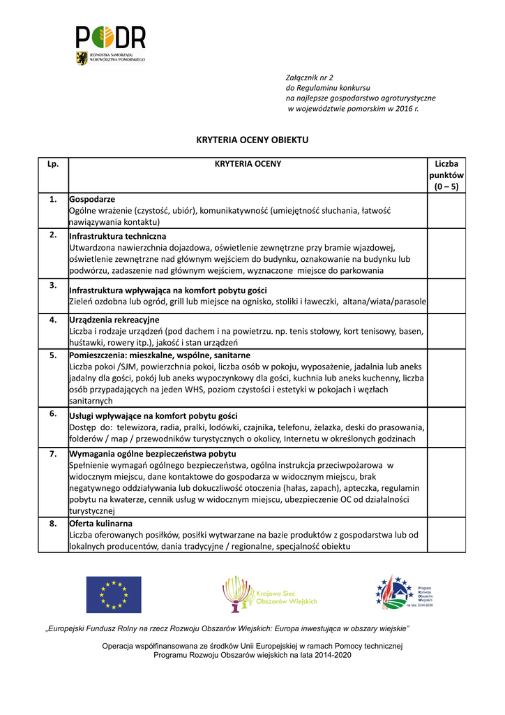 Załącznik nr 2 do Regulaminu konkursu na najlepsze gospodarstwo agroturystyczne w województwie pomorskim w 2016 r. KRYTERIA OCENY OBIEKTU Lp. KRYTERIA OCENY 1. Gospodarze Ogólne wrażenie (czystość, ubiór), komunikatywność (umiejętność słuchania, łatwość nawiązywania kontaktu) 2. Infrastruktura techniczna Utwardzona nawierzchnia dojazdowa, oświetlenie zewnętrzne przy bramie wjazdowej, oświetlenie zewnętrzne nad głównym wejściem do budynku, oznakowanie na budynku lub podwórzu, zadaszenie nad głównym wejściem, wyznaczone miejsce do parkowania 3. 4. 5. Infrastruktura wpływająca na komfort pobytu gości Zieleń ozdobna lub ogród, grill lub miejsce na ognisko, stoliki i ławeczki, altana/wiata/parasole Urządzenia rekreacyjne Liczba i rodzaje urządzeń (pod dachem i na powietrzu. np. tenis stołowy, kort tenisowy, basen, huśtawki, rowery itp.), jakość i stan urządzeń Pomieszczenia: mieszkalne, wspólne, sanitarne Liczba pokoi /SJM, powierzchnia pokoi, liczba osób w pokoju, wyposażenie, jadalnia lub aneks jadalny dla gości, pokój lub aneks wypoczynkowy dla gości, kuchnia lub aneks kuchenny, liczba osób przypadających na jeden WHS, poziom czystości i estetyki w pokojach i węzłach sanitarnych 6. Usługi wpływające na komfort pobytu gości Dostęp do: telewizora, radia, pralki, lodówki, czajnika, telefonu, żelazka, deski do prasowania, folderów / map / przewodników turystycznych o okolicy, Internetu w określonych godzinach 7. Wymagania ogólne bezpieczeństwa pobytu Spełnienie wymagań ogólnego bezpieczeństwa, ogólna instrukcja przeciwpożarowa w widocznym miejscu, dane kontaktowe do gospodarza w widocznym miejscu, brak negatywnego oddziaływania lub dokuczliwość otoczenia (hałas, zapach), apteczka, regulamin pobytu na kwaterze, cennik usług w widocznym miejscu, ubezpieczenie OC od działalności turystycznej Oferta kulinarna Liczba oferowanych posiłków, posiłki wytwarzane na bazie produktów z gospodarstwa lub od lokalnych producentów, dania tradycyjne / regionalne, specjalność obiektu 8. „Europejski Fundusz Rolny na rzecz Rozwoju Obszarów Wiejskich: Europa inwestująca w obszary wiejskie” Operacja współfinansowana ze środków Unii Europejskiej w ramach Pomocy technicznej Programu Rozwoju Obszarów wiejskich na lata 2014-2020 Liczba punktów (0 – 5) 9. 10. Ekologia Proekologiczne działania edukacyjne, przestrzeganie zasad służących ochronie środowiska, odnawialne źródła energii, chów i hodowla zwierząt metodą ekologiczną, uprawa warzyw i owoców metoda ekologiczną, segregacja odpadów (oznakowane pojemniki na terenie obiektu) Uznaniowe Siedlisko wiejskie zagospodarowane tradycyjnie, ogród warzywny, prowadzona produkcja rolna / zwierzęca, zwierzęta stanowiące atrakcję turystyczną gospodarstwa (liczba gatunków), elementy dekoracyjne w obiekcie związane z kultywowaniem tradycji, przynależność do stowarzyszenia. „Europejski Fundusz Rolny na rzecz Rozwoju Obszarów Wiejskich: Europa inwestująca w obszary wiejskie” Operacja współfinansowana ze środków Unii Europejskiej w ramach Pomocy technicznej Programu Rozwoju Obszarów wiejskich na lata 2014-2020