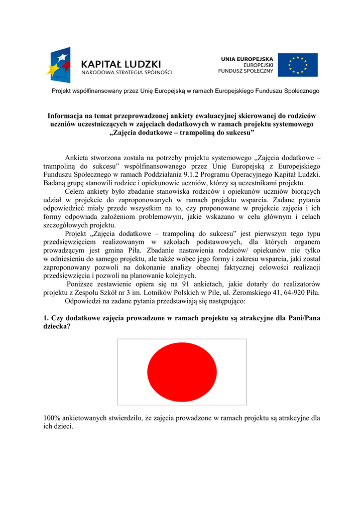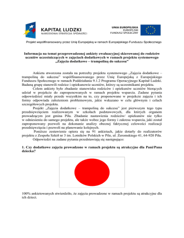 Projekt współfinansowany przez Unię Europejską w ramach Europejskiego Funduszu Społecznego Informacja na temat przeprowadzonej ankiety ewaluacyjnej skierowanej do rodziców uczniów uczestniczących w zajęciach dodatkowych w ramach projektu systemowego „Zajęcia dodatkowe – trampoliną do sukcesu” Ankieta stworzona została na potrzeby projektu systemowego „Zajęcia dodatkowe – trampoliną do sukcesu” wspólfinansowanego przez Unię Europejską z Europejskiego Funduszu Społecznego w ramach Poddziałania 9.1.2 Programu Operacyjnego Kapitał Ludzki. Badaną grupę stanowili rodzice i opiekunowie uczniów, którzy są uczestnikami projektu. Celem ankiety było zbadanie stanowiska rodziców i opiekunów uczniów biorących udział w projekcie do zaproponowanych w ramach projektu wsparcia. Zadane pytania odpowiedzieć miały przede wszystkim na to, czy proponowane w projekcie zajęcia i ich formy odpowiada założeniom problemowym, jakie wskazano w celu głównym i celach szczegółowych projektu. Projekt „Zajęcia dodatkowe – trampoliną do sukcesu” jest pierwszym tego typu przedsięwzięciem realizowanym w szkołach podstawowych, dla których organem prowadzącym jest gmina Piła. Zbadanie nastawienia rodziców/ opiekunów nie tylko w odniesieniu do samego projektu, ale także wobec jego formy i zakresu wsparcia, jaki został zaproponowany pozwoli na dokonanie analizy obecnej faktycznej celowości realizacji przedsięwzięcia i pozwoli na planowanie kolejnych. Poniższe zestawienie opiera się na 91 ankietach, jakie dotarły do realizatorów projektu z Zespołu Szkół nr 3 im. Lotników Polskich w Pile, ul. Żeromskiego 41, 64-920 Piła. Odpowiedzi na zadane pytania przedstawiają się następująco: 1. Czy dodatkowe zajęcia prowadzone w ramach projektu są atrakcyjne dla Pani/Pana dziecka? 100% ankietowanych stwierdziło, że zajęcia prowadzone w ramach projektu są atrakcyjne dla ich dzieci. 2. Czy zajęcia prowadzone w ramach w przezwyciężeniu trudności szkolnych? projektu pomogły Państwa dziecku 89,01% ankietowanych stwierdziło, że zajęcia prowadzone w ramach projektu pomogły ich dzieciom w przezwyciężeniu trudności szkolnych, natomiast 10,99% ankietowanych uważa, że taka forma wsparcia nie wpływa na przezwyciężanie trudności w nauce. 3. Czy uczestnictwo Pani/Pana dziecka w zajęciach pomoże w osiąganiu lepszych wyników w nauce? 86,81% ankietowanych stwierdziło, że uczestnictwo dziecka w zajęciach w ramach projektu pomoże osiągnąć lepsze wyniki w nauce. 13,19% ankietowanych uważa, że taka forma wsparcia nie wpływa na wyniki dziecka w nauce. 4. Czy uczestnictwo Pani/Pana dziecka w zajęciach w ramach projektu wpłynęło na rozwój jego zainteresowań? 76,92% pytanych uważa, że zajęcia dodatkowe wpłynęły na rozwój zainteresowań ich dzieci, a 23,08% jednoznacznie twierdzi, że realizacja zajęć nie będzie miała na to wpływu. 5. Czy oprócz zajęć dodatkowych, przewidzianych w ramach projektu, Pani/Pana dziecko korzysta z innych form edukacji pozalekcyjnej lub pozaszkolnej? 52,75% pytanych rodziców oznajmiło, że ich dziecko korzysta z innych zajęć dodatkowych. 47,25% ankietowanych przyznało, że ich dziecko nie korzysta z innych form edukacji pozalekcyjnej lub pozaszkolnej. Jeżeli zaznaczył/a Pan/Pani odpowiedź TAK to prosimy wskazać, jakie to zajęcia. Koła zainteresowań: przyrodnicze edukacji matematycznej informatyczne edukacji polonistycznej 0 16 2 8 Zajęcia wyrównawcze: edukacji matematycznej edukacji polonistycznej edukacji przyrodniczej 7 9 0 Języki obce: angielski niemiecki Sportowe: 15 0 19 Muzyczno - artystyczne: wokalne taneczne plastyczne teatralne 0 4 3 0 Inne: brak danych Z analizy wynika, że największą popularnością cieszą się zajęcia sportowe – 20,88% oraz w ramach kół zainteresowań zajęcia polonistyczne – 17,58%. 6. Czy uważa Pani/Pan, że ilość zajęć pozalekcyjnych w szkole, do której uczęszcza Pani/Pana dziecko, jest wystarczająca? (Prosimy o udzielenie informacji, bez uwzględnienia zajęć ujętych w projekcie). 72,53% rodziców uważa, że ilość zajęć pozalekcyjnych jakie szkoła oferuje swoim uczniom jest wystarczająca, 27,47% jest odmiennego zdania. 7. Czy uważa Pani/Pan, że dziecko ma utrudniony dostęp do zajęć pozalekcyjnych? (Prosimy o udzielenie informacji bez uwzględnienia zajęć z projektu). 14,29% rodziców stwierdziło, że ich dziecko ma utrudniony dostęp do zajęć pozalekcyjnych, natomiast 85,71% uważa, że ich dziecko nie ma utrudnionego dostępu do zajęć pozalekcyjnej. 8. Czy został/a pan/Pani poinformowany/a o tym, że projekt "Zajęcia dodatkowe trampoliną do sukcesu" jest współfinansowany ze środków Unii Europejskiej w ramach Europejskiego Funduszu Spolecznego? 100% rodziców przyznało, że zostali poinformowani o fakcie, że dziecko będzie uczestniczyło w zajęciach współfinansowanych ze środków EFS. 9. Jak ocenia Pani/pan działania organizacyjne i przebieg realizacji projektu? 100% ankietowanych pozytywnie oceniło działania organizacyjne oraz sam przebieg realizacji projektu "Zajęcia dodatkowe - trampoliną do sukcesu". 10. Czy prowadzący zajęcia udzielili Pani/ Panu wyczerpujących infirmacji dotyczących realizacji w ramach projektu? 97,80% rodziców przyznało, że nauczyciele prowadzący zajęcia w ramach projektu udzielili im wyczerpujących informacji dotyczacych realizacji zajęć; 2,20% uznało, że informacje nie były wyczerpujące. 11. Czy Pani/Pana dziecko jest zadowolone z udziału w zajęciach w ramach projektu? 100% ankietowanych rodziców stwierdziło, że ich dziecko było zadowolone z udziału w zajęciach realizowanych w ramach projektu "Zajęcia dodatkowe - trampolina do sukcesu". 12. Czy według Pani/Pana projekt "Zajęcia dodatkowe - trampoliną do sukcesu" jest inicjatywą słuszna i powinien byc kontynuowany w przyszłości? 100% ankietowanych rodziców przyznało, że projekt "Zaj