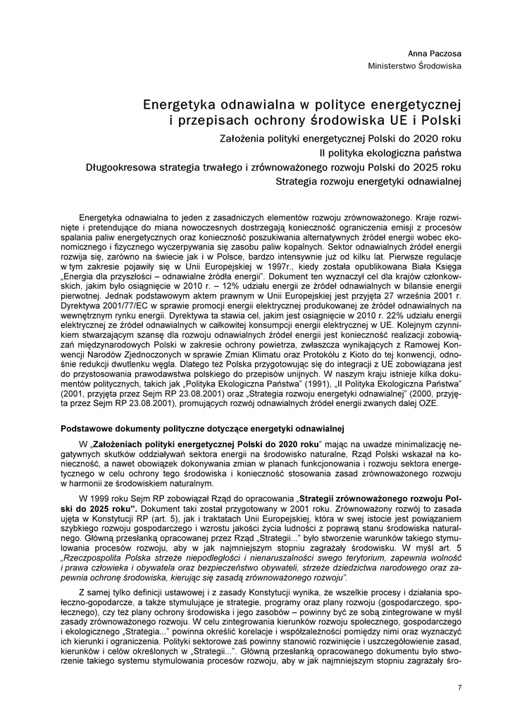 Anna Paczosa Ministerstwo Œrodowiska Energetyka odnawialna w polityce energetycznej i przepis ach och rony œ rodowis ka U E i P ols ki Za³o¿enia polityki energetycznej Polski do 2020 roku II polityka ekologiczna pañstwa D³ugookresowa strategia trwa³ego i zrównowa¿onego rozwoju Polski do 2025 roku Strategia rozwoju energetyki odnawialnej Energetyka odnawialna to jeden z zasadniczych elementów rozwoju zrównoważonego. Kraje rozwinię te i pretendujące do miana nowoczesnych dostrzegają konieczność ograniczenia emisji z procesów spalania paliw energetycznych oraz konieczność poszukiwania alternatywnych źródeł energii wob ec ekonomicznego i f izycznego wyczerpywania się zasob u paliw kopalnych. Sektor odnawialnych źródeł energii rozwija się , zarówno na świecie jak i w Polsce, b ardzo intensywnie już od kilku lat. Pierwsze regulacje w tym zakresie pojawiły się w U nii Europejskiej w 19 9 7 r., kiedy została opub likowana B iała Księ ga „ Energia dla przyszłości – odnawialne źródła energii” . D okument ten wyznaczył cel dla krajów członkowskich, jakim b yło osiągnię cie w 2010 r. – 12% udziału energii ze źródeł odnawialnych w b ilansie energii pierwotnej. J ednak podstawowym aktem prawnym w U nii Europejskiej jest przyję ta 27 września 2001 r. D yrektywa 2001/ 7 7 / EC w sprawie promocji energii elektrycznej produkowanej ze źródeł odnawialnych na wewnę trznym rynku energii. D yrektywa ta stawia cel, jakim jest osiągnię cie w 2010 r. 22% udziału energii elektrycznej ze źródeł odnawialnych w całkowitej konsumpcji energii elektrycznej w U E. Kolejnym czynnikiem stwarzającym szansę dla rozwoju odnawialnych źródeł energii jest konieczność realizacji zob owiązań mię dzynarodowych Polski w zakresie ochrony powietrza, zwłaszcza wynikających z Ramowej Konwencji N arodów Zjednoczonych w sprawie Zmian Klimatu oraz Protokółu z Kioto do tej konwencji, odnośnie redukcji dwutlenku wę gla. D latego też Polska przygotowując się do integracji z U E zob owiązana jest do przystosowania prawodawstwa polskiego do przepisów unijnych. W naszym kraju istnieje kilka dokumentów politycznych, takich jak „ Polityka Ekologiczna Pań stwa” ( 19 9 1), „ I I Polityka Ekologiczna Pań stwa” ( 2001, przyję ta przez Sejm RP 23.08.2001) oraz „ Strategia rozwoju energetyki odnawialnej” ( 2000, przyję ta przez Sejm RP 23.08.2001), promujących rozwój odnawialnych źródeł energii zwanych dalej OZE. Podstawowe dokumenty polityczne dotyczące energetyki odnawialnej W „ Z ał oż eniach polityki energetycznej Polski do 2 0 2 0 roku” mając na uwadze minimalizację negatywnych skutków oddziaływań sektora energii na środowisko naturalne, Rząd Polski wskazał na konieczność , a nawet ob owiązek dokonywania zmian w planach f unkcjonowania i rozwoju sektora energetycznego w celu ochrony tego środowiska i konieczność stosowania zasad zrównoważonego rozwoju w harmonii ze środowiskiem naturalnym. W 19 9 9 roku Sejm RP zob owiązał Rząd do opracowania „ S trategii zró wnoważ onego rozwoju Polski do 2 0 2 5 roku” . D okument taki został przygotowany w 2001 roku. Zrównoważony rozwój to zasada uję ta w Konstytucji RP ( art. 5 ), jak i traktatach U nii Europejskiej, która w swej istocie jest powiązaniem szyb kiego rozwoju gospodarczego i wzrostu jakości życia ludności z poprawą stanu środowiska naturalnego. G łówną przesłanką opracowanej przez Rząd „ Strategii...” b yło stworzenie warunków takiego stymulowania procesów rozwoju, ab y w jak najmniejszym stopniu zagrażały środowisku. W myśl art. 5 „Rzeczpospolita Polska strzeże niepodległości i nienaruszalności swego terytorium, zapewnia wolność i prawa człowieka i ob ywatela oraz b ezpieczeń stwo ob ywateli, strzeże dziedzictwa narodowego oraz zapewnia ochronę środowiska, kierując się zasadą zrównoważonego rozwoju”. Z samej tylko def inicji ustawowej i z zasady Konstytucji wynika, że wszelkie procesy i działania społeczno- gopodarcze, a także stymulujące je strategie, programy oraz plany rozwoju ( gospodarczego, społecznego), czy też plany ochrony środowiska i jego zasob ów – powinny b yć ze sob ą zintegrowane w myśl zasady zrównoważonego rozwoju. W celu zintegrowania kierunków rozwoju społecznego, gospodarczego i ekologicznego „ Strategia...” powinna określić korelacje i współzależności pomię dzy nimi oraz wyznaczyć ich kierunki i ograniczenia. Polityki sektorowe zaś powinny stanowić rozwinię cie i uszczegółowienie zasad, kierunków i celów określonych w „ Strategii...” . G łówną przesłanką opracowanego dokumentu b yło stworzenie takiego systemu stymulowania procesów rozwoju, ab y w jak najmniejszym stopniu zagrażały śro- 7 dowisku. „Strategia...” określa kierunki rozwoju kraju w okresie do 2025 roku, uwzględniając obecny stan polskiej gospodarki, wymagania wynikające z polskiego prawa, jak i oczekiwania społeczne co do kierunków rozwoju kraju. W yznacza ramy dla rozwoju poszczególnych sektorów gospodarki i musi być wspierana przez odpowiednio skonstruowane polityki sektorowe, w tym m.in. politykę ekologiczną Państwa, politykę rozwoju gospodarczego, politykę sektora paliwowo-energetycznego, politykę surowcową. „II Polityka ekologiczna państwa” przyjęta przez Sejm R P 23.08 .2001 r. jest kontynuacją „I Polityki ekologicznej” z 1991 r., która dała podstawy do zamiany podejścia do ochrony środowiska w Polsce. J ednym z podstawowych celów „I I Polityki ekologicznej państwa” jest zmniejszanie energochłonności gospodarki, zarówno procesów wytwórczych, jak i świadczenia usług oraz konsumpcji. D ziałaniom w zakresie zmniejszania energochłonności musi towarzyszyć kontynuowanie przedsięwzięć zmieniających sposób zaspokajania istniejących potrzeb energetycznych, przede wszystkim strukturę wykorzystania nośników energii