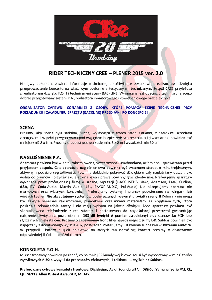 RIDER TECHNICZNY CREE – PLENER 2015 ver. 2.0 Niniejszy dokument zawiera informacje techniczne, umożliwiające zespołowi i realizatorowi dźwięku przeprowadzenie koncertu na właściwym poziomie artystycznym i technicznym. Zespół CREE przyjeżdża z realizatorem dźwięku F.O.H i technicznymi sceny BACKLINE. Wymagana jest obecność technika znającego dobrze przygotowany system P.A., realizatora monitorowego i oświetleniowego oraz elektryka. ORGANIZATOR ZAPEWNI CONAMNIEJ 2 OSOBY, KTÓRE POMAGĄ EKIPIE TECHNICZNEJ PRZY ROZŁADUNKU I ZAŁADUNKU SPRZĘTU (BACKLINE) PRZED JAK I PO KONCERCIE! SCENA Prosimy, aby scena była stabilna, sucha, wysłonięta z trzech stron siatkami, z szerokimi schodami z poręczami i w pełni przygotowana pod względem bezpieczeństwa zespołu, a jej wymiar nie powinien być mniejszy niż 8 x 6 m. Prosimy o podest pod perkusję min. 3 x 2 m i wysokości min 50 cm. NAGŁOŚNIENIE P.A. Aparatura powinna być w pełni zainstalowana, wysterowana, uruchomiona, uziemiona i sprawdzona przed przyjazdem zespołu. Cała aparatura nagłośnieniowa powinna być systemem stereo, o min. trójdrożnym, aktywnym podziale częstotliwości. Powinna dokładnie pokrywać dźwiękiem cały nagłaśniany obszar, być wolna od brumów i przydźwięku a strona lewa i prawa powinny grać identycznie. Preferujemy aparatury wykonane przez profesjonalną firmę o uznanej reputacji (L-ACOUSTICS, Nexo, Adamson, EAW, Outline, d&b, EV, Coda-Audio, Martin Audio, JBL, BAYOR-AUDIO, Pol-Audio) Nie akceptujemy aparatur nie markowych oraz własnych konstrukcji. Preferujemy systemy line-array podwieszane na wingach lub wieżach Layher. Nie akceptujemy systemów podwieszanych wewnątrz światła sceny!!! Kolumny nie mogą być zakryte banerami reklamowymi, plandekami oraz innymi materiałami za wyjątkiem tych, które posiadają odpowiednie atesty i nie mają wpływu na jakość dźwięku. Moc aparatury powinna być skonsultowana telefonicznie z realizatorem i dostosowana do nagłaśnianej przestrzeni gwarantując natężenie dźwięku na poziomie min. 103 dB (weight A pomiar uśredniony) przy stanowisku FOH bez słyszalnych zniekształceń. Prosimy o zapewnienie front fill-a napędzanego z sumy L-R. Subbas powinien być napędzany z dodatkowego wyjścia Aux, post-fader. Preferujemy ustawienie subbasów w systemie end-fire. W przypadku bardzo długich obiektów, na których ma odbyć się koncert prosimy o dostawienie odpowiedniej ilości linii opóźniających. KONSOLETA F.O.H. Mikser frontowy powinien posiadać, co najmniej 32 kanały wejściowe. Musi być wyposażony w min 6 torów wysyłkowych AUX: 4 wysyłki do procesorów efektowych, 1 talkback i 1 wyjście na Subbas. Preferowane cyfrowe konsolety frontowe: Digidesign, Avid, Soundcraft Vi, DiGiCo, Yamaha (serie PM, CL, QL, M7CL), Allen & Heat iLive, GLD, MIDAS. Mikser wraz z peryferiami powinien być umieszczony na stabilnym podeście o wysokości maks. 30 cm i znajdować się centralnie względem sceny i nagłośnienia. Preferowana odległość F.O.H. od frontu sceny to min. 25 m. Stanowisko FOH nie może znajdować się na zabudowanych przyczepach lub samochodach. Podczas koncertów plenerowych konieczne jest zadaszenie. Alternatywna konsoleta analogowa musi posiadać: minimum 32 kanały mono, pełną 4-punktową korekcję, przełącznik fazy, zasilanie phantom, płynnie strojony filtr górnoprzepustowy, 6 torów aux oraz min. 8 podgrup VCA. Ponadto, w przypadku użycia konsolety analogowej, po próbie dźwięku pozostaje ona (wraz z zainsertowanymi procesorami dynamiki) do wyłącznego użytku zespołu. Peryferia w przypadku systemu analogowego FOH: • korektor graficzny na sumie 2 x 31 pasm (Ashly, BSS, Klark Teknik) • 4 x bramka (BSS, dbx, Drawmer, Altair) • 14 x kompresor (BSS, dbx, Drawmer, Altair) • min. 3 x procesory efektów (Lexicon, t.c. electronic, Yamaha) Nie akceptujemy analogowych urządzeń firmy Klark-Teknik Square One, Behringer, Phonic, Alto, Samson, Peavey. INNE: Prosimy o zapewnienie: • odtwarzacza CD/MP3 przy stole FOH – zamiennie z laptopem z zewnętrzną kartą audio. • oświetlenie mixera i peryferii • mikrofonu talkback wysłanego do wszystkich monitorów na scenie (zagwarantuje to szybką i sprawną realizacje próby mikrofonowej) KONSOLETA MONITOROWA Stół monitorowy jest niezbędny. Prosimy o ustawienie go z lewej strony patrząc na scenę z pozycji F.O.H. (patrz plan sceny), na tym samym poziomie, co scena a realizator miał kontakt wzrokowy z muzykami znajdującymi się na scenie. System monitorowy musi posiadać, co najmniej 7 torów AUX: M 1 – Sebastian (2 monitory) M 2 – Kramek (1 monitor) M 3 – Piano (1 monitor) 2 tory do perkusji: M 4 - pełno pasmowy drumfill o wysokiej skuteczności z dedykowanym subbasem M 5 - wtyk XLR przy podeście perkusyjnym M 6, 7 * - pełno pasmowy Side Fill o wysokiej skuteczności z subbasami na głośnikach 18". * - Tylko na dużych scenach. Prosimy o konsultacje telefoniczne. Preferujemy firmowe monitory oparte na przetwornikach 15"+1,5" (D&B, Martin Audio, L-ACOUSTICS, EAW, EV, Adamson, Nexo). PLAN SCENY INPUT LISTA: INPUT LISTA CREE - PLENER Nr kanału Źródło Mikrofon Insert 1 Kick drum / Stopa EV 868, Shure Beta 52, Beta 91A, Audix D6 Bramka 2 Snare top / Werbel góra Shure SM 57 / Audix I5 Kompresor 3 Snare bottom / Werbel dół Shure SM 57 / Sennheiser 604 Kompresor 4 Hi-hat Pojemnościowy Kompresor 5 Tom 1 Sennheiser e904, 604, Audix D2 Bramka 6 Tom 2 Sennheiser e904, 604, Audix D2 Bramka 7 Tom 3 Sennheiser e904, 604, Audix D2 Bramka 8 Over head - lewa Pojemnościowy wielkomembranowy 9 Over head - prawa Pojemnościowy wielkomembranowy 10 Bass - linia XLR (gniazdo z tyłu wzmacniacza) Kompresor 11 Bass - mikrofon Shure SM 57 Kompresor 12 1 Gitara L - Sebastian Shure SM 57 13 1 Gitara R - Sebastian Sennheiser MD421, e906, e609 14 2 Gitara L - Kramek Shure SM 57 15 2 Gitara R - Kramek Sennheiser MD421, e906, e609 16 Leslie - Dół Własny mikrofo