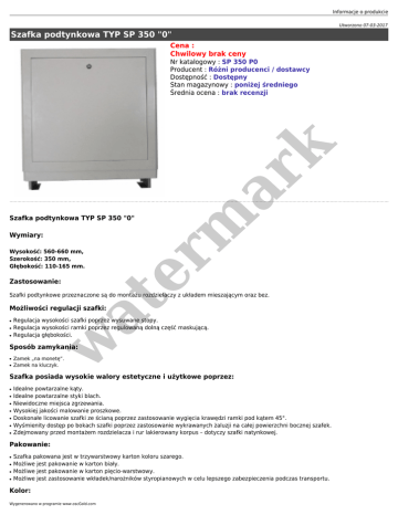 Informacje o produkcie Utworzono 07-03-2017 Szafka podtynkowa TYP SP 350 "0" Cena : Chwilowy brak ceny er m ar k Nr katalogowy : SP 350 P0 Producent : Różni producenci / dostawcy Dostępność : Dostępny Stan magazynowy : poniżej średniego Średnia ocena : brak recenzji Szafka podtynkowa TYP SP 350 "0" Wymiary: Wysokość: 560-660 mm, Szerokość: 350 mm, Głębokość: 110-165 mm. Zastosowanie: at Szafki podtynkowe przeznaczone są do montażu rozdzielaczy z układem mieszającym oraz bez. Możliwości regulacji szafki: ● ● Regulacja wysokości szafki poprzez wysuwane stopy. Regulacja wysokości ramki poprzez regulowaną dolną część maskującą. Regulacja głębokości. w ● Sposób zamykania: ● ● Zamek „na monetę”. Zamek na kluczyk. Szafka posiada wysokie walory estetyczne i użytkowe poprzez: ● ● ● ● ● ● ● Idealne powtarzalne kąty. Idealne powtarzalne styki blach. Niewidoczne miejsca zgrzewania. Wysokiej jakości malowanie proszkowe. Doskonałe licowanie szafki ze ścianą poprzez zastosowanie wygięcia krawędzi ramki pod kątem 45°. Wyśmienity dostęp po bokach szafki poprzez zastosowanie wykrawanych żaluzji na całej powierzchni bocznej szafek. Zdejmowany przed montażem rozdzielacza i rur lakierowany korpus – dotyczy szafki natynkowej. Pakowanie: ● ● ● ● Szafka pakowana jest w trzywarstwowy karton koloru szarego. Możliwe jest pakowanie w karton biały. Możliwe jest pakowanie w karton pięcio-warstwowy. Możliwe jest zastosowanie wkładek/narożników styropianowych w celu lepszego zabezpieczenia podczas transportu. Kolor: Wygenerowano w programie www.oscGold.com er m ar k Szafki standardowo malowane są w kolorze białym RAL9016. Możliwe jest zastosowanie każdego koloru z palety RAL. at ● w ●