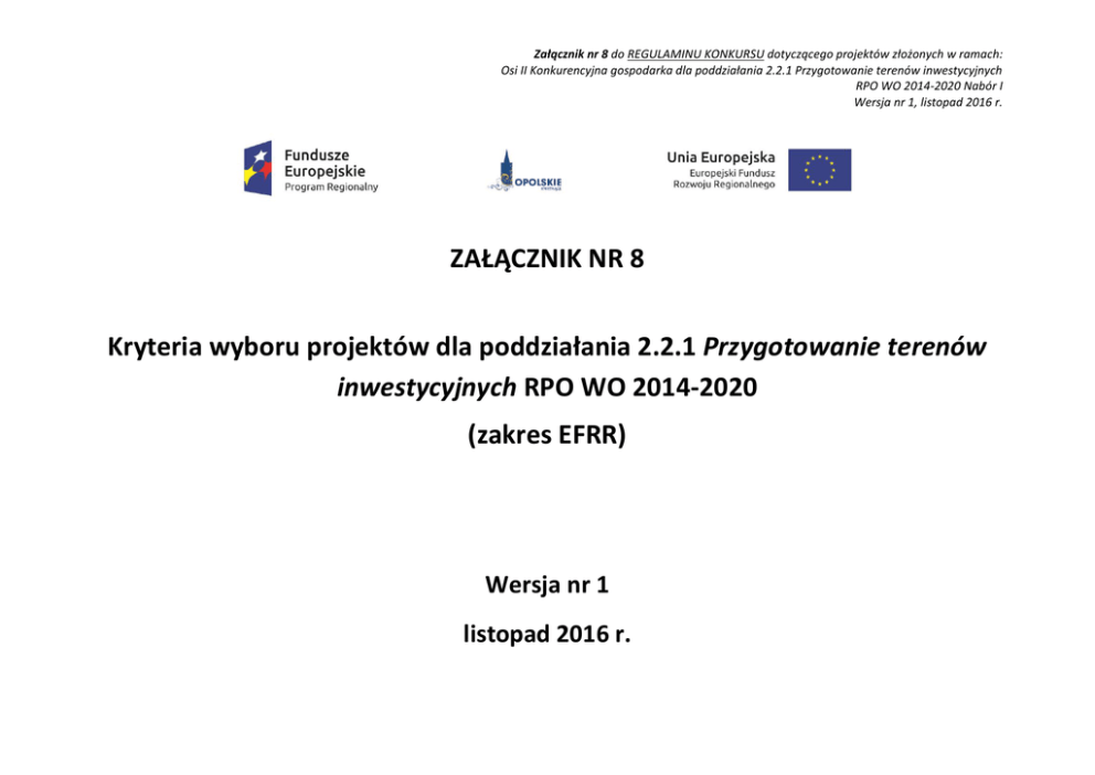 Załącznik nr 8 do REGULAMINU KONKURSU dotyczącego projektów złożonych w ramach: Osi II Konkurencyjna gospodarka dla poddziałania 2.2.1 Przygotowanie terenów inwestycyjnych RPO WO 2014-2020 Nabór I Wersja nr 1, listopad 2016 r. ZAŁĄCZNIK NR 8 Kryteria wyboru projektów dla poddziałania 2.2.1 Przygotowanie terenów inwestycyjnych RPO WO 2014-2020 (zakres EFRR) Wersja nr 1 listopad 2016 r. Załącznik nr 8 do REGULAMINU KONKURSU dotyczącego projektów złożonych w ramach: Osi II Konkurencyjna gospodarka dla poddziałania 2.2.1 Przygotowanie terenów inwestycyjnych RPO WO 2014-2020 Nabór I Wersja nr 1, listopad 2016 r. KRYTERIA FORMALNE DLA WSZYSTKICH DZIAŁAŃ I PODDZIAŁAŃ RPO WO 2014-2020 Strona 2 z 19 Załącznik nr 8 do REGULAMINU KONKURSU dotyczącego projektów złożonych w ramach: Osi II Konkurencyjna gospodarka dla poddziałania 2.2.1 Przygotowanie terenów inwestycyjnych RPO WO 2014-2020 Nabór I Wersja nr 1, listopad 2016 r. Kryteria formalne (TAK/NIE) LP Nazwa kryterium Źródło informacji Charakter kryterium W/B Definicja 1 2 3 4 5 Bezwzględny Typy potencjalnych beneficjentów określone w "Szczegółowym opisie osi priorytetowych RPO WO 2014-2020". Zgodnie z podpisanym oświadczeniem we wniosku Wnioskodawca oraz partnerzy (jeśli dotyczy) nie podlegają wykluczeniu z ubiegania się o dofinansowanie na podstawie: art. 207 ust. 4 ustawy z dnia 27 sierpnia 2009 r. o finansach publicznych, art. 12 ustawy z dnia 15 czerwca 2012 r. o skutkach powierzania wykonywania pracy cudzoziemcom przebywającym wbrew przepisom na terytorium Rzeczypospolitej Polskiej, art. 9 ustawy z dnia 28 października 2002 r. o odpowiedzialności podmiotów zbiorowych za czyny zabronione pod groźbą kary. Ponadto na podstawie podpisanego oświadczenia weryfikacji podlega, czy operacje wybrane do wsparcia nie obejmują kategorii wydatków stanowiących część operacji, które są lub powinny być objęte procedurą odzyskiwania w następstwie przeniesienia działalności produkcyjnej poza obszar objęty programem. Bezwzględny Typy dopuszczalnych projektów określone w "Szczegółowym opisie osi priorytetowych RPO WO 2014-2020", ogłoszeniu o naborze wniosków oraz regulaminie konkursu. Ponadto, projekty z zakresu Zrównoważonego transportu na rzecz mobilności mieszkańców, 1. Wnioskodawca uprawniony do składania wniosku o dofinansowanie projektu 2. Typ projektu możliwy do realizacji w ramach działania / poddziałania, zakresu konkursu/ wynikający z wykazu projektów Wniosek wraz z załącznikami Wniosek wraz z załącznikami Strona 3 z 19 Załącznik nr 8 do REGULAMINU KONKURSU dotyczącego projektów złożonych w ramach: Osi II Konkurencyjna gospodarka dla poddziałania 2.2.1 Przygotowanie terenów inwestycyjnych RPO WO 2014-2020 Nabór I Wersja nr 1, listopad 2016 r. Kryteria formalne (TAK/NIE) LP Nazwa kryterium Źródło informacji Charakter kryterium W/B Definicja 1 2 3 4 5 3. 1 zidentyfikowanych (dot. procedury pozakonkursowej)1 Projekt spełnia limity i ograniczenia w realizacji projektów (nie dotyczy warunków finansowych) Wniosek wraz z załącznikami 4. Wniosek wypełniony poprawnie, zgodnie z wymogami Instytucji Zarządzającej RPO WO 20142020 Wniosek o dofinansowanie 5. Załączniki do wniosku są poprawne, zgodnie z wymogami Instytucji Zarządzającej RPO WO 2014-2020 Załączniki do wniosku o dofinansowanie 6. Projekt spełnia warunki finansowe (m.in. wartość kwotowa i wysokość procentowa wnioskowanego dofinansowania; całkowita wartość projektu) Wniosek wraz z załącznikami Bezwzględny Bezwzględny Bezwzględny Bezwzględny realizowane w trybie pozakonkursowym muszą wynikać z listy projektów zawartej w Action Planie. Zgodnie z warunkami określonymi dla działania/poddziałania w „Szczegółowym opisie osi priorytetowych RPO WO 2014-2020”, w ogłoszeniu o konkursie oraz regulaminie konkursu na poziomie oceny formalnej. Zgodnie z ”Instrukcją wypełniania wniosku o dofinansowanie projektu ze środków Europejskiego Funduszu Rozwoju Regionalnego w ramach RPO WO 2014-2020”, treścią ogłoszenia o naborze wniosków oraz regulaminem konkursu. Zgodnie z „Instrukcją wypełniania załączników do wniosku o dofinansowanie projektu ze środków Europejskiego Funduszu Rozwoju Regionalnego w ramach RPO WO 2014-2020” , treścią ogłoszenia o naborze wniosków oraz regulaminem konkursu. Zgodnie z warunkami dla działania/poddziałania/typu projektu określonego w "Szczegółowym opisie osi priorytetowych RPO WO 20142020" oraz zasadami zamówień publicznych i zasadami udzielania pomocy publicznej (w tym de minimis). Wnioskowana intensywność pomocy publicznej jest zgodna z poziomem dozwolonym dla regionu*. Wybrać właściwe. Strona 4 z 19 Załącznik nr 8 do REGULAMINU KONKURSU dotyczącego projektów złożonych w ramach: Osi II Konkurencyjna gospodarka dla poddziałania 2.2.1 Przygotowanie terenów inwestycyjnych RPO WO 2014-2020 Nabór I Wersja nr 1, listopad 2016 r. Kryteria formalne (TAK/NIE) LP Nazwa kryterium Źródło informacji Charakter kryterium W/B Definicja 1 2 3 4 5 7. 8. 9. 10. 11. Zabezpieczono źródła finansowania projektu Wnioskodawca wybrał wszystkie wskaźniki horyzontalne. Wnioskodawca określił wartość docelową większą od zera przynajmniej dla jednego wskaźnika w projekcie. Kryterium dot. projektów pozakonkursowych Do dofinansowania nie może zostać wybrany projekt, który został usunięty z wykazu projektów pozakonkursowych (stanowiącego załącznik do SZOOP) Projekt nie został zakończony przed złożeniem formularza wniosku Wniosek wraz z załącznikami Bezwzględny Sprawdza się, czy przedstawione dokumenty potwierdzają zabezpieczenie niezbędnych środków - zgodnie z instrukcjami Instytucji Zarządzającej. Analiza budżetu oraz załączników. W przypadku projektów złożonych (kilku partnerów, PPP, podmioty prywatne) możliwa jest ekspertyza. Wniosek o dofinansowanie Bezwzględny Wnioskodawca wybiera