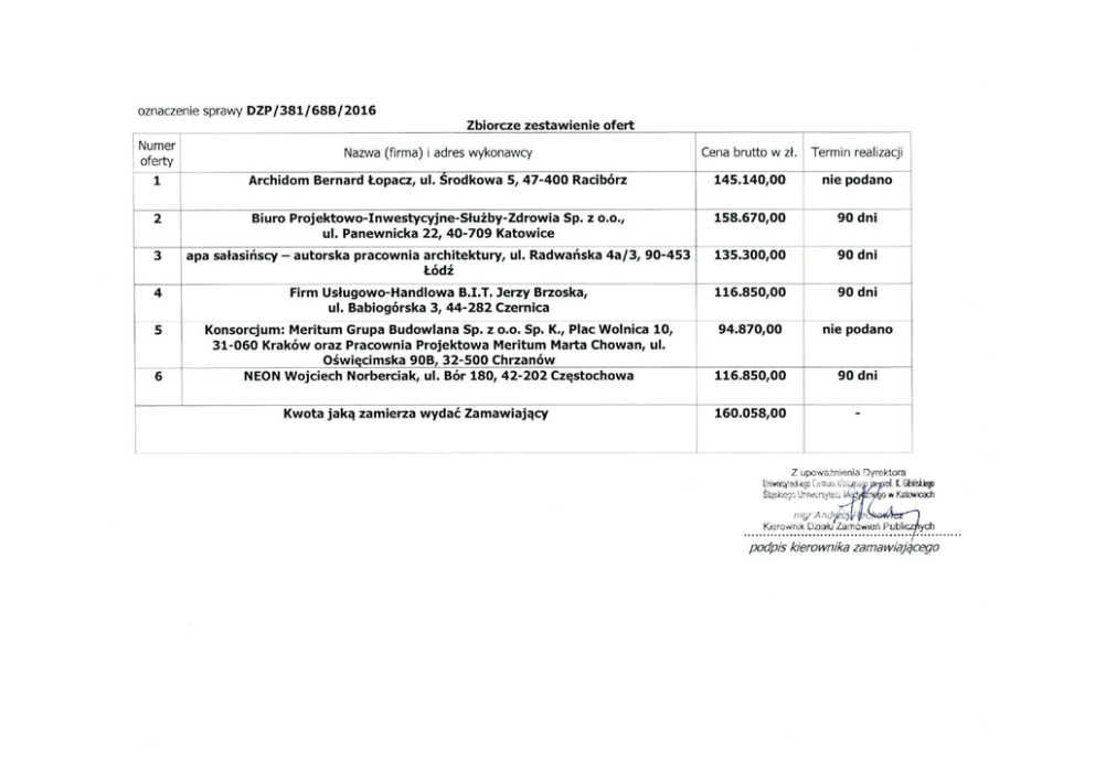 oznaczenie sprawy DZP/381/68B/2016 Zbiorcze zestawienie ofert Numer oferty Nazwa (firma) i adres wykonawcy Cena brutto w zł. Termin realizacji 1 Archidom Bernard Łopacz, ul. Środkowa 5, 47-400 Racibórz 145.140,00 nie podano 2 Biuro Projektowo-Inwestycyjne-Służby-Zdrowia Sp. z o.o., ul. Panewnicka 22, 40-709 Katowice 158.670,00 90 dni 3 apa sałasińscy - autorska pracownia architektury, ul. Radwańska 4a/3, 90-453 Łódź 135.300,00 90 dni 4 Firm Usługowo-Handlowa B.I.T. Jerzy Brzoska, ul. Babiogórska 3, 44-282 Czernica 116.850,00 90 dni 5 Konsorcjum: Meritum Grupa Budowlana Sp. z o.o. Sp. K., Plac Wolnica 10, 31-060 Kraków oraz Pracownia Projektowa Meritum Marta Chowan, ul. Oświęcimska 90B, 32-500 Chrzanów NEON Wojciech Norberciak, ul. Bór 180, 42-202 Częstochowa 94.870,00 nie podano 116.850,00 90 dni 6 Kwota jaką zamierza wydać Zamawiający 160.058,00 Z upoważnienia Dyrektora Śląskiego Unwersytetu W ^ J F W ) w Katowicach mgr An<jipc$~-pmQ*neT^~\ Kierownik DziaŁi Zamówień Publicznych podpis kierownika zamawiającego