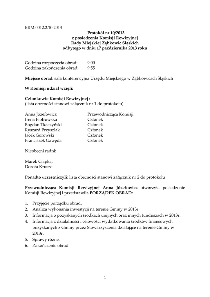 BRM.0012.2.10.2013 Protokół nr 10/2013 z posiedzenia Komisji Rewizyjnej Rady Miejskiej Ząbkowic Śląskich odbytego w dniu 17 października 2013 roku Godzina rozpoczęcia obrad: Godzina zakończenia obrad: 9:00 9:55 Miejsce obrad: sala konferencyjna Urzędu Miejskiego w Ząbkowicach Śląskich W Komisji udział wzięli: Członkowie Komisji Rewizyjnej : (lista obecności stanowi załącznik nr 1 do protokołu) Anna Józefowicz Irena Piotrowska Bogdan Tkaczyński Ryszard Przyszlak Jacek Górowski Franciszek Gawęda Przewodnicząca Komisji Członek Członek Członek Członek Członek Nieobecni radni: Marek Ciapka, Dorota Krusze Ponadto uczestniczyli: lista obecności stanowi załącznik nr 2 do protokołu Przewodnicząca Komisji Rewizyjnej Anna Józefowicz otworzyła posiedzenie Komisji Rewizyjnej i przedstawiła PORZĄDEK OBRAD: 1. 2. 3. 4. 5. 6. Przyjęcie porządku obrad. Analiza wykonania inwestycji na terenie Gminy w 2013r. Informacja o pozyskanych środkach unijnych oraz innych funduszach w 2013r. Informacja z działalności i celowości wydatkowania środków finansowych pozyskanych z Gminy przez Stowarzyszenia działające na terenie Gminy w 2013r. Sprawy różne. Zakończenie obrad. 1 Ad. Pkt. 1 Porządek obrad. Porządek obrad został przyjęty przez Komisję. Ad. pkt. 2 Analiza wykonania inwestycji na terenie Gminy w 2013 roku. Kierownik Wydziału IGP Wojciech Jankowski powiedział, że w budżecie są zapisane 54 zadania inwestycyjne w tym: - wodociągowanie wsi Sulisławice jest na etapie przygotowania dokumentacji technicznej dot. wymiany wodociągu i zasilania, - Olbrachcice Wielkie droga gruntowa do gruntów rolnych odbiór w tym miesiącu prawie całkiem zakończona, - Strąkowa droga dojazdowa do gruntów rolnych jest w trakcie realizacji i będzie przedłużona do końca listopada z uwagi na trudności z przebiegiem drogi i pozyskaniem terenu, - Braszowice droga dojazdowa do gruntów rolnych prace zakończone tylko zgłoszenie odbioru, - budowa chodnika na terenie gminy Ząbkowice Śląskie została rozstrzygnięta procedura przetargowa i będzie budowany chodnik koło Sądu i Biedronki na Os. Słonecznym, - dokumentacja na zadanie budowa parkingu na Os. xx- lecia nierozpoczęte związane z przekazaniem przez Spółdzielnię gruntu, - dokumentacja techniczna przebudowa ul. Prusa jest zakończona i przygotowane do realizacji, - dokumentacja techniczna przebudowa ul. Szpitalnej zakończone i odebrane, - przebudowa dojazdów do garaży przy ul. Głowackiego nie rozpoczęto przygotowania do ogłoszenia przetargu, - przebudowa dojazdów do garaży przy ul. Jasnej wykonana jest dokumentacja techniczna nie ogłoszono przetargu na realizację, - przebudowa drogi działka nr 20 obręb Sadlno Gmina dokumentacja wykonana, - przebudowa drogi 510 w miejscowości Zwrócona wykonana dokumentacja techniczna do przyszłego budżetu, - przebudowa ul. Prusa prowadzącej bezpośrednio na teren przemysłowy wykonana dokumentacja, - przebudowa ul. Ciasnej inwestycja zakończona, - przebudowa ul. Grunwaldzkiej trwa nadal zakończenie w listopadzie, - przebudowa ul. Kościuszki zakończona, - przebudowa ul. Okrężnej w trakcie realizacji, - przebudowa ul. Spokojnej zakończona, - uszczelnienie podbudowy ul. Ziębickiej zakończone, - podbudowa budynku gospodarczego wraz ze zmianą sposobu użytkowania w pomieszczeniach Straży Pożarnej w Olbrachcicach Wielkich działka jest w trakcie realizacji, - budowa boiska wielofunkcyjnego przy szkole podstawowej nr 2 dokumentacja jest zakończona i odebrana, - przebudowa kominu budynku Przedszkola w Tarnowie, 2 remont pomieszczeń zaplecza kuchennego w Szkole Podstawowej nr 2 zakończone, - wykonanie wewnętrznej sieci hydrantowej, oświetlenia ewakuacyjnego oraz urządzeń zapobiegających zadymianiu klatek schodowych w budynku Szkoły Podstawowej nr 1 trwa opracowanie dokumentacji technicznej jest to rozszerzony zakres, - wymiana pieca CO w budynku Przedszkola nr 2 została przygotowana dokumentacja na budowę kotłowni gazowej, - wymiana pokrycia dachowego na Przedszkolu nr 2 zakończona dokumentacja, - wymiana orynnowania wraz z instalacją gromową na budynku Gimnazjum Publicznego nr 2 w trakcie realizacji, - przebudowa kanalizacji na terenie miasta Ząbkowice Śląskie w trakcie realizacji, - utwardzenie terenu wraz z uporządkowaniem gospodarki wodno- deszczowej na ul. Dalekiej 13 umowa podpisana wykonawca powinien wejść w tym tygodniu lub przyszłym, - budowa kanalizacji deszczowej na terenie nowopowstałego osiedla domków jednorodzinnych jest to nowe zadanie chodzi o aktualizację dokumentacji trwają rozmowy z projektantem, - przebudowa kanalizacji deszczowej na działce nr 102 obręb centrum wraz z utwardzeniem terenu wykonano dokumentację i przekazano to Spółce Delfin - budowa placów zabaw na terenie wiejskim w Gminie Ząbkowice Śląskie inwestycje w trakcie zakończenia, - budowa placu przy ul. Kamienieckiej nierozpoczęta nie ma terenu, - budowa skate parku dokumentacja zakończona, - rewitalizacja parku miejskiego imienia Sybiraków w trakcie realizacji, - rewitalizacja parku w miejscowości Olbrachcice Wielkie nie rozpoczęto, - rewitalizacja terenów zielonych z ich uporządkowaniem wykonaniem części zielonych i miejsca postojowe na ul. Ciasnej wykonany jest na to projekt, - budowa oświetlenia ulicznego na terenie Gminy Ząbkowice Śląskie wycofanie z zadania z braku pieniędzy, - budowa oświetlenia na terenie miasta w trakcie realizacji , - budowa instalacji gazowej w Jaworku trwa opracowanie dokumentacji technicznej, - budowa schodów wewnętrznych z utwardzeniem terenu przy świetlicy wiejskiej w Pawłowicach zakończona, - budowa świetlicy wiejskiej w miejscowości Kluczowa dokumentacja jest opracowana, - remont pomieszczeń ZOK dokumentacja wykonana, - remont świetlicy wiejskiej w miejscowości Bobolice adaptacja pomieszczeń na świetlicę środowiskową inwestycja zakończona i zrealizowana, - remont świetlicy w