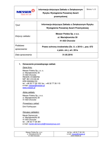 Informacja dotycząca Zakładu o Zwiększonym Strona 1 z 5 Ryzyku Wystąpienia Poważnej Awarii przemysłowej Informacja dotycząca Zakładu o Zwiększonym Ryzyku Tytuł: Wystąpienia Poważnej Awarii Przemysłowej Messer Polska Sp. z o.o. Dotyczy zakładu: ul. Maciejkowicka 30 41-503 Chorzów Podstawa Prawo ochrony środowiska (Dz. U. z 2016 r., poz. 672 opracowania: z późn. zm.), art. 261a Data opracowania: 31.05.2016 1. Oznaczenie prowadzącego zakład. Dane firmy: Messer Polska Sp. z o. o. ul. Maciejkowicka 30 41-503 Chorzów REGON: 810389784 NIP: 851-010-93-26 KRS 0000064153 tel.: +48 32 77 26 100; fax.: +48 32 77 26 115 e-mail: [email protected] www.messer.pl Adres zakładu: Messer Polska Sp. z o.o. ul. Maciejkowicka 30 41-503 Chorzów Prowadzący zakład: Dirk Fünfhausen Kierujący zakładem: Marek Demarczyk ul. Maciejkowicka 30 41-503 Chorzów tel.: +48 32 77 26 381 e-mail: [email protected] Messer Polska Sp. z o.o ul. Maciejkowicka 30 41-503 Chorzów tel./fax: +48 32 77 26 100 e-mail: [email protected] www.messer.pl Informacja dotycząca Zakładu o Zwiększonym Strona 2 z 5 Ryzyku Wystąpienia Poważnej Awarii przemysłowej 2. Kategoria zakładu Zgodnie z Rozporządzeniem Ministra Rozwoju z dnia 29 stycznia 2016 roku w sprawie rodzajów i ilości znajdujących się w zakładzie substancji niebezpiecznych, decydujących o zaliczeniu zakładu o zwiększonym lub dużym ryzyku wystąpienia poważnej awarii przemysłowej (Dz. U. 2016 poz. 138), Messer Polska Sp. z o.o. 41-503 Chorzów, ul. Maciejkowicka 30 zalicza się do kategorii zakładów o Zwiększonym Ryzyku Wystąpienia Poważnej Awarii Przemysłowej (ZZR). 3. Opis działalności zakładu. Przedmiotem działalności zakładu Messer Polska Sp. z o.o. 41-503 Chorzów, ul. Maciejkowicka 30 jest produkcja i dystrybucja gazów technicznych, specjalnych i medycznych oraz osprzętu dla technik gazowych. Zakład zajmuje się również produkcją acetylenu i mieszanek gazowych, które są następnie pełnione do butli i sprzedawane. Ponadto posiada Hurtownię Farmaceutyczną (HF), która zajmuje się sprzedażą tlenu medycznego, podtlenku azotu i innych gazów używanych w lecznictwie. 4. Charakterystyka składowanych na terenie zakładu substancji decydujących o zaliczeniu zakładu do zakładów o zwiększonym ryzyku wystąpienia poważnej awarii przemysłowej. NAZWA SUBSTANCJI Siarkowodór RODZAJ ZAGROŻENIA H330 - Wdychanie grozi śmiercią H220 - Skrajnie łatwopalny gaz H400 - Działa bardzo toksycznie na organizmy wodne Mieszaniny gazowe o różnorodnym składzie H330 - Wdychanie grozi śmiercią Chlor H330 - Działa toksycznie w następstwie wdychania H400 - Działa bardzo toksycznie na organizmy wodne H270 - może powodować lub intensyfikować pożar; utleniacz Tlenek węgla H331 - Działa toksycznie w następstwie wdychania H220 - Skrajnie łatwopalny gaz Dwutlenek siarki H331 - Działa toksycznie w następstwie wdychania Chlorowodór H331 - Działa toksycznie w następstwie wdychania Amoniak H331 – Działa toksycznie w następstwie wdychania Messer Polska Sp. z o.o ul. Maciejkowicka 30 41-503 Chorzów tel./fax: +48 32 77 26 100 e-mail: [email protected] www.messer.pl Strona 3 z 5 Informacja dotycząca Zakładu o Zwiększonym Ryzyku Wystąpienia Poważnej Awarii przemysłowej H221 - Gaz łatwopalny H410 - Działa bardzo toksycznie na organizmy wodne powodując długotrwałe skutki H270 - Może spowodować lub intensyfikować pożar; Tlen utleniacz H270 - Może spowodować lub intensyfikować pożar; Podtlenek azotu utleniacz Wodór H220 - Skrajnie łatwopalny gaz Acetylen H220 - Skrajnie łatwopalny gaz Propylen H220 - Skrajnie łatwopalny gaz Propan, butan i ich mieszaniny H220 - Skrajnie łatwopalny gaz Metan H220 - Skrajnie łatwopalny gaz Mieszanina gazowa: N2 90%, H2 10% H220 - Skrajnie łatwopalny gaz 5. Informacje dotyczące sposobów ostrzegania i postępowania społeczeństwa w przypadku wystąpienia awarii przemysłowej, uzgodnione z właściwymi organami Państwowej Straży Pożarnej. W przypadku wystąpienia awarii przemysłowej przewiduje się wykorzystanie specjalistycznych sił i środków Państwowej Straży Pożarnej. Zgodnie z zapisami Planu Zapobiegania Poważnym Awariom Przemysłowym oraz Instrukcji Bezpieczeństwa Pożarowego w przypadku wystąpienia poważnej awarii przemysłowej obowiązuje następująca procedura postępowania: - identyfikacja zagrożenia, - ogłaszanie alarmu, - wyłączenie zasilania, - gaszenie pożarów w zarodku, - zabezpieczenie obiektów i ewakuacja, - współpraca z PSP. Dla zapewnienia bezpieczeństwa zainstalowano w zakładzie system sygnalizacji pożaru, który gdy zostanie uaktywniony, automatycznie przekazuje informację na PSP. System sygnalizacji pożarowej obejmuje urządzenie alarmowe. Zasada działania systemu jest następująca: po naciśnięciu na dowolny przycisk ROP, automatycznie przekazywany jest odpowiedni sygnał do: - pomieszczenia ochrony, w którym zamontowano centralkę, - Państwowej Straży Pożarnej. Messer Polska Sp. z o.o ul. Maciejkowicka 30 41-503 Chorzów tel./fax: +48 32 77 26 100 e-mail: [email protected] www.messer.pl Informacja dotycząca Zakładu o Zwiększonym Strona 4 z 5 Ryzyku Wystąpienia Poważnej Awarii przemysłowej Dźwiękowy system ostrzegawczy to syrena elektryczna załączana przez pracownika ochrony w momencie podjęcia informacji o zadziałaniu systemu sygnalizacji przeciwpożarowej. W przypadku jakichkolwiek trudności w uruchomieniu sygnału, pracownik ochrony uruchamia syrenę ręczną. 6. Informacje o opracowaniu i przedłożeniu właściwym organom raportu o bezpieczeństwie Messer Polska Sp. z o.o. 41-503 Chorzów, ul. Maciejkowicka 30 dokonał zgłoszenia oraz przekazał Program Zapobiegania Awariom właściwym organom zgodnie z art. 250 ust. 1 ustawy Prawo ochrony środowiska (Dz. U. z 2016 r., poz. 672 z późn. zm.). 7. Informacje dotyczące głównych scenariuszy awarii przemysłowych oraz środków bezpieczeń