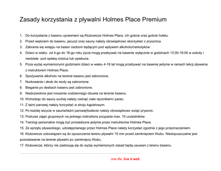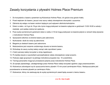 Zasady korzystania z pływalni Holmes Place Premium 1. Do korzystania z basenu uprawnieni są Klubowicze Holmes Place, ich goście oraz goście hotelu. 2. Przed wejściem do basenu, jacuzzi oraz sauny należy obowiązkowo skorzystać z prysznica. 3. Zabrania się wstępu na basen osobom będącym pod wpływem alkoholu/narkotyków. 4. Dzieci w wieku od 4-go do 16-go roku życia mogą przebywać na basenie wyłącznie w godzinach 13:00-16:00 w soboty i niedziele pod opieką rodzica lub opiekuna. 5. Poza wyżej wymienionymi godzinami dzieci w wieku 4-16 lat mogą przebywać na basenie jedynie w ramach lekcji pływania z instruktorem Holmes Place. 6. Spożywanie alkoholu na terenie basenu jest zabronione. 7. Nurkowanie i skoki do wody są zabronione. 8. Bieganie po deskach basenu jest zabronione. 9. Niedozwolone jest noszenie codziennego obuwia na terenie basenu. 10. Wchodząc do sauny suchej należy owinąć ciało ręcznikiem/ pareo. 11. Z łaźni parowej należy korzystać w stroju kąpielowym. 12. Po każdej wizycie w saunie/łaźni parowej/toalecie należy obowiązkowo wziąć prysznic. 13. Podczas zajęć grupowych na jednego instruktora przypada max. 15 uczestników. 14. Treningi personalne mogą być prowadzone jedynie przez instruktorów Holmes Place. 15. Ze sprzętu pływackiego, udostępnianego przez Holmes Place należy korzystać zgodnie z jego przeznaczeniem. 16. Klubowicze zobowiązani są do opuszczenia terenu pływalni 15 min przed zamknięciem Klubu. Niedopuszczalne jest pozostawanie na terenie pływalni po zamknięciu Klubu. 17. Klubowicze, którzy nie zastosują się do wyżej wymienionych zasad będą usuwani z terenu basenu. one life. live it well. 18. Wszyscy Klubowicze oraz ich goście zobowiązani są do przestrzegania powyższych zasad. 19. Kwestie sporne lub nieuregulowane rozstrzyga Manager Klubu. one life. live it well.