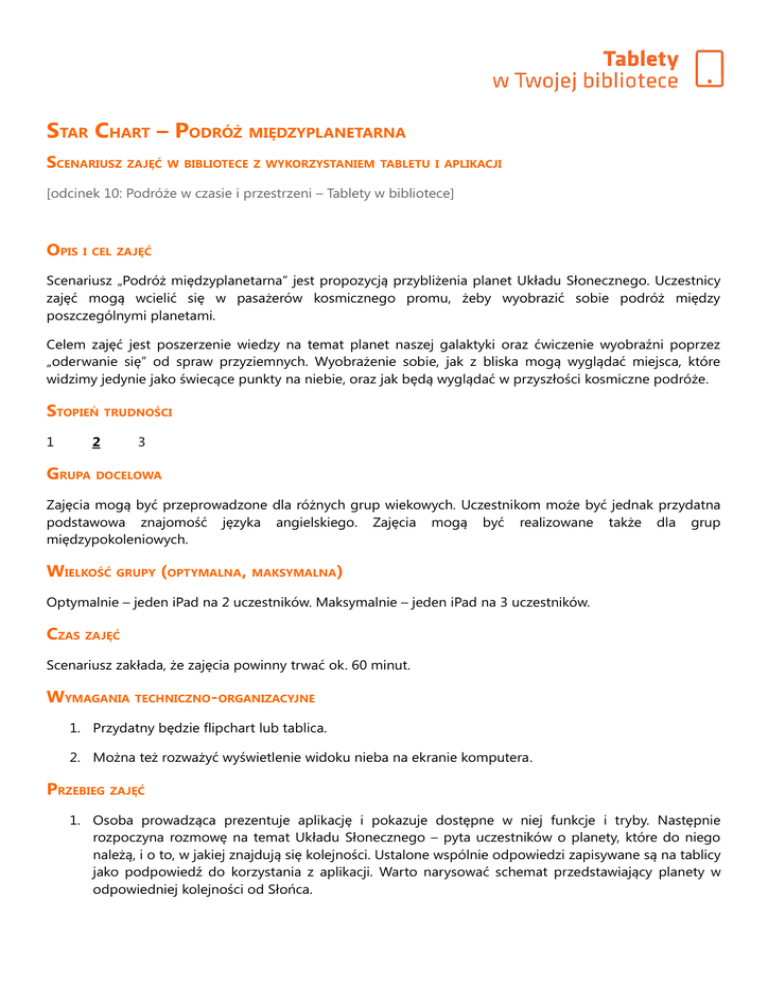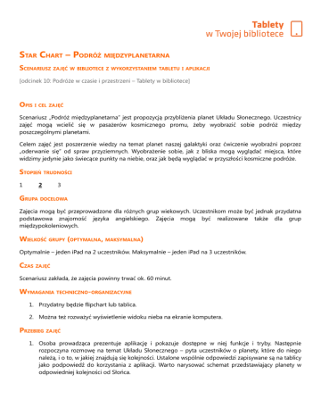 STAR CHART – PODRÓŻ MIĘDZYPLANETARNA SCENARIUSZ ZAJĘĆ W BIBLIOTECE Z WYKORZYSTANIEM TABLETU I APLIKACJI [odcinek 10: Podróże w czasie i przestrzeni – Tablety w bibliotece] OPIS I CEL ZAJĘĆ Scenariusz „Podróż międzyplanetarna” jest propozycją przybliżenia planet Układu Słonecznego. Uczestnicy zajęć mogą wcielić się w pasażerów kosmicznego promu, żeby wyobrazić sobie podróż między poszczególnymi planetami. Celem zajęć jest poszerzenie wiedzy na temat planet naszej galaktyki oraz ćwiczenie wyobraźni poprzez „oderwanie się” od spraw przyziemnych. Wyobrażenie sobie, jak z bliska mogą wyglądać miejsca, które widzimy jedynie jako świecące punkty na niebie, oraz jak będą wyglądać w przyszłości kosmiczne podróże. STOPIEŃ TRUDNOŚCI 1 2 3 GRUPA DOCELOWA Zajęcia mogą być przeprowadzone dla różnych grup wiekowych. Uczestnikom może być jednak przydatna podstawowa znajomość języka angielskiego. Zajęcia mogą być realizowane także dla grup międzypokoleniowych. WIELKOŚĆ GRUPY (OPTYMALNA, MAKSYMALNA) Optymalnie – jeden iPad na 2 uczestników. Maksymalnie – jeden iPad na 3 uczestników. CZAS ZAJĘĆ Scenariusz zakłada, że zajęcia powinny trwać ok. 60 minut. WYMAGANIA TECHNICZNO-ORGANIZACYJNE 1. Przydatny będzie flipchart lub tablica. 2. Można też rozważyć wyświetlenie widoku nieba na ekranie komputera. PRZEBIEG ZAJĘĆ 1. Osoba prowadząca prezentuje aplikację i pokazuje dostępne w niej funkcje i tryby. Następnie rozpoczyna rozmowę na temat Układu Słonecznego – pyta uczestników o planety, które do niego należą, i o to, w jakiej znajdują się kolejności. Ustalone wspólnie odpowiedzi zapisywane są na tablicy jako podpowiedź do korzystania z aplikacji. Warto narysować schemat przedstawiający planety w odpowiedniej kolejności od Słońca. 2. Po wypisaniu wszystkich planet, osoba prowadząca zachęca uczestników do wyszukania ich na mapie nieba. Powinna też dopilnować, żeby każdy miał okazję samodzielnie „pobawić się” aplikacją – przeglądać mapę i dowiedzieć się, jak działa. 3. Każda z grup proszona jest o znalezienie jak największej ilości planet. Jeśli odnalezienie którejś z planet stanowi problem, osoba prowadząca powinna podpowiedzieć, jak właściwie skorzystać z wyszukiwarki albo listy planet. 4. Po czasie poświęconym na swobodne przeglądanie mapy nieba lub w momencie, gdy wszystkie planety zostaną odnalezione, osoba prowadząca powinna zachęcić uczestników do odbycia wirtualnej podróży. Prosi ich, by wyobrazili sobie, że wsiadają w kosmiczny prom i mogą wyruszyć na wybraną przez siebie planetę należącą do Układu Słonecznego. Którą planetę wybiorą jako pierwszą? Jak długo będzie trwała podróż? Co zobaczą, gdy dotrą na miejsce? W odpowiedzi na te pytania pomóc mogą szczegółowe informacje dotyczące wybranej planety dostępne w aplikacji. 5. Trasę podróży można narysować na naszkicowanym wcześniej układzie planet, dopisując czas potrzebny na pokonanie poszczególnych odcinków podróży. Można zachęcić uczestników, żeby poszukali w Internecie informacji o czasie i przebiegu podróży sond, które zostały wysłane do obserwacji planet Układu Słonecznego. 6. Po zakończeniu międzyplanetarnej podróży warto zapytać uczestników o ich wrażenia. Czy w prawdziwym życiu też chcieliby wziąć udział w takiej podróży? Czy sądzą, że kiedyś będzie to możliwe? A jeśli tak, to w jaki sposób może to wpłynąć na ludzkość i Ziemię? 7. Osoba prowadząca może zachęcić uczestników do skorzystania z trybu rozszerzonej rzeczywistości w aplikacji i obserwacji nieba. 8. Dobrze jest też zastanowić się wspólnie, do jakich jeszcze celów można wykorzystać aplikację Star Chart. Wypracowane pomysły mogą być inspiracją do kolejnych astronomicznych zajęć. MOŻLIWE MODYFIKACJE ZAJĘĆ 1. Zajęcia można połączyć z obserwacją nocnego nieba w rzeczywistości. 2. Oprócz „zwiedzania” planet Układu Słonecznego możliwe jest wyszukiwanie i poznawanie gwiazd i innych obiektów niebieskich. Tak samo przy ćwiczeniu wyobraźni – można skupić się na innych galaktykach i zastanowić się nad tym, ile ich istnieje we Wszechświecie, jak są zbudowane i czy może występować na nich życie. Warto poprosić uczestników o wyszukanie w Internecie informacji na ten temat. OCZEKIWANE REZULTATY ZAJĘĆ I SPOSOBY WERYFIKACJI Rezultatem zajęć będzie poszerzenie wiedzy na temat planet Układu Słonecznego, którą można sprawdzić, organizując konkurs wiedzy lub obserwując zainteresowanie aplikacją po przeprowadzeniu zajęć. Projekt „Tablety w Twojej bibliotece” jest elementem Programu Rozwoju Bibliotek, który od 2009 roku realizuje Fundacja Rozwoju Społeczeństwa Informacyjnego. Ten materiał edukacyjny dostępny jest na licencji Creative Commons CC BY-SA 3.0 Polska. Pełna treść licencji znajduje się na stronie: http://creativecommons.org/licenses/by-sa/3.0/pl