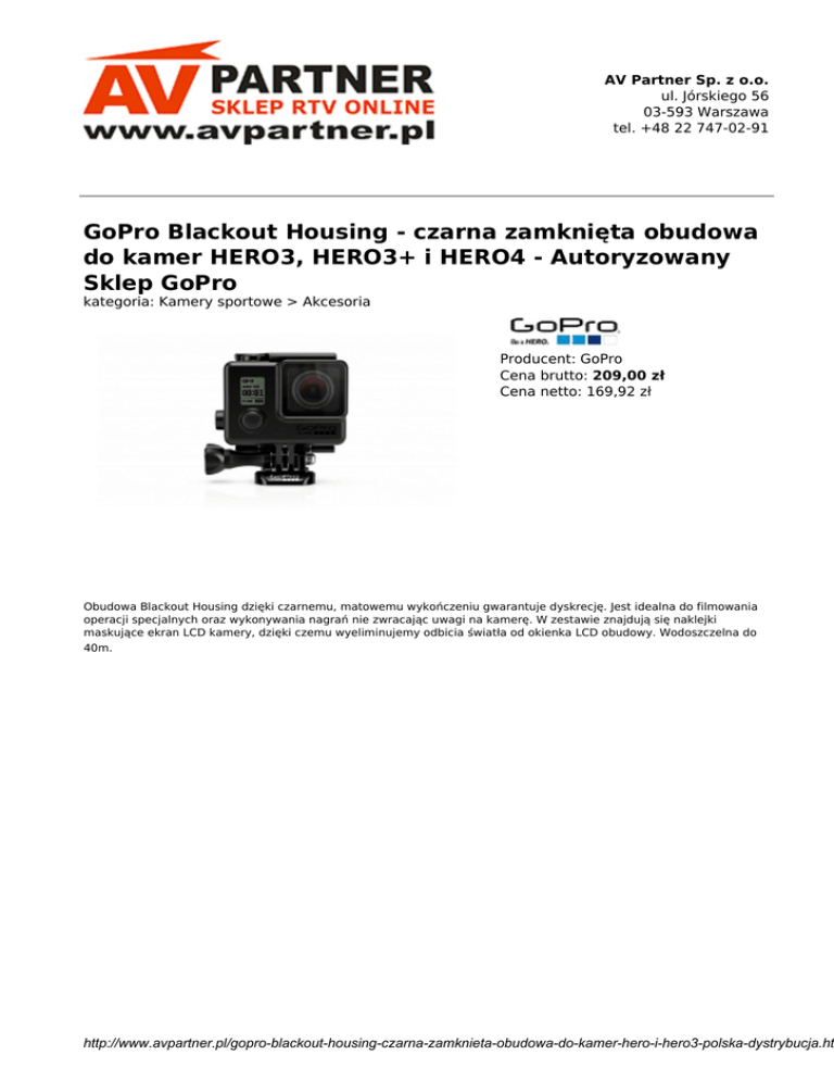 AV Partner Sp. z o.o. ul. Jórskiego 56 03-593 Warszawa tel. +48 22 747-02-91 GoPro Blackout Housing - czarna zamknięta obudowa do kamer HERO3, HERO3+ i HERO4 - Autoryzowany Sklep GoPro kategoria: Kamery sportowe > Akcesoria Producent: GoPro Cena brutto: 209,00 zł Cena netto: 169,92 zł Obudowa Blackout Housing dzięki czarnemu, matowemu wykończeniu gwarantuje dyskrecję. Jest idealna do filmowania operacji specjalnych oraz wykonywania nagrań nie zwracając uwagi na kamerę. W zestawie znajdują się naklejki maskujące ekran LCD kamery, dzięki czemu wyeliminujemy odbicia światła od okienka LCD obudowy. Wodoszczelna do 40m. http://www.avpartner.pl/gopro-blackout-housing-czarna-zamknieta-obudowa-do-kamer-hero-i-hero3-polska-dystrybucja.ht