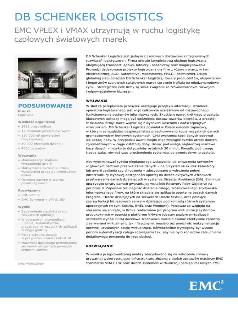DB SCHENKER LOGISTICS EMC VPLEX i VMAX utrzymują w ruchu logistykę czołowych światowych marek DB Schenker Logistics jest jednym z czołowych dostawców zintegrowanych rozwiązań logistycznych. Firma oferuje kompleksową obsługę logistyczną obejmującą transport lądowy, lotniczy i oceaniczny oraz magazynowanie. Prowadzi dedykowane projekty logistyczne dla firm z różnych branż, w tym elektronicznej, AGD, Automotive, maszynowej, FMCG i chemicznej. Dzięki globalnej sieci połączeń DB Schenker Logistics, towary producentów, eksporterów i importerów czołowych światowych marek sprawnie trafiają na międzynarodowe rynki. Strategiczne cele firmy są silnie związane ze zrównoważonym rozwojem i odpowiedzialnym biznesem. PODSUMOWANIE Branża Logistyka Wielkość organizacji •1932 pracowników •17 terminali przeładunkowych •110 000 m2 powierzchni magazynowej •39 000 przesyłek dziennie •4000 pojazdów Wyzwania •Minimalizacja skutków wystąpienia awarii •Maksymalne skrócenie czasu wznawiania pracy po ewentualnej awarii •Ochrona danych w wyniku poważnej awarii Rozwiązania •EMC VPLEX •EMC Symmetrix VMAX 10K Wyniki •Zapewnienie ciągłości pracy wszystkich aplikacji •W poważnych przypadkach – pełne, automatyczne przywrócenie wszystkich aplikacji w ciągu godziny •Pełna ochrona danych w przypadku awarii i katastrof •Możliwość dowolnego przenoszenia serwerów wirtualnych pomiędzy centrami danych OPIS WDROŻENIA WYZWANIE W ślad za przepływem przesyłek następuje przepływ informacji. Działanie operatora logistycznego jest więc całkowicie uzależnione od niezawodnego funkcjonowania systemów informatycznych. Skutkiem nawet krótkiego przestoju kluczowych aplikacji mogą być opóźnienia dostaw towarów klientów, a przestój w działaniu firmy, może wiązać się z wysokimi kosztami i nadszarpniętym wizerunkiem. DB Schenker Logistics posiadał w Polsce ośrodek zapasowy, w którym ze względów bezpieczeństwa przechowywano kopie wszystkich danych gromadzonych w firmowych systemach. Cykl tworzenia kopii danych odbywał się każdej nocy. W przypadku awarii mogło więc wystąpić ryzyko utraty danych zgromadzonych w ciągu ostatniej doby. Biorąc pod uwagę najbardziej wrażliwe bazy danych – ryzyko to dotyczyłoby ostatnich 30 minut. Ponadto pod uwagę trzeba wziąć również czas uruchomienia systemów po ewentualnym przestoju. Aby wyeliminować ryzyko nieplanowego wyłączania lub zniszczenia serwerów w głównym centrum przetwarzania danych – na przykład na skutek katastrofy lub awarii zasilania czy chłodzenia – zdecydowano o wdrożeniu pełnej infrastruktury wysokiej dostępności opartej na dwóch aktywnych ośrodkach przetwarzania danych działających w systemie Disaster Avoidance (DA). Eliminuje ona ryzyko utraty danych gwarantując wskaźnik Recovery Point Objective na poziomie 0. Zapewnia też ciągłość działania całego, zróżnicowanego środowiska informatycznego firmy, na które składają się aplikacje oparte na bazach danych Progress i Oracle działających na serwerach Oracle SPARC, oraz pełniące szereg funkcji biznesowych serwery działające pod kontrolą różnych systemów operacyjnych (w tym Solaris, RHEL oraz Windows). Ponieważ ze względu na starzenie się sprzętu, w firmie realizowano już program wirtualizacji systemów produkcyjnych w oparciu o platformę VMware (obecny poziom wirtualizacji serwerów wynosi 85%) docelowe środowisko musiało działać efektywnie zarówno z serwerami wirtualnymi, jak i fizycznymi, musiało też umożliwić maksymalizację korzyści uzyskanych dzięki wirtualizacji. Równocześnie wymagany był wysoki poziom automatyzacji całego rozwiązania tak, aby nie było konieczne zatrudnianie dodatkowego personelu do jego obsługi. ROZWIĄZANIE W wyniku przeprowadzonej analizy zdecydowano się na wdrożenie chmury prywatnej wykorzystującej infrastrukturę złożoną z dwóch zestawów macierzy EMC Symmetrix VMAX 10k oraz dwóch systemów wirtualizacji pamięci masowych EMC VPLEX pracujących w układzie Metro (po jednym zestawie w każdym z centrów przetwarzania). Obydwa centra połączono dwoma niezależnymi łączami o łącznej przepustowości 38 Gb/s, gwarantowanym opóźnieniu poniżej 1 ms i gwarantowanej dostępności na poziome SLA = 99,95%. Cały system funkcjonuje jak pojedynczy, wirtualny system pamięci masowych, co umożliwiło uproszczenie aplikacji warstw wyższych. Wszystkie zapisy są realizowane równolegle i praktycznie równocześnie na obydwu macierzach, dzięki czemu ryzyko utraty danych w przypadku awarii zostało sprowadzone do zera. Także przełączanie aplikacji pomiędzy ośrodkiem głównym a zapasowym – zarówno ręczne, jak i automatycznie – nie wymaga żadnych zmian konfiguracji. W oparciu o mechanizmy VMware działające usługi można przenosić pomiędzy serwerami z jednego centrum do drugiego w ciągu kilku sekund w sposób całkowicie „Szukaliśmy rozwiązania, które zapewniłoby nam wysoką dostępność zarówno serwerów fizycznych, jak i wirtualnych, a przy tym nie wymagałoby zatrudniania dodatkowego personelu do jego obsługi. Rozwiązanie EMC w pełni spełniło nasze oczekiwania”. PIOTR KAŁUŻNY, ARCHITEKT SYSTEMÓW INFORMATYCZNYCH, DB SCHENKER LOGISTICS niedostrzegalny dla korzystających z nich użytkowników. Nie ma też potrzeby cyklicznego testowania poprawności działania mechanizmów wysokiej dostępności. Są one rutynowo wykorzystywane przy okazji innych działań, na przykład przy przenoszeniu usług pomiędzy serwerami w celu lepszego zrównoważenia obciążenia, wyłączaniu serwerów fizycznych w celu przeprowadzenia prac konserwacyjnych itp. REZULTATY KONTAKT Więcej informacji na temat produktów, usług i rozwiązań EMC można uzyskać u polskich partnerów firmy EMC, w biurze EMC Poland lub na stronie www.EMC.com.pl Obecnie DB Schenker Logistics dysponuje wirtualnym centrum przetwarzan
