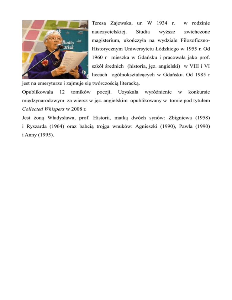 Teresa Zajewska, ur. W 1934 r, w rodzinie nauczycielskiej. zwieńczone Studia wyższe magisterium, ukończyła na wydziale FilozoficznoHistorycznym Uniwersytetu Łódzkiego w 1955 r. Od 1960 r mieszka w Gdańsku i pracowała jako prof. szkół średnich (historia, jęz. angielski) w VIII i VI liceach ogólnokształcących w Gdańsku. Od 1985 r jest na emeryturze i zajmuje się twórczością literacką. Opublikowała 12 tomików poezji. Uzyskała wyróżnienie w konkursie międzynarodowym za wiersz w jęz. angielskim opublikowany w tomie pod tytułem Collected Whispers w 2008 r. Jest żoną Władysława, prof. Historii, matką dwóch synów: Zbigniewa (1958) i Ryszarda (1964) oraz babcią trojga wnuków: Agnieszki (1990), Pawła (1990) i Anny (1995).