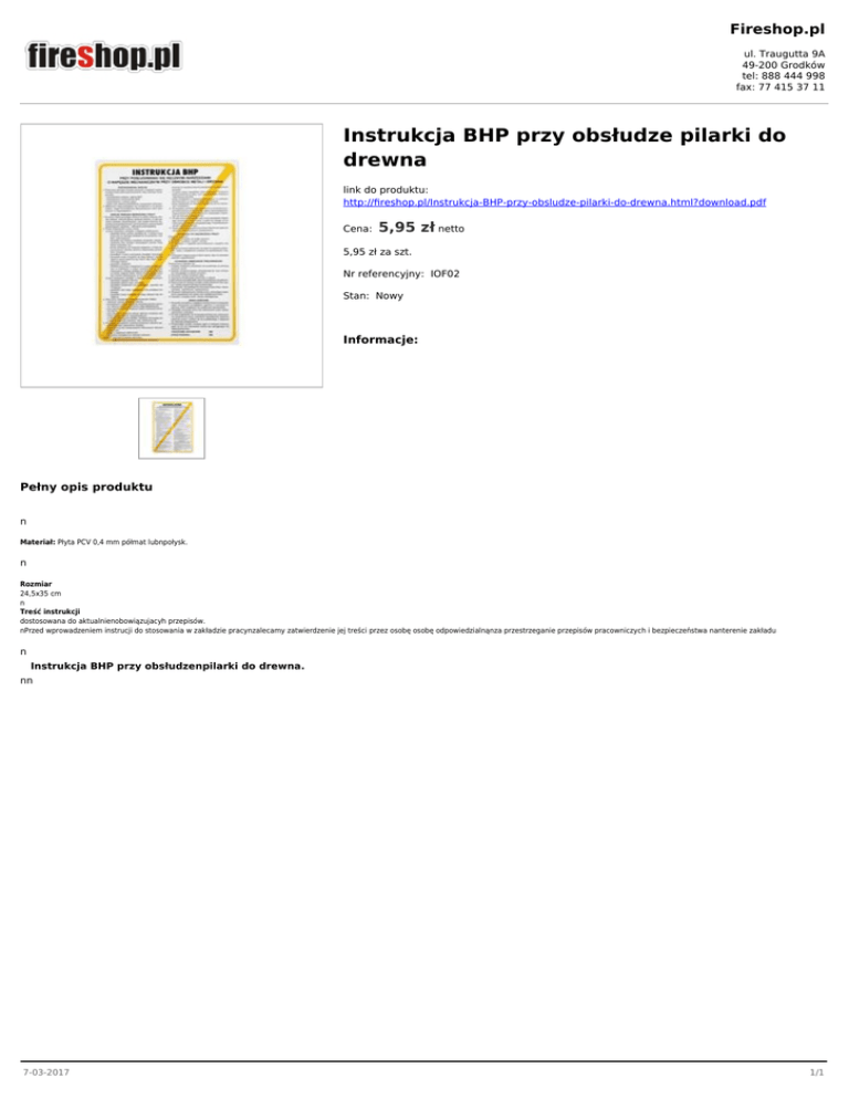 Fireshop.pl ul. Traugutta 9A 49-200 Grodków tel: 888 444 998 fax: 77 415 37 11 Instrukcja BHP przy obsłudze pilarki do drewna link do produktu: http://fireshop.pl/Instrukcja-BHP-przy-obsludze-pilarki-do-drewna.html?download.pdf Cena: 5,95 zł netto 5,95 zł za szt. Nr referencyjny: IOF02 Stan: Nowy Informacje: Pełny opis produktu n Materiał: Płyta PCV 0,4 mm półmat lubnpołysk. n Rozmiar 24,5x35 cm n Treść instrukcji dostosowana do aktualnienobowiązujacyh przepisów. nPrzed wprowadzeniem instrucji do stosowania w zakładzie pracynzalecamy zatwierdzenie jej treści przez osobę osobę odpowiedzialnąnza przestrzeganie przepisów pracowniczych i bezpieczeństwa nanterenie zakładu n Instrukcja BHP przy obsłudzenpilarki do drewna. nn 7-03-2017 1/1