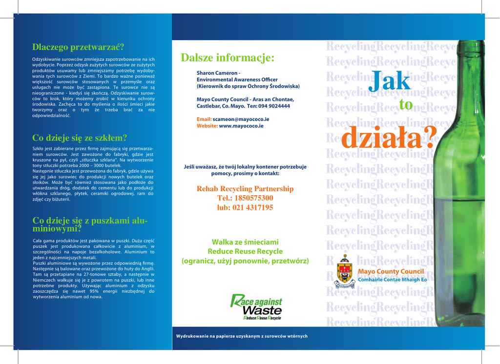 Dlaczego przetwarzać? Odzyskiwanie surowców zmniejsza zapotrzebowanie na ich wydobycie. Poprzez odzysk zużytych surowców ze zużytych produktów usuwamy lub zmniejszamy potrzebę wydobywania tych surowców z Ziemi. To bardzo ważne ponieważ większość surowców stosowanych w przemyśle oraz usługach nie może być zastąpiona. Te surowce nie są nieograniczone - kiedyś się skończą. Odzyskiwanie surowców to krok, który możemy zrobić w kierunku ochrony środowiska. Zachęca to do myślenia o ilości śmieci jakie tworzymy oraz o tym że trzeba brać za nie odpowiedzialność. Dalsze informacje: Sharon Cameron Environmental Awareness Officer (Kierownik do spraw Ochrony Środowiska) Mayo County Council - Aras an Chontae, Castlebar, Co. Mayo. Тел: 094 9024444 Email: [email protected] Website: www.mayococo.ie Co dzieje się ze szkłem? Szkło jest zabierane przez firmę zajmującą się przetwarzaniem surowców. Jest zawożone do fabryki, gdzie jest kruszone na pył, czyli „stłuczka szklana”. Na wytworzenie tony stłuczki potrzeba 2000 – 3000 butelek. Następnie stłuczka jest przewożona do fabryk, gdzie używa się jej jako surowiec do produkcji nowych butelek oraz słoików. Może być również stosowana jako podłoże do utwardzania dróg, dodatek do cementu lub do produkcji włókna szklanego, płytek, ceramiki ogrodowej, ram do zdjęć czy biżuterii. Jeśli uważasz, że twój lokalny kontener potrzebuje pomocy, prosimy o kontakt: Rehab Recycling Partnership Tel.: 1850575300 lub: 021 4317195 Co dzieje się z puszkami aluminiowymi? Cała gama produktów jest pakowana w puszki. Duża część puszek jest produkowana całkowicie z aluminium, w szczególności na napoje bezalkoholowe. Aluminium to jeden z najcenniejszych metali. Puszki aluminiowe są wywożone przez odpowiednią firmę. Następnie są balowane oraz przewożone do huty do Anglii. Tam są przetapiane na 27-tonowe sztaby, a następnie w Niemczech wałkuje się je z powrotem na puszki, lub inne potrzebne produkty. Używając aluminium z odzysku zaoszczędza się nawet 95% energii niezbędnej do wytworzenia aluminium od nowa. Walka ze śmieciami Reduce Reuse Recycle (ogranicz, użyj ponownie, przetwórz) RecyclingRecyclingRecycling RecyclingRecyclingRecycling RecyclingRecyclingRecycling RecyclingRecyclingRecycling to RecyclingRecyclingRecycling RecyclingRecyclingRecycling RecyclingRecyclingRecycling RecyclingRecyclingRecycling RecyclingRecyclingRecycling RecyclingRecyclingRecycling RecyclingRecyclingRecycling RecyclingRecyclingRecycling RecyclingRecyclingRecycling RecyclingRecyclingRecycling RecyclingRecyclingRecycling Mayo County Council RecyclingRecyclingRecycling RecyclingRecyclingRecycling RecyclingRecyclingRecycling RecyclingRecyclingRecycling Jak działa? Comhairle Contae Mhaigh Eo Wydrukowanie na papierze uzyskanym z surowców wtórnych Tym produktom dziękujemy! Mayo County Council zapewnia kontenery na surowce wtórne (szkło oraz puszki) w miastach oraz wioskach w całym okręgu. Kontenery posiadają przegrody na butelki niebarwione, zielone oraz brązowe jak i aluminiowe puszki po napojach. Więc jak możesz korzystać z pobliskich kontenerów? SZKŁO • Segregacja szkła według koloru, czyli szkła niebarwionego, zielonego oraz brązowego jest bardzo ważna. Punkty skupu nie przyjmą pomieszanych butelek. • Szkło niebieskie można wrzucić do szkła zielonego, a szkło niebarwione z barwioną powłoką może być wrzucone razem ze szkłem niebarwionym ponieważ kolor spali się w procesie odzysku. • Pamiętaj, że nie tylko butelki mogą być przetwarzane. Pamiętaj również o słoikach używanych w kuchni, takich jak po sosach czy majonezie. • Prosimy o wypłukanie szkła przed wrzuceniem do kontenera. • Usuwanie papierowych nalepek nie jest konieczne, ale konieczne jest usunięcie folii, korków czy pierścieni Puszki aluminiowe • Punkt recyclingowy posiada oddzielny kontener na puszki aluminiowe. • Pod uwagę bierzemy puszki po napojach alkoholowy jak i bezalkoholowych. • Prosimy o zgniecenie puszek przed wrzuceniem do kontenera • Nie wrzucamy butelek z plastiku i śmieci. Prosimy o zabranie plastikowych toreb oraz pudełek do domu • Prosimy nie wrzucać szyb samochodowych, luster czy szkła okiennego • Prosimy nie wrzucać kryształu, naczyń, porcelany, ekranów telewizorów, szklanek czy żarówek • Prosimy nie wrzucać stalowych puszek, takich jak po jedzeniu • Prosimy nie wrzucać tacek foliowych oraz folii aluminiowej Pełna lista rozmieszczenia kontenerów dostępna jest na stronie: www.mayococo.ie Kontenery są tylko do użytku domowego. Używanie tych kontenerów przez bary, kluby, hotele oraz restauracje jest zabronione. Przetwarzane pozostałych przedmiotów codziennego użytku W celu przetwarzania innych przedmiotów codziennego użytku prosimy odwiedzić śmietniska w Derrinumera przy trasie Castlebar – Newport lub Rathroeen, na drodze do Killala, Ballina, lub skontaktować się z firmą wywożącą śmieci z Twojego domu. Dlaczego powinieneś korzystać z pobliskich kontenerów? Co to jest przetwarzanie surowców wtórnych? Przetwarzane surowców wtórnych to przetwarzanie zużytych produktów, które dostarczają podstawowych surowców do wytworzenia nowych produktów. Kiedy zanosisz produkty do kontenera to jeszcze nie jest proces odzyskiwania surowców mimo że zostały dostarczone do punktu. Proces jest zakończony w momencie gdy kupujemy produkty wykonane z odzyskanych surowców.