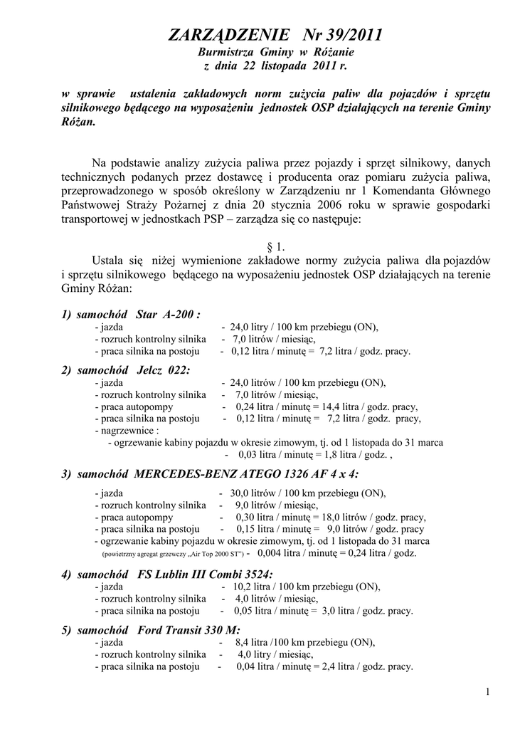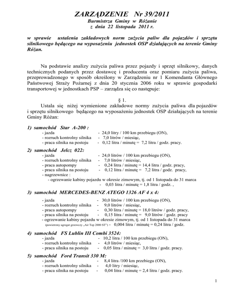 ZARZĄDZENIE Nr 39/2011 Burmistrza Gminy w RóŜanie z dnia 22 listopada 2011 r. w sprawie ustalenia zakładowych norm zuŜycia paliw dla pojazdów i sprzętu silnikowego będącego na wyposaŜeniu jednostek OSP działających na terenie Gminy RóŜan. Na podstawie analizy zuŜycia paliwa przez pojazdy i sprzęt silnikowy, danych technicznych podanych przez dostawcę i producenta oraz pomiaru zuŜycia paliwa, przeprowadzonego w sposób określony w Zarządzeniu nr 1 Komendanta Głównego Państwowej StraŜy PoŜarnej z dnia 20 stycznia 2006 roku w sprawie gospodarki transportowej w jednostkach PSP – zarządza się co następuje: § 1. Ustala się niŜej wymienione zakładowe normy zuŜycia paliwa dla pojazdów i sprzętu silnikowego będącego na wyposaŜeniu jednostek OSP działających na terenie Gminy RóŜan: 1) samochód Star A-200 : - jazda - rozruch kontrolny silnika - praca silnika na postoju - 24,0 litry / 100 km przebiegu (ON), - 7,0 litrów / miesiąc, - 0,12 litra / minutę = 7,2 litra / godz. pracy. 2) samochód Jelcz 022: - jazda - 24,0 litrów / 100 km przebiegu (ON), - rozruch kontrolny silnika - 7,0 litrów / miesiąc, - praca autopompy - 0,24 litra / minutę = 14,4 litra / godz. pracy, - praca silnika na postoju - 0,12 litra / minutę = 7,2 litra / godz. pracy, - nagrzewnice : - ogrzewanie kabiny pojazdu w okresie zimowym, tj. od 1 listopada do 31 marca - 0,03 litra / minutę = 1,8 litra / godz. , 3) samochód MERCEDES-BENZ ATEGO 1326 AF 4 x 4: - jazda - 30,0 litrów / 100 km przebiegu (ON), - rozruch kontrolny silnika - 9,0 litrów / miesiąc, - praca autopompy - 0,30 litra / minutę = 18,0 litrów / godz. pracy, - praca silnika na postoju - 0,15 litra / minutę = 9,0 litrów / godz. pracy - ogrzewanie kabiny pojazdu w okresie zimowym, tj. od 1 listopada do 31 marca (powietrzny agregat grzewczy „Air Top 2000 ST”) - 0,004 litra / minutę = 0,24 litra / godz. 4) samochód FS Lublin III Combi 3524: - jazda - rozruch kontrolny silnika - praca silnika na postoju - 10,2 litra / 100 km przebiegu (ON), - 4,0 litrów / miesiąc, - 0,05 litra / minutę = 3,0 litra / godz. pracy. 5) samochód Ford Transit 330 M: - jazda - rozruch kontrolny silnika - praca silnika na postoju - 8,4 litra /100 km przebiegu (ON), 4,0 litry / miesiąc, 0,04 litra / minutę = 2,4 litra / godz. pracy. 1 6) samochód Ford Transit 350 M: - jazda - rozruch kontrolny silnika - praca silnika na postoju - 11,7 litra / 100 km przebiegu (ON), - 4,0 litry / miesiąc, - 0,05 litra / minutę = 3,0 litra / godz. pracy. 7) samochód Ford Transit VAN 350 M: - jazda - rozruch kontrolny silnika - praca silnika na postoju - 10,9 litra / 100 km przebiegu (ON), - 4,0 litry / miesiąc, - 0,05 litra / minutę = 3,0 litra / godz. pracy. 8) motopompa M8/8-1 „SPEC-POś” : - praca - rozruch kontrolny silnika - 7,5 litra / godz. pracy (etylina), 1,5 litra / miesiąc. 9) motopompa P0-5: - praca - 12,0 litrów / godz. pracy (etylina), - rozruch kontrolny silnika - 2,0 litry / miesiąc. 10) motopompa pływająca „NIAGARA” : - praca - 1,0 litr / godz. pracy (etylina) . 11) pompa szlamowa WT 40X, z silnikiem HONDA, model GX 340K1: - praca - 3,0 litry / godz. pracy (etylina). 12. pompa szlamowa samozasysająca PTX 301T, z silnikiem ROBINSUBARU , model EX27: - praca - 2,4 litra / godz. pracy (etylina). 13) piła spalinowa do drzewa „Husqvarna 51”: - praca - 1,0 litr / godz. pracy (etylina) . 14) piła spalinowa do drzewa „STIHL MS 361” : - praca - 1,0 litr / godz. pracy (etylina). 15. piła spalinowa do drzewa „STIHL MS 440” : - praca - 1,2 litra / godz. pracy (etylina). 16. piła spalinowa ratownicza „STIHL MS 460 R” : - praca - 1,5 litra / godz. pracy (etylina). 16) piła spalinowa do cięcia betonu i stali: - praca - 1,0 litr / godz. pracy (etylina). 17) urządzenie hydrauliczne „LUCAS” : - praca - 1,0 litr / godz. pracy (etylina). 18) agregat prądotwórczy, typ EA 2000 IP54: - praca - 1,0 litr / godz. pracy (etylina), 19) agregat wodny wysokociśnieniowy, typ As 150b: - praca - 1,5 litra / godz. pracy (etylina), 20) agregat wodny wysokociśnieniowy, typ AW 40/40 Jadar, z silnikiem HONDA GX160: - praca - 1,5 litra / godz. pracy (etylina). 21) łódź pneumatyczna, typ RIB 450, z silnikiem zaburtowym BF 30: - praca - 8,6 litra /godz. pracy (etylina). 2 § 2. Ustala się zasady rozliczania zuŜycia paliw: 1) UŜytkownicy pojazdów i sprzętu silnikowego zobowiązaniu są prowadzić dokładną ewidencję zuŜycia paliw ciekłych przez poszcze3gólne pojazdy i urządzenia - na kartach pracy wydanych przez Urząd Gminy w RóŜanie. 2) KaŜda ilość paliwa zakupionego na pojazd lub sprzęt silnikowy powinna być Odnotowana: - w karcie pracy pojazdu, - w karcie pracy sprzętu silnikowego. 3) Ustala się systemowy okres rozliczeniowy: - 30 dni z tolerancją (+ -) 5 dni, w cyklu miesięcznym – dla pojazdów, - 90 dni z tolerancją (+ -) 5 dni, w cyklu kwartalnym – dla sprzętu silnikowego. 4) Podstawę do rozliczenia zuŜycia paliwa stanowi wskaźnik normy eksploatacyjnej określony w § 1. 5) Rozliczenie ilości zuŜytego w okresie rozliczeniowym naleŜy dokonywać z dokładnością do 0,1 litra. § 3. Wykonanie zarządzenia powierza się Sekretarzowi Gminy. § 4. Traci moc Zarządzenie Nr 178/10 Burmistrza Gminy w RóŜanie z dnia 08 czerwca 2010 roku w sprawie ustalenia zakładowych norm zuŜycia paliw dla pojazdów i sprzętu silnikowego będącego na wyposaŜeniu jednostek OSP działających na terenie Gminy RóŜan. § 5. Zarządzenie wchodzi w Ŝycie z dniem 1 grudnia 2011 roku. 3
