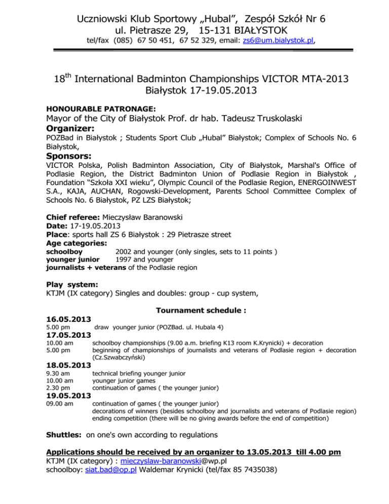 Uczniowski Klub Sportowy „Hubal”, Zespół Szkół Nr 6 ul. Pietrasze 29, 15-131 BIAŁYSTOK tel/fax (085) 67 50 451, 67 52 329, email: [email protected], 18th International Badminton Championships VICTOR MTA-2013 Białystok 17-19.05.2013 HONOURABLE PATRONAGE: Mayor of the City of Białystok Prof. dr hab. Tadeusz Truskolaski Organizer: POZBad in Białystok ; Students Sport Club „Hubal” Białystok; Complex of Schools No. 6 Białystok, Sponsors: VICTOR Polska, Polish Badminton Association, City of Białystok, Marshal's Office of Podlasie Region, the District Badminton Union of Podlasie Region in Białystok , Foundation “Szkoła XXI wieku”, Olympic Council of the Podlasie Region, ENERGOINWEST S.A., KAJA, AUCHAN, Rogowski-Development, Parents School Committee Complex of Schools No. 6 Białystok, PZ LZS Białystok; Chief referee: Mieczysław Baranowski Date: 17-19.05.2013 Place: sports hall ZS 6 Białystok : 29 Pietrasze street Age categories: schoolboy 2002 and younger (only singles, sets to 11 points ) younger junior 1997 and younger journalists + veterans of the Podlasie region Play system: KTJM (IX category) Singles and doubles: group - cup system, Tournament schedule : 16.05.2013 5.00 pm 17.05.2013 10.00 am 5.00 pm 18.05.2013 draw younger junior (POZBad. ul. Hubala 4) schoolboy championships (9.00 a.m. briefing K13 room K.Krynicki) + decoration beginning of championships of journalists and veterans of Podlasie region + decoration (Cz.Szwabczyński) 9.30 am 10.00 am 2.30 pm technical briefing younger junior younger junior games continuation of games ( the younger junior) 09.00 am continuation of games ( the younger junior) decorations of winners (besides schoolboy and journalists and veterans of Podlasie region) ending competition (there will be no giving awards before the end of competition) 19.05.2013 Shuttles: on one's own according to regulations Applications should be received by an organizer to 13.05.2013 till 4.00 pm KTJM (IX category) : [email protected] schoolboy: [email protected] Waldemar Krynicki (tel/fax 85 7435038) Tournament website: www.tournamentsoftware.com www.hubal.bialystok.pl Entry fee: - the younger junior according to PZBad rules (25 PLN single game, 25 PLN per competitor in doubles). schoolboy and – journalists released from payment Accommodation (in Complex of Schools No. 6 Białystok): first night :25 PLN (6 Euro); next nights: 15 PLN each one. Food: breakfast - 3 Euro, dinner - 5 Euro, supper -3 Euro Award: the stake not less as 4 000 PLN (division of awards according to MTA rules) Your maintenance/accommodation reservation must reach the organizer by 13.05.2013 till 2.00 pm Address: Zespół Szkół Nr 6 ul. Pietrasze 29 15-131 BIAŁYSTOK e-mail:[email protected] Fax: ++85 675 23 29 tel: ++85 675 04 51 The maintenance/accommodation you should buy on Saturday 18 May 2013 during the technical briefing. After this date your maintenance/accommodation will be 50 per cent more expensive With sport greetings !!! Lech Szargiej and Waldemar Krynicki