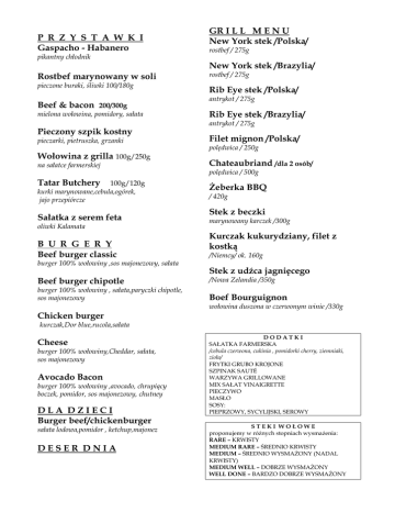 P R Z Y S T A W K I Gaspacho - Habanero pikantny chłodnik GR I L L M E N U New York stek /Polska/ rostbef / 275g New York stek /Brazylia/ Rostbef marynowany w soli rostbef / 275g pieczone buraki, śliwki 100/180g Rib Eye stek /Polska/ Beef & bacon 200/300g mielona wołowina, pomidory, sałata Pieczony szpik kostny pieczarki, pietruszka, grzanki Wołowina z grilla 100g/250g na sałatce farmerskiej Tatar Butchery 100g/120g kurki marynowane,cebula,ogórek, jajo przepiórcze Sałatka z serem feta oliwki Kalamata B U R G E R Y Beef burger classic burger 100% wołowiny ,sos majonezowy, sałata Beef burger chipotle burger 100% wołowiny , sałata,paryczki chipotle, sos majonezowy antrykot / 275g Rib Eye stek /Brazylia/ antrykot / 275g Filet mignon /Polska/ polędwica / 250g Chateaubriand /dla 2 osób/ polędwica / 500g Żeberka BBQ / 420g Stek z beczki marynowany karczek /300g Kurczak kukurydziany, filet z kostką /Niemcy/ ok. 160g Stek z udźca jagnięcego /Nowa Zelandia /350g Boef Bourguignon wołowina duszona w czerwonym winie /330g Chicken burger kurczak,Dor blue,rucola,sałata Cheese burger 100% wołowiny,Cheddar, sałata, sos majonezowy Avocado Bacon burger 100% wołowiny ,avocado, chrupiący boczek, pomidor, sos majonezowy, chutney DLA DZIECI Burger beef/chickenburger sałata lodowa,pomidor , ketchup,majonez DESER DNIA DODATKI SAŁATKA FARMERSKA /cebula czerwona, cukinia , pomidorki cherry, ziemniaki, zioła/ FRYTKI GRUBO KROJONE SZPINAK SAUTÉ WARZYWA GRILLOWANE MIX SAŁAT VINAIGRETTE PIECZYWO MASŁO SOSY: PIEPRZOWY, SYCYLIJSKI, SEROWY STEKI WOŁOWE proponujemy w różnych stopniach wysmażenia: RARE – KRWISTY MEDIUM RARE – ŚREDNIO KRWISTY MEDIUM – ŚREDNIO WYSMAŻONY (NADAL KRWISTY) MEDIUM WELL – DOBRZE WYSMAŻONY WELL DONE – BARDZO DOBRZE WYSMAŻONY