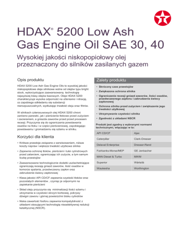 HDAX 5200 Low Ash Gas Engine Oil SAE 30, 40 ® Wysokiej jakości niskopopiołowy olej przeznaczony do silników zasilanych gazem Opis produktu Zalety produktu HDAX 5200 Low Ash Gas Engine Oils to wysokiej jakości niskopopiołowe oleje silnikowe wolne od olejów typu bright stock, wykorzystujące zaawansowaną technologię najwyższej klasy olejów bazowych. Oleje HDAX 5200 charakteryzuje wysoka odporność na utlenianie i nitrację, co zapobiega odkładaniu się substancji nierozpuszczalnych, wydłużając trwałość oleju oraz filtrów. • Skrócony czas przestojów W silnikach czterosuwowych olej HDAX 5200 chroni zarówno panewki, jak i pierścienie tłokowe przed zużyciem i zacieraniem, a gniazda zaworów przed przed procesem recesji. Przyczynia się do ograniczenia powstawania osadów na tłoku i w części pierścieniowej, zapobiegając powstawaniu i gromadzeniu się szlamu w silniku. • Utrzymywanie czystości silnika • Zwiększona ochrona silnika • Ograniczenie recesji gniazd zaworów, ilości osadów, przedwczesnego zapłonu i zabrudzenia świecy zapłonowej • Ochrona silnika przed zużyciem i zwiększenie jego trwałości użytkowej • Zgodność z układami NSCR Produkt jest zgodny z wybranymi normami technicznymi, włączając w to: API CD/CF Ajax Caterpillar Clark-Dresser Delaval Enterprise Dresser-Rand • Zapewnia ochronę tłoków, pierścieni i tulei cylindrowych przed zatarciem, ograniczając ich zużycie, a tym samym liczbę przestojów Fairbanks-Morse/MEP GE Jenbacher MAN Diesel & Turbo MWM • Zaawansowane technologicznie dodatki uszlachetniające ograniczają recesję gniazd zaworów, ilość osadów w komorze spalania, przedwczesny zapłon oraz zabrudzenie świecy zapłonowej Superior Wärtsilä Waukesha Worthington Korzyści dla klienta • Krótsze przestoje związane z serwisowaniem, niższe koszty napraw i większa trwałość użytkowa silnika • Klasa jakości API CD/CF zapewnia czystość tłoków oraz pozostałych elementów , czyniąc je odpornymi na zapiekanie pierścieni • Skład oleju przyczynia się minimalizacji ilości szlamu i utrzymania w czystości skrzyni korbowej, pokrywy dźwigni zaworu i górnej powierzchni bloku cylindrów • Niska zawartość fosforu zapewnia kompatybilność z układami stosującymi technologię nieselektywnej redukcji katalitycznej (NSCR). HDAX® 5200 Low Ash Gas Engine Oil SAE 30, 40 ─ ciąg dalszy Zastosowania • Oleje silnikowe HDAX 5200 Low Ash Gas Engine Oils zalecane są do stacjonarnych silników czterosuwowych i wybranych dwusuwowych zasilanych gazem ziemnym naturalnym lub syntezowy. • Skład tych olejów zapewnia im kompatybilność z wymogami technologii nieselektywnej redukcji katalitycznej (NSCR), co czyni je szczególnie przydatnymi w instalacjach wymagających oleju o niskiej zawartości fosforu, ograniczających toksyczność spalin. • Oleje silnikowe HDAX 5200 Low Ash Gas Engine Oils przeznaczone są do użytku z paliwami o niskiej zawartości siarki i CFC (freonów). W przypadku stosowania gazu kwaśnego lub zawierającego dużo freonów, wymagany może być olej o wyższej rezerwie alkalicznej. Zgodność ze standardami • API CD/CF (wycofana) • Ajax dwusuwowe • Caterpillar • Clark-Dresser dwusuwowe • Delaval Enterprise • Dresser-Rand Kategoria I, II i III • Fairbanks-Morse/MEP dwusuwowe • Superior • Wärtsilä • Waukesha • Worthington dwusuwowe i czterosuwowe • Skład olejów silnikowych HDAX 5200 Low Ash Gas Engine Oils spełnia wymagania dotyczące starszej klasy jakości API CD/CF Normy i Zatwierdzenia Zatwierdzenia • GE Jenbacher: Silniki TA 1000-1109 typ 2,3 (wersja B oraz od wersji C), 4 (wersja B) i 6 (wersja C oraz od wersji E) wyposażone w katalizatory oraz bez nich, stosujące paliwo A (gaz ziemny) (wyłącznie SAE 40) • GE Jenbacher: Silniki TA 1000-1109 typ 4 (wersja C) i typ 6 (wersja F) wyposażone w katalizatory oraz bez nich, stosujące paliwo A (gaz ziemny), paliwo B (biogaz) i paliwo C (gaz wysypiskowy) (wyłącznie SAE 40) • MAN Diesel & Turbo: Silniki na gaz Otto oraz na podwójne paliwo • MWM: Okólnik techniczny, grupa 0199-99-2105 aż do 0,5% popiołu siarczanowego (wyłącznie SAE 40) • Wärtsilä Silniki na gaz oraz na podwójne paliwo, w których gaz ziemny stanowi paliwo podstawowe (wyłącznie SAE 40) • Waukesha zastosowanie kogeneracyjne (wyłącznie SAE 40) • Waukesha SG 175/220 (wcześniej dostarczane przez Wärtsilä, wyłącznie SAE 40) • Caterpillar: Silniki CG132, CG170 i CG 260 (wyłącznie SAE 40) © 2013-2015 Chevron Products UK Limited. All rights reserved. All trademarks are property owned by Chevron Intellectual Property LLC. EU v13 16 March 2015 ® HDAX 5200 Low Ash Gas Engine Oil SAE 30, 40 HDAX® 5200 Low Ash Gas Engine Oil SAE 30, 40 ─ ciąg dalszy Dane Typowe Metody badań Test Właściwości Wartość SAE 30 SAE 40 ASTM D4052 0,877 0,879 ASTM D445 97,3 124 Lepkość kinematyczna w temperaturze 100°C, mm /s ASTM D445 11,4 13,5 Wskaźnik lepkości ASTM D2270 104 104 Temperatura krzepnięcia, °C ASTM D97 -30 -33 Temperatura zapłonu COC, °C ASTM D92 215 260 Ogólna liczba zasadowa, mg KOH/g ASTM D2896 4,2 4,2 Popiół siarczanowy, %wt ASTM D874 0,5 0,5 Gęstość w temperaturze 15°C, kg/l 2 Lepkość kinematyczna w temperaturze 40°C, mm /s 2 Podane informacje są danymi typowymi dla bieżącej produkcji, nie stanowią wymagań technicznych produktu i mogą podlegać zmianom w ramach dopuszczalnych tolerancji produkcyjnych. Zastrzega się prawo do dokonywania zmian w specyfikacji produktu. Powyższa Karta Produktu zastępuje wszelkie poprzednie wersje Karty Produktu i zawarte w nich informacje. Chevron nie bierze odpowiedzialności: za jakiekolwiek straty oraz szkody powstałe wskutek używania tego produktu niezgodnie z przeznaczeniem opisanym w Karcie Produktu. Zdrowie, bezpieczeństwo, przechowywanie i ochrona środowiska: zgodnie z aktualnie dostępnymi informacjami nie przypuszcza się, ż