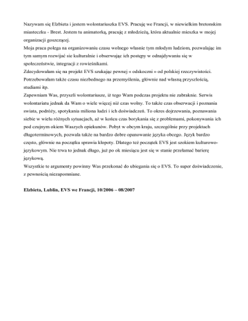 Nazywam się Elzbieta i jestem wolontariuszka EVS. Pracuję we Francji, w niewielkim bretonskim miasteczku - Brest. Jestem tu animatorką, pracuję z młodzieżą, która aktualnie mieszka w mojej organizacji goszczącej. Moja praca polega na organizowaniu czasu wolnego własnie tym młodym ludziom, pozwalając im tym samym rozwijać sie kulturalnie i obserwując ich postępy w odnajdywaniu się w społeczeństwie, integracji z rowieśnikami. Zdecydowałam się na projekt EVS szukając pewnej « odskoczni » od polskiej rzeczywistości. Potrzebowałam także czasu niezbednego na przemyślenia, głównie nad własną przyszlością, studiami itp. Zapewniam Was, przyszli wolontariusze, iż tego Wam podczas projektu nie zabraknie. Serwis wolontariatu jednak da Wam o wiele więcej niż czas wolny. To także czas obserwacji i poznania swiata, podróży, spotykania miliona ludzi i ich doświadczeń. To okres dojrzewania, poznawania siebie w wielu różnych sytuacjach, aż w końcu czas borykania się z problemami, pokonywania ich pod czujnym okiem Waszych opiekunów. Pobyt w obcym kraju, szczególnie przy projektach długoterminowych, pozwala także na bardzo dobre opanowanie języka obcego. Język bardzo często, głównie na początku sprawia kłopoty. Dlatego też początek EVS jest szokiem kulturowojęzykowym. Nie trwa to jednak długo, już po ok miesiącu jest się w stanie przełamać barierę językową. Wszystkie te argumenty powinny Was przekonać do ubiegania się o EVS. To super doświadczenie, z pewnością niezapomniane. Elzbieta, Lublin, EVS we Francji, 10/2006 – 08/2007