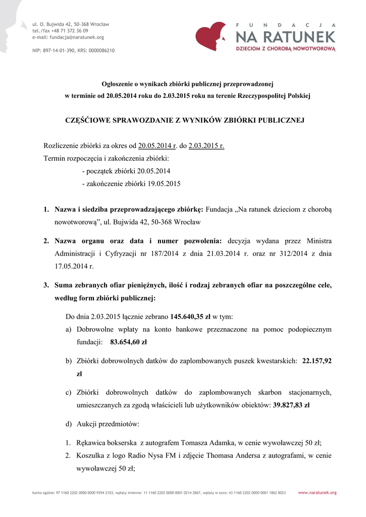 ul. O. Bujwida 42, 50-368 Wrocław tel./fax +48 71 372 36 09 e-mail: [email protected] NIP: 897-14-01-390, KRS: 0000086210 Ogłoszenie o wynikach zbiórki publicznej przeprowadzonej w terminie od 20.05.2014 roku do 2.03.2015 roku na terenie Rzeczypospolitej Polskiej CZĘŚĆIOWE SPRAWOZDANIE Z WYNIKÓW ZBIÓRKI PUBLICZNEJ Rozliczenie zbiórki za okres od 20.05.2014 r. do 2.03.2015 r. Termin rozpoczęcia i zakończenia zbiórki: - początek zbiórki 20.05.2014 - zakończenie zbiórki 19.05.2015 1. Nazwa i siedziba przeprowadzającego zbiórkę: Fundacja „Na ratunek dzieciom z chorobą nowotworową”, ul. Bujwida 42, 50-368 Wrocław 2. Nazwa organu oraz data i numer pozwolenia: decyzja wydana przez Ministra Administracji i Cyfryzacji nr 187/2014 z dnia 21.03.2014 r. oraz nr 312/2014 z dnia 17.05.2014 r. 3. Suma zebranych ofiar pieniężnych, ilość i rodzaj zebranych ofiar na poszczególne cele, według form zbiórki publicznej: Do dnia 2.03.2015 łącznie zebrano 145.640,35 zł w tym: a) Dobrowolne wpłaty na konto bankowe przeznaczone na pomoc podopiecznym fundacji: 83.654,60 zł b) Zbiórki dobrowolnych datków do zaplombowanych puszek kwestarskich: 22.157,92 zł c) Zbiórki dobrowolnych datków do zaplombowanych skarbon stacjonarnych, umieszczanych za zgodą właścicieli lub użytkowników obiektów: 39.827,83 zł d) Aukcji przedmiotów: 1. Rękawica bokserska z autografem Tomasza Adamka, w cenie wywoławczej 50 zł; 2. Koszulka z logo Radio Nysa FM i zdjęcie Thomasa Andersa z autografami, w cenie wywoławczej 50 zł; konto ogólne: 97 1160 2202 0000 0000 9394 2103, wpłaty imienne: 11 1160 2202 0000 0001 0214 2867, wpłaty w euro: 43 1160 2202 0000 0001 1862 8023 www.naratunek.org ul. O. Bujwida 42, 50-368 Wrocław tel./fax +48 71 372 36 09 e-mail: [email protected] NIP: 897-14-01-390, KRS: 0000086210 3. Koszulka z meczu charytatywnego dla Kevina z autografami AZS STAL NYSA – 2 szt. w cenie wywoławczej 50 zł za jedną; 4. Koszulka i zdjęcie z autografami Kamila Stocha – 2 szt. w cenie wywoławczej 50 zł za jedną; 5. Zdjęcie Miłosza Paździerskiego - Paryż 2009, w cenie wywoławczej 50 zł 6. Butelka wina z autografami sportowców, w cenie wywoławczej 50 zł; 7. Butelka wina z autografami + VOUCHER o wartości 200 zł do wykorzystania w Restauracji Hotelu Europejskiego, w cenie wywoławczej 50 zł; 8. Koszulka i czapeczka LOTTO TEAM + plakat z autografem Martina Kaczmarskiego, w cenie wywoławczej 50 zł 9. Domowe wina z winnicy w Paczkowie (karton 6 szt.), w cenie wywoławczej 50 zł; 10. DVD z filmem „80 milionów” z autografem Stanisława Huskowskiego, w cenie wywoławczej 50 zł. Aukcja ww. przedmiotów nie odbyła się. Do dnia 2.03.2015 wydatkowana została kwota: 85.537,84 zł Kwota w wysokości 85.537,84 zł została zgodnie z celem zbiórki publicznej przeznaczona na: Szczegółowy podział wydatków: Finansowanie operacji medycznych, leczenia, rehabilitacji, rehabilitacyjnych dla podopiecznych Fundacji – 44.961,20 zł turnusów Zakup leków, sprzętu rehabilitacyjnego, materiałów opatrunkowych i higienicznych, sprzętu medycznego jednorazowego użytku dla podopiecznych Fundacji – 32.968,42 zł Zwrot kosztów przejazdów podopiecznych z miejsca zamieszkania do ośrodka medycznego, w którym wykonywane są badania, wizyty lekarskie, prowadzona jest terapia lub rehabilitacja – 7.608,22 zł 4. Wysokość kosztów przeprowadzenia zbiórki publicznej: 0 zł - prowizje od wpłat zamkniętych – 208,34 zł - wystawienie protokołu różnicy przez bank – 260,00 zł Dotychczasowe koszty pokryte zostały ze środków własnych Fundacji. 5. Łączny, dotychczasowy dochód ze zbiórki publicznej: 145.640,35 zł konto ogólne: 97 1160 2202 0000 0000 9394 2103, wpłaty imienne: 11 1160 2202 0000 0001 0214 2867, wpłaty w euro: 43 1160 2202 0000 0001 1862 8023 www.naratunek.org ul. O. Bujwida 42, 50-368 Wrocław tel./fax +48 71 372 36 09 e-mail: [email protected] NIP: 897-14-01-390, KRS: 0000086210 6. Liczba dzieci objętych zbiórką Dotychczas prowadzona zbiórka objęła 23 podopiecznych Agnieszka Aleksandrowicz Prezes Zarządu Fundacji konto ogólne: 97 1160 2202 0000 0000 9394 2103, wpłaty imienne: 11 1160 2202 0000 0001 0214 2867, wpłaty w euro: 43 1160 2202 0000 0001 1862 8023 www.naratunek.org