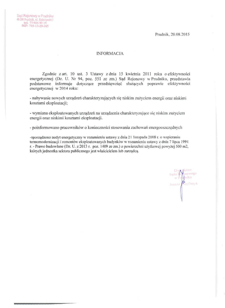 Sąd Rejonowy w Prudniku 48-200 Prudnik, ui. Kościimki 5 tel. 77/40680 15 NIP.-755-13-29-J65 Prudnik, 20.08.2015 INFORMACJA Zgodnie żart. 10 ust. 3 Ustawy z dnia 15 kwietnia 2011 roku o efektywności energetycznej (Dz. U. Nr 94, póz. 551 ze zm.) Sąd Rejonowy w Prudniku, przedstawia podstawowe informuje dotyczące przedsięwzięć służących poprawie efektywności energetycznej w 2014 roku; - nabywanie nowych urządzeń charakteryzujących się niskim zużyciem energii oraz niskimi kosztami eksploatacji; - wymiana eksploatowanych urządzeń na urządzenia charakteryzujące się niskim zużyciem energii oraz niskimi kosztami eksploatacji. - poinformowano pracowników o konieczności stosowania zachowań energooszczędnych -sporządzono audyt energetyczny w rozumieniu ustawy z dnia 21 listopada 2008 r. o wspieraniu termomodernizacji i remontów eksploatowanych budynków w rozumieniu ustawy z dnia 7 lipca 1994 r. - Prawo budowlane (Dz. U. z 2013 r. póz. 1409 ze zm.) o powierzchni użytkowej powyżej 500 m2, których jednostka sektora publicznego jest właścicielem lub zarządcą. A; '' li ,