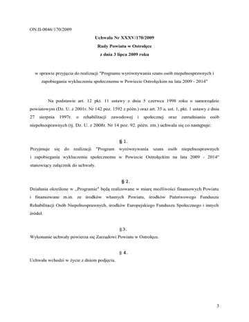 ON.II-0046/170/2009 Uchwała Nr XXXV/170/2009 Rady Powiatu w Ostrołęce z dnia 3 lipca 2009 roku w sprawie przyjęcia do realizacji "Programu wyrównywania szans osób niepełnosprawnych i zapobiegania wykluczeniu społecznemu w Powiecie Ostrołęckim na lata 2009 - 2014" Na podstawie art. 12 pkt. 11 ustawy z dnia 5 czerwca 1998 roku o samorządzie powiatowym (Dz. U. z 2001r. Nr 142 poz. 1592 z późn.) oraz art. 35 a, ust. 1, pkt. 1 ustawy z dnia 27 sierpnia 1997r. o rehabilitacji zawodowej i społecznej oraz zatrudnianiu osób niepełnosprawnych (tj. Dz. U. z 2008r. Nr 14 poz. 92. późn. zm.) uchwala się co następuje: § 1. Przyjmuje się do realizacji "Program wyrównywania szans osób niepełnosprawnych i zapobiegania wykluczeniu społecznemu w Powiecie Ostrołęckim na lata 2009 - 2014" stanowiący załącznik do uchwały. § 2. Działania określone w ,,Programie" będą realizowane w miarę możliwości finansowych Powiatu i finansowane m.in. ze środków własnych Powiatu, środków Państwowego Funduszu Rehabilitacji Osób Niepełnosprawnych, środków Europejskiego Funduszu Społecznego i innych źródeł. §3. Wykonanie uchwały powierza się Zarządowi Powiatu w Ostrołęce. § 4. Uchwała wchodzi w życie z dniem podjęcia. 3 PROGRAM WYRÓWNYWANIA SZANS OSÓB NIEPEŁNOSPRAWNYCH I ZAPOBIEGANIA WYKLUCZENIU SPOŁECZNEMU W POWIECIE OSTROŁĘCKIM NA LATA 2009-2014 Program opracowany przez: Powiatowe Centrum Pomocy Rodzinie przy współpracy z: Powiatowym Urzędem Pracy w Ostrołęce, Wydziałem Oświaty i Spraw Społecznych Starostwa Powiatowego w Ostrołęce oraz z Urzędami Gmin Powiatu Ostrołęckiego Ostrołęka, 2009 rok 4 SPIS TREŚCI WSTĘP……………………………………………………………………….……………3 Rozdział I. ANALIZA SYTUACJI OSÓB NIEPEŁNOSPRAWNYCH W POWIECIE OSTROŁĘCKIM…………………………………………….…………6 1.1 Struktura ludności powiatu ostrołęckiego a niepełnosprawność………………..……..6 1.2 Edukacja dzieci i młodzieży……………………………………………………..….….7 1.3 Sytuacja na rynku pracy…………………………………………….………………….9 1.4 Bariery architektoniczne……..…………………………...…………………......……11 1.5 Transport i komunikacja………………………………………………………….…..13 1.6 Poradnictwo i wsparcie……………………………………………………………….14 1.7 Kultura, sport i wypoczynek………………………………………………………….14 1.8 Opieka zdrowotna……………………………………………………………...……..15 1.9 Rehabilitacja społeczna………...…………………………………………………… 15 1.10 Współpraca z organizacjami pozarządowymi i stowarzyszeniami……………....….16 Rozdział II. DZIAŁANIA POWIATU OSTROŁĘCKIEGO NA RZECZ OSÓB Z OGRANICZONĄ SPRAWNOŚCIĄ…………………………………………..……18 2. Cel strategiczny, cele szczegółowe………….....……………………………………...19 2.1 Poprawa warunków życia codziennego i integracji społecznej osób niepełnosprawnych………………………………………………………………………..19 2.2 Poprawa funkcjonowania rodzin z osobami niepełnosprawnymi...…………...…….20 2.3 Równe szanse osób niepełnosprawnych w dostępie do edukacji…………….…… 21 2.4 Lepsza oświata zdrowotna promująca zdrowy styl życia………………………...….22 2.5 Przyjazne środowisko do aktywizacji zawodowej osób niepełnosprawnych…..…. 24 3. Podmioty realizujące zadania i źródła finansowania…………………………...……..26 ZAKOŃCZENIE……………………………………………………………...…………27 5 WSTĘP Niepełnosprawność jest jednym z poważniejszych zjawisk i problemów współczesnej cywilizacji. Znaczenie tego problemu wynika z rozmiarów i powszechności jego występowania w populacji, a także z konsekwencji, jakie wywołuje w sensie indywidualnym i społecznym. W ustawie z dnia 27 sierpnia 1997r. o rehabilitacji zawodowej i społecznej osób niepełnosprawnych (tj. Dz. U. z 2008r Nr 14 poz. 92 z późn. zm.) niepełnosprawność – oznacza trwałą lub okresową niezdolność do wypełniania ról społecznych z powodu stałego lub długotrwałego naruszenia sprawności organizmu w szczególności powodującą niezdolność do pracy. Biorąc pod uwagę rodzaj niepełnosprawności, możemy wyróżnić: 1. Osoby z niepełnosprawnością fizyczną, do których należą: a. Osoby z uszkodzeniem narządu ruchu (niepełnosprawność motoryczna) b. Osoby z przewlekłymi chorobami wewnętrznymi 2. Osoby z niepełnosprawnością sensoryczną (uszkodzenie narządów zmysłów), do których należą: a. Osoby niewidome i słabo widzące b. Osoby niedosłyszące i słabosłyszące 3. Osoby z niepełnosprawnością psychiczną, wśród których możemy wyróżnić: a. Osoby z chorobą psychiczną b. Osoby z niepełnosprawnością intelektualną Głównymi przyczynami powstawania niepełnosprawności są: choroby układu sercowo –naczyniowego, choroby nowotworowe, urazy i wypadki, w tym wypadki przy pracy, komunikacyjne i w gospodarstwach domowych, choroby psychiczne i negatywne skutki dotyczące higieny i jakości zdrowia psychicznego, choroby genetyczne, uszkodzenia centralnego układu nerwowego, wadliwy styl życia, choroby zakaźne i infekcyjne. 6 Dane GUS z 2002 r. wskazują, że w Polsce około 5.457 tyś. osób (co stanowi 15% populacji), to osoby niepełnosprawne. Jest rzeczą bezsporną, że osobom tym należą się równe szanse oraz takie same prawa, jakie posiadają pozostali członkowie społeczeństwa. Jest powszechnie wiadomym, że konsekwencje niepełnej sprawności nie ograniczają się jedynie 