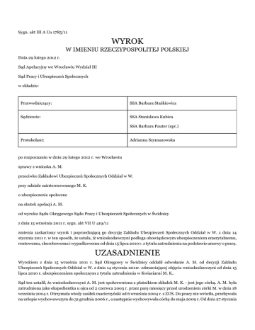 Sygn. akt III A Ua 1785/11 WYROK W IMIENIU RZECZYPOSPOLITEJ POLSKIEJ Dnia 29 lutego 2012 r. Sąd Apelacyjny we Wrocławiu Wydział III Sąd Pracy i Ubezpieczeń Społecznych w składzie: Przewodniczący: SSA Barbara Staśkiewicz Sędziowie: SSA Stanisława Kubica SSA Barbara Pauter (spr.) Protokolant: Adrianna Szymanowska po rozpoznaniu w dniu 29 lutego 2012 r. we Wrocławiu sprawy z wniosku A. M. przeciwko Zakładowi Ubezpieczeń Społecznych Oddział w W. przy udziale zainteresowanego M. K. o ubezpieczenie społeczne na skutek apelacji A. M. od wyroku Sądu Okręgowego Sądu Pracy i Ubezpieczeń Społecznych w Świdnicy z dnia 15 września 2011 r. sygn. akt VII U 419/11 zmienia zaskarżony wyrok i poprzedzającą go decyzję Zakładu Ubezpieczeń Społecznych Oddział w W. z dnia 14 stycznia 2011 r. w ten sposób, że ustala, iż wnioskodawczyni podlega obowiązkowym ubezpieczeniom emerytalnemu, rentowemu, chorobowemu i wypadkowemu od dnia 15 lipca 2010 r. z tytułu zatrudnienia na podstawie umowy o pracę. UZASADNIENIE Wyrokiem z dnia 15 września 2011 r. Sąd Okręgowy w Świdnicy oddalił odwołanie A. M. od decyzji Zakładu Ubezpieczeń Społecznych Oddział w W. z dnia 14 stycznia 2011r. odmawiającej objęcia wnioskodawczyni od dnia 15 lipca 2010 r. ubezpieczeniem społecznym z tytułu zatrudnienia w Kwiaciarni M. K.. Sąd ten ustalił, że wnioskodawczyni A. M. jest spokrewniona z płatnikiem składek M. K. - jest jego córką. A. M. była zatrudniona jako ekspedientka u ojca od 2 czerwca 2003 r. przez parę miesięcy przed urodzeniem córki M. w dniu 18 września 2004 r. Otrzymała wtedy zasiłek macierzyński od 6 września 2004 r. z ZUS. Do pracy nie wróciła, przebywała na urlopie wychowawczym do 31 grudnia 2006 r., a następnie wychowywała córkę do maja 2009 r. Od dnia 27 stycznia 2007 r. wnioskodawczyni pobierała zasiłek dla bezrobotnych (przez okres jednego roku). Od 30 czerwca 2009 r. prowadziła swoją działalność gospodarczą. Działalność nie była dochodowa i wnioskodawczyni zlikwidowała ją. W dniu 15 lipca 2010 r. A. M. zatrudniła się (podpisała umowę o pracę) u ojca w Kwiaciarni. Była wówczas w 6 miesiącu ciąży. M. K. zatrudniał już dwie osoby ( I. J., E. H.). Wnioskodawczyni A. M. w dniu 12 lipca 2010 r. uzyskała zaświadczenie od lekarza medycyny pracy i podjęła pracę sprzedawcy w kwiaciarni w N.. Wnioskodawczyni zatrudniona została na czas nieokreślony, na pełny etat z wynagrodzeniem w wysokości 1.600,- zł brutto. Nie miała określonego pisemnie zakresu obowiązków. Codziennie od godziny 9 do 17, do dnia choroby, wnioskodawczyni wykonywała lżejsze czynności w Kwiaciarni, takie jak: obsługiwanie klientów, wypisywanie rachunków, robienie bukietów, układanie kwiatów, czyściła kwiaty doniczkowe i cięte, oblistkowywała kwiaty, robiła wiązanki pogrzebowe, 4-5 razy sprzątała, podlewała kwiaty małą butelka, przecierała kurze, podłogi, sprzątała na zapleczu. Do pracy wnioskodawczyni dojeżdżała codziennie samochodem z K.. Za miesiąc lipiec wnioskodawczyni A. M. otrzymała wynagrodzenie w wysokości: 674,36 zł (płaca podstawowa 1.600,- zł), E. H. - 1/2 etatu - 533,36zł (płaca podstawowa 660,- zł), E. J. - cały etat - 989,15zł (płaca podstawowa 1.317,- zł); za sierpień: A. M. cały etat 1.181,38 zł, E. H. - 1/2 etatu - 533,36 zł, E. J. - cały etat - 989,15 zł. W miesiącu wrześniu wnioskodawczyni otrzymała kwotę 118,38 zł, a za październik 368,16 zł. Za listopad i grudzień wynagrodzenie nie zostało wnioskodawczyni wypłacone. Zakład Ubezpieczeń Społecznych Oddział w W. przeprowadził w dniach od 9 do 15 listopada 2010 r. postępowanie wyjaśniające w zakresie prawidłowości rzetelności obliczania składek na ubezpieczenie społeczne i innych składek, do których zobowiązany jest ZUS oraz zgłaszania do ubezpieczeń społecznych i ubezpieczenia zdrowotnego. Wskutek ustalonych okoliczności zawarcia umowy o pracę A. M. z płatnikiem M. K. - ojcem jako pracodawcą - stwierdzono nieważność umowy z uwagi na obejście prawa. M. K. prowadzi działalność gospodarczą Kwiaciarnię w N.. W okresie zatrudnienia córki A. M. kondycja firmy była średnia. Do ubezpieczenia wnioskodawczyni została zgłoszona, na druku ZUS ZUA przez płatnika 5 sierpnia 2010 r., a dokumenty rozliczeniowe za miesiąc lipiec 2010 r. zostały przekazane do organu rentowego w dniu 20 sierpnia 2010 r. Z tytułu zatrudnienia A. M. płatnik składek składał imienne raporty rozliczeniowe ZUS RCA za okres od lipca 2010 r. do października 2010 r. oraz imienne raporty o wypłaconych świadczeniach i przerwach ZUS RSA w opłacaniu składek za okres od września 2010 r. do października 2010 r., w których wykazano okres od 6 września 2010 r. do 8 października 2010 r. z kodem świadczenia przerwa ,,331" - wynagrodzenie za czas niezdolności do pracy i wypłacone przez pracodawcę, za okres 9 października 2010 r. do 31 października 2010 r. zasiłek chorobowy z ubezpieczenia chorobowego, od 1 listopada 2010 r. do 30 listopada 2010 r. zasiłek macierzyński z ubezpieczenia chorobowego. Wnioskodawczyni urodziła córkę M. w dniu 26 października 2010 r., z ZUS nie otrzymała zasiłku chorobowego ani macierzyńskiego. Od 27 października 2010 r. przebywała na urlopie macierzyńskim, nie złożyła do pracodawcy wniosku o urlop wychowawczy, nie wróciła do pracy, nie rozwiązała stosunku pracy u ojca, nie ma świadectwa pracy za ten okres zatrudnienia. Od kwietnia 2011 r. podjęła pracę jako sekretarka u innego pracodawcy. Zainteresowany M. K. nie zatrudnił na miejsce córki innego pracownika. W tak ustalonym stanie faktycznym Sąd Okręgowy uznał odwołanie za nieuzasadnione. W ocenie Sądu zebrany w sprawie materiał dowodowy wykazał, że wnioskodawczyni zawarła umowę o pracę w celu obejścia przepisów prawa i uzyskania świadczeń z ubezpieczenia społecznego, pomimo że pomiędzy płatnikiem skład