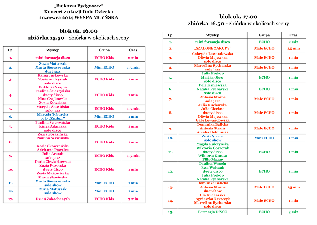 „Bajkowa Bydgoszcz” Koncert z okazji Dnia Dziecka 1 czerwca 2014 WYSPA MŁYŃSKA blok ok. 17.00 zbiórka 16.50 - zbiórka w okolicach sceny blok ok. 16.00 zbiórka 15.50 - zbiórka w okolicach sceny Lp. Występ Grupa Czas 1. mini formacja disco ECHO 2 min „SZALONE ZAKUPY” Małe ECHO 1,5 min Małe ECHO 1 min Małe ECHO 1 min ECHO 1 min ECHO 1 min Małe ECHO 1 min Małe ECHO 1 min Małe ECHO 1 min Mini ECHO 1 min ECHO 1 min ECHO 1 min Małe ECHO 1,5 min Małe ECHO 1 min ECHO 3 min Lp. Występ Grupa Czas 2. 1. mini formacja disco ECHO Kids 2 min 3. Mini ECHO 1,5 min 4. ECHO Kids 1 min 2. 3. 4. 5. 6. 7. 8. 9. 10. 11. 12. 13. Zuzia Matuszak Marta Sieraszewska duet jazz Kama Jurkowska Zosia Andryszak solo disco Wiktoria Szajna Paulina Ścieszyńska duety disco Nina Czajkowska Zosia Kowalska Marysia Sławińska solo jazz Marysia Tyburska solo „Zuzia…” Paulina Ścieszyńska Kinga Adamska solo disco Zuzia Porazińska Paulina Serwińska Kasia Skowrońska Adrianna Pawelec Julia Arendt solo jazz Daria Chwiałkowska Zuzia Pozorska duety disco Zosia Makowiecka Maria Sławińska Marta Sieraszewska solo show Zuzia Matuszak solo show Dzień Zakochanych 5. 6. ECHO Kids 1 min 7. ECHO Kids 1,5 min Mini ECHO 1 min ECHO Kids 1 min ECHO Kids 1 min ECHO Kids 1,5 min ECHO Kids 1 min Mini ECHO 1 min Mini ECHO 1 min ECHO Kids 3 min 8. 9. 10. 11. 12. 13. 14. 15. Gabrysia Lewandowska Oliwia Majewska solo disco Marcelina Rycharska solo jazz Julia Prekop Marika Okrój solo disco Pola Kaniewska Natalia Rycharska solo disco Antosia Stranz solo jazz Julia Kucharska Julia Ciechna duety disco Oliwia Majewska Gabi Lewandowska Dominika Balicka Antosia Stranz Amelia Hełminiak Zuzia Stranz solo show Magda Kulczyńska Wiktoria Goszczak duety disco Wiktoria Krausa Filip Mazur Paulina Wasela Ewa Walczak duety disco Julia Prekop Natalia Rycharska Dominika Balicka Antosia Stranz duet show Ola Kucharska Agnieszka Reszczyk Marcelina Rycharska solo disco Formacja DISCO