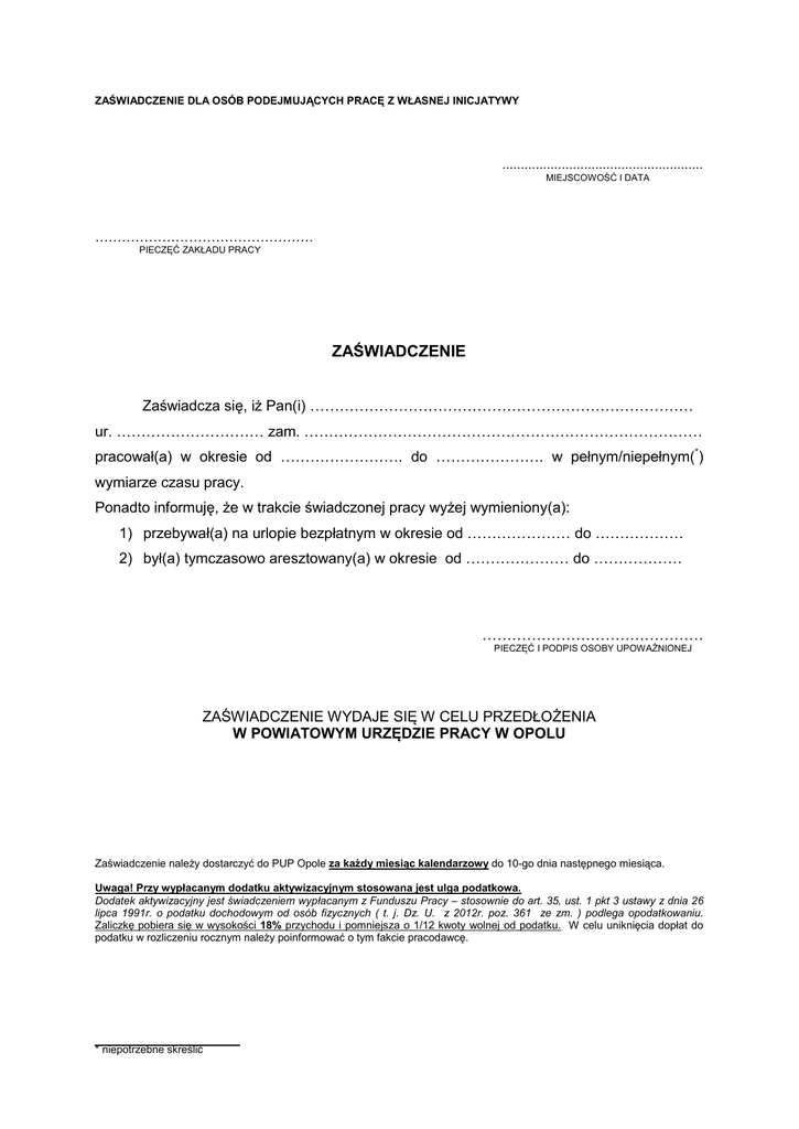 ZAŚWIADCZENIE DLA OSÓB PODEJMUJĄCYCH PRACĘ Z WŁASNEJ INICJATYWY ...................................................... MIEJSCOWOŚĆ I DATA …………………………………………. PIECZĘĆ ZAKŁADU PRACY ZAŚWIADCZENIE Zaświadcza się, iż Pan(i) …………………………………………………………………… ur. ………………………… zam. ……………………………………………………………………… pracował(a) w okresie od ……………………. do …………………. w pełnym/niepełnym(*) wymiarze czasu pracy. Ponadto informuję, że w trakcie świadczonej pracy wyżej wymieniony(a): 1) przebywał(a) na urlopie bezpłatnym w okresie od ………………… do ……………… 2) był(a) tymczasowo aresztowany(a) w okresie od ………………… do ……………… ……………………………………… PIECZĘĆ I PODPIS OSOBY UPOWAŻNIONEJ ZAŚWIADCZENIE WYDAJE SIĘ W CELU PRZEDŁOŻENIA W POWIATOWYM URZĘDZIE PRACY W OPOLU Zaświadczenie należy dostarczyć do PUP Opole za każdy miesiąc kalendarzowy do 10-go dnia następnego miesiąca. Uwaga! Przy wypłacanym dodatku aktywizacyjnym stosowana jest ulga podatkowa. Dodatek aktywizacyjny jest świadczeniem wypłacanym z Funduszu Pracy – stosownie do art. 35, ust. 1 pkt 3 ustawy z dnia 26 lipca 1991r. o podatku dochodowym od osób fizycznych ( t. j. Dz. U. z 2012r. poz. 361 ze zm. ) podlega opodatkowaniu. Zaliczkę pobiera się w wysokości 18% przychodu i pomniejsza o 1/12 kwoty wolnej od podatku. W celu uniknięcia dopłat do podatku w rozliczeniu rocznym należy poinformować o tym fakcie pracodawcę. * niepotrzebne skreślić