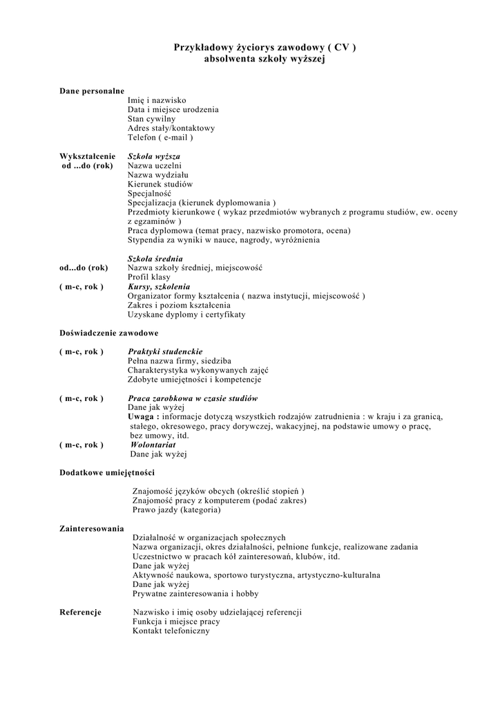 Przykładowy życiorys zawodowy ( CV ) absolwenta szkoły wyższej Dane personalne Wykształcenie od ...do (rok) od...do (rok) ( m-c, rok ) Imię i nazwisko Data i miejsce urodzenia Stan cywilny Adres stały/kontaktowy Telefon ( e-mail ) Szkoła wyższa Nazwa uczelni Nazwa wydziału Kierunek studiów Specjalność Specjalizacja (kierunek dyplomowania ) Przedmioty kierunkowe ( wykaz przedmiotów wybranych z programu studiów, ew. oceny z egzaminów ) Praca dyplomowa (temat pracy, nazwisko promotora, ocena) Stypendia za wyniki w nauce, nagrody, wyróżnienia Szkoła średnia Nazwa szkoły średniej, miejscowość Profil klasy Kursy, szkolenia Organizator formy kształcenia ( nazwa instytucji, miejscowość ) Zakres i poziom kształcenia Uzyskane dyplomy i certyfikaty Doświadczenie zawodowe ( m-c, rok ) Praktyki studenckie Pełna nazwa firmy, siedziba Charakterystyka wykonywanych zajęć Zdobyte umiejętności i kompetencje ( m-c, rok ) Praca zarobkowa w czasie studiów Dane jak wyżej Uwaga : informacje dotyczą wszystkich rodzajów zatrudnienia : w kraju i za granicą, stałego, okresowego, pracy dorywczej, wakacyjnej, na podstawie umowy o pracę, bez umowy, itd. Wolontariat Dane jak wyżej ( m-c, rok ) Dodatkowe umiejętności Znajomość języków obcych (określić stopień ) Znajomość pracy z komputerem (podać zakres) Prawo jazdy (kategoria) Zainteresowania Referencje Działalność w organizacjach społecznych Nazwa organizacji, okres działalności, pełnione funkcje, realizowane zadania Uczestnictwo w pracach kół zainteresowań, klubów, itd. Dane jak wyżej Aktywność naukowa, sportowo turystyczna, artystyczno-kulturalna Dane jak wyżej Prywatne zainteresowania i hobby Nazwisko i imię osoby udzielającej referencji Funkcja i miejsce pracy Kontakt telefoniczny