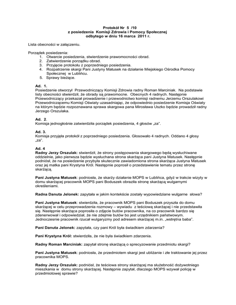 Protokół Nr 5 /10 z posiedzenia Komisji Zdrowia i Pomocy Społecznej odbytego w dniu 16 marca 2011 r. Lista obecności w załączeniu. Porządek posiedzenia: 1. Otwarcie posiedzenia, stwierdzenie prawomocności obrad. 2. Zatwierdzenie porządku obrad. 3. Przyjęcie protokołu z poprzedniego posiedzenia. 4. Rozpatrzenie skargi Pani Justyny Matusek na działanie Miejskiego Ośrodka Pomocy Społecznej w Lublińcu. 5. Sprawy bieżące. Ad. 1. Posiedzenie otworzył Przewodniczący Komisji Zdrowia radny Roman Marciniak. Na podstawie listy obecności stwierdził, że obrady są prawomocne. Obecnych 4 radnych. Następnie Przewodniczący przekazał prowadzenie i przewodnictwo komisji radnemu Jerzemu Orszulakowi Przewodniczącemu Komisji Oświaty uzasadniając, że odpowiednio posiedzenie Komisja Oświaty na którym będzie rozpoznawana sprawa skargowa pana Mirosława Uszko będzie prowadził radny Jerzego Orszulaka. Ad. 2. Komisja jednogłośnie zatwierdziła porządek posiedzenia, 4 głosów „za”. Ad. 3. Komisja przyjęła protokół z poprzedniego posiedzenia. Głosowało 4 radnych. Oddano 4 głosy „za”. Ad. 4 Radny Jerzy Orszulak: stwierdził, że strony postępowania skargowego będą wysłuchiwane oddzielnie, jako pierwsza będzie wysłuchana strona skarżąca pani Justyna Matusek. Następnie podniósł, że na posiedzenie przybyła skutecznie zawiadomiona strona skarżąca Justyna Matusek oraz jej matka pani Krystyna Król. Następnie poprosił o przedstawienie tematu przez stronę skarżącą. Pani Justyna Matusek: podniosła, że skarży działanie MOPS w Lublińca, gdyż w trakcie wizyty w domu skarżącej pracownik MOPS pani Boduszek obraziła stronę skarżącą wulgarnymi określeniami. Radna Danuta Jelonek: zapytała w jakim kontekście zostały wypowiedziane wulgarne słowa? Pani Justyna Matusek: stwierdziła, że pracownik MOPS pani Boduszek przyszła do domu skarżącej w celu przeprowadzenia rozmowy – wywiadu z teściową skarżącej i nie przedstawiła się. Następnie skarżąca poprosiła o zdjęcie butów pracownika, na co pracownik bardzo się zdenerwował i odpowiedział, że nie zdejmie butów bo jest urzędnikiem państwowym. Jednoczesnie pracownik rzucał wulgaryzmy pod adresem skarżącej m.in. „wstrętna baba”. Pani Danuta Jelonek: zapytała, czy pani Król była świadkiem zdarzenia? Pani Krystyna Król: stwierdziła, że nie była świadkiem zdarzenia. Radny Roman Marciniak: zapytał stronę skarżącą o sprecyzowanie przedmiotu skargi? Pani Justyna Matusek: podniosła, że przedmiotem skargi jest ubliżanie i złe traktowanie jej przez pracownika MOPS. Radny Jerzy Orszulak: podniósł, że teściowa strony skarżącej ma służebność dożywotniego mieszkania w domu strony skarżącej. Następnie zapytał, dlaczego MOPS wzywał policję w przedmiotowej sprawie? Pani Justyna Matusek: stwierdziła, że MOPS wzywał policję bo po przeprowadzonym wywiadzie uznano, że znęcano się nad teściową. Radny Jerzy Orszulak: zapytał o wizytę Policji? Pani Krystyn Król: oświadczyła, że policjant przeprowadzający czynności operacyjne uznał, że jest możliwa wnioskowana konfrontacja pracownika MOPS ze stroną skarżącą, ale do takiej konfrontacji nie doszło. Radny Jerzy Orszulak: zapytał, czy od wizyty Policji sytuacja w domu uległa uspokojona? Pani Justyna Matusek: stwierdziła, że tak uległa. Radny Jerzy Orszulak: zapytał, czego strona skarżąca oczekuje w związku ze złożoną skargą? Pani Justyna Matusek: stwierdziła, że oczekuje przeprosin od pracownika MOPS pani Boduszek za swoje zachowanie. Radny Roman Marciniak: oświadczył, że w sprawie widoczne są następujące aspekty: brak przeproszenia przez pracownika MOPS strony skarżącej, wulgaryzmu pod adresem strony skarżącej m.in. że jest wstrętną babą, nasyłanie Policji przez MOPS. Pani Krystyna Król: dodaje , że teściowa ma bardzo dobra opiekę i mieszkanie z którego korzysta wedle swego uznania. Radna Danuta Jelonek: zapytała, kogo dotyczy skarga czy pracownika MOPS, czy kierownika MOPS? Pani Justyna Matusek: stwierdziła, że skarga dotyczy pracownika MOPS czyli działania MOPS. Skarga nie dotyczy kierownika MOPS. Radny Jerzy Orszulak: zapytał, jaką rolę w przedmiotowym postępowaniu ma Kierownik MOPS? Pani Justyna Matusek: stwierdziła, że Kierownik MOPS nie wysłuchał jej w ramach toczonego postępowania. Radny Jerzy Orszulak: zapytał, czy zebrani mają pytania?. Pytań nie było. Następnie Przewodniczący poprosił przybyłego kierownika MOPS panią Aleksandrę Stachowiak i pracownika MOPS panią Boduszek o wypowiedzenie się w przedmiocie skargi. Kierownik MOPS: stwierdziła, że na posiedzenie stawiła się z panią Boduszek kompetentnym w sprawie pracownikiem MOPS. Dodała, że na posiedzenie komisji przybyła również pani Leokadia Krawczyńska córka teściowej strony skarżącej. Kierownik MOPS: podnosi, że wszelkie czynności w sprawie podejmowane przez MOPS zostały przeprowadzone zgodnie z prawem. Dodaje, że pracownik MOPS pani Boduszek jest wieloletnim pracownikiem MOPS, zna bardzo dobrze swoje prawa i obowiązki. Radny Jerzy Orszulak: zapytał, czy w sprawie było przeprowadzone wysłuchała pani Justyny Matusek ? Kierownik MOPS: stwierdziła, że wysłuchania nie było. Radny Jerzy Orszulak: zapytał, czy pracownik MOPS pani Boduszek przychodząc na wywiad do domu skarżącej przedstawiła się? Pani Boduszek: oświadcza, że przedstawiła się i podała powód wizyty. Pani Krawczyńska: oświadczyła, że była świadkiem jak pani Boduszek przedstawiła się i podała powód swojej wizyty. Radny Jerzy Orszulak: zapytał, czy pracownik MOPS kierował wulgaryzmy do strony skarżącej oraz o sprawę zdjęcia butów przez pracownika. Pani Boduszek: oświadczyła, że jest pracownikiem administracji publicznej MOPS zna swoje prawa i obowiązku, w szczególności nigdy nie obraża stron. Następnie pracownik stwierdził, że w żaden sposób nie
