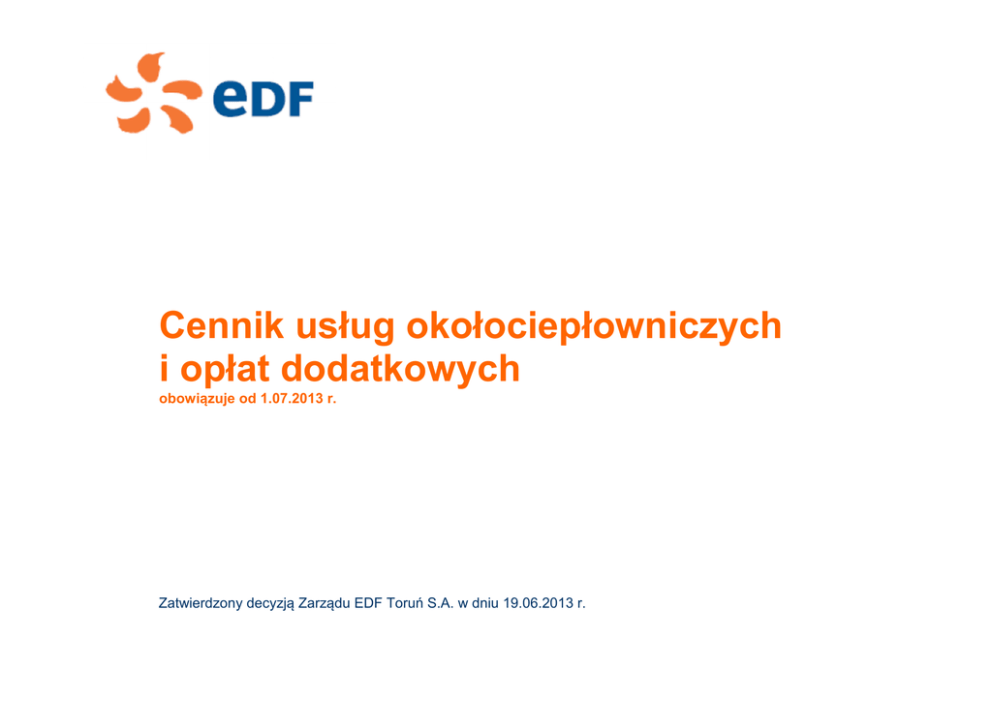 Cennik usług okołociepłowniczych i opłat dodatkowych obowiązuje od 1.07.2013 r. Zatwierdzony decyzją Zarządu EDF Toruń S.A. w dniu 19.06.2013 r. Cennik usług okołociepłowniczych i opłat dodatkowych EDF Toruń S.A. W ramach prowadzonej działalności EDF Toruń S.A. bezpłatnie wykonuje następujące usługi Nazwa usługi W przypadku gdy węzeł cieplny należy do EDF Toruń S.A. - włączenie i wyłączenie instalacji centralnego ogrzewania (raz w roku – w terminie zgłoszonym przez Odbiorcę) - spuszczenie wody z instalacji i ponowne jej napełnienie w węźle cieplnym (raz w roku) – w terminie zgłoszonym przez Odbiorcę - uzupełnienie stanu wody oraz odpowietrzenie instalacji centralnego ogrzewania (raz na dwa miesiące w terminie uzgodnionym przez strony) - przegląd urządzeń węzła cieplnego w zakresie współpracy z instalacją odbiorczą w celu przygotowania do włączenia ogrzewania (raz w roku – w terminie uzgodnionym przez strony) Udostępnianie pomieszczenia węzła - w celu wykonania prac instalacyjnych lub budowlanych, mających na celu utrzymanie właściwego stanu technicznego pomieszczenia węzła lub instalacji odbiorczej, niewymagających wyłączenia dostaw ciepła (w terminie uzgodnionym przez strony) - w celu dokonania czynności związanych z przeglądem funkcjonowania instalacji wentylacyjnej, pomiarów skuteczności rezystancji izolacji i ochrony ppoż. wew. linii zasilających rozdzielnie elektryczne (w terminie uzgodnionym przez strony) - w celu dostępu do układów pomiarowo-rozliczeniowych służącym rozliczeniu dostawy ciepła zgodnie z umową sprzedaży ciepła (w terminie uzgodnionym przez strony) - w celu dostępu do zaworów czerpalnych zimnej wody w celu ich otwarcia/zamknięcia (2 razy w roku – w terminie uzgodnionym przez strony). Istnieje możliwość samodzielnego dostępu do pomieszczeń węzłów cieplnych EDF Toruń S.A. w przypadku podpisania stosownego porozumienia określającego zasady tego dostępu. Odczyt ciepłomierza głównego i wodomierza na uzupełnianie wody (niezbędnego do rozliczenia dostawy ciepła zgodnie z umową sprzedaży ciepła) Każdorazowa zmiana nastaw automatyki pogodowej wynikająca z potrzeb Odbiorcy Konserwacja i eksploatacja sieci będącej własnością EDF Toruń S.A. dostarczającej ciepło do węzła cieplnego Konserwacja i eksploatacja urządzeń ciepłowniczych stanowiących własność EDF Toruń S.A. (węzły cieplne, sieci niskoparametrowe, rozdzielnie ciepła) Do przedstawionych w Cenniku usług okołociepłowniczych i opłat dodatkowych cen zostanie doliczony podatek VAT zgodnie z obowiązującymi w tym zakresie przepisami. Cennik usług okołociepłowniczych i opłat dodatkowych EDF Toruń S.A. Rozliczanie kosztów dostawy ciepła dla użytkowników lokali w budynkach-obiektach Nazwa usługi Odczyt układu pomiarowo – rozliczeniowego zgodnie z potrzebami Odbiorcy Opis Cena netto Odczyt pojedynczego układu pomiarowego na klatce schodowej (tzw. układ przymieszkaniowy) - cykliczny odczyt (raz na miesiąc, w miesiącach dostawy ciepła - cykliczny odczyt (raz na miesiąc, niezależnie od dostaw ciepła) 3,7 zł / odczyt 2,6 / m-c Odczyt pojedynczego układu pomiarowego w węźle cieplnym lub rozdzielni cieplnej - cykliczny odczyt (raz na miesiąc, w miesiącach dostawy ciepła) - cykliczny odczyt (raz na miesiąc, niezależnie od dostaw ciepła) - cykliczny odczyt (raz na kwartał, na pół roku, rok itp.) Podstawa do wykonywania usługi Umowa 8,7 zł / odczyt 6,2 zł / m-c 9,9 zł / odczyt Rozliczanie zużycia ciepła (z podziałem na c.o. i c.w.u.) zgodnie z potrzebami Odbiorcy Stawka za rozliczenie jednego obiektu/mieszkania - miesięczne (w miesiącach dostawy ciepła) - miesięczne (niezależnie od dostaw ciepła) - kwartalne - pozostałe (półroczne, roczne, itp.) 3,9 zł/ rozliczenie 2,7 zł / m-c 6,5 zł/ rozliczenie 8,9 zł/rozliczenie Rozliczanie zużycia zimnej wody na przygotowanie c.w.u. zgodnie z potrzebami Odbiorcy Stawka za rozliczenie jednego obiektu/mieszkania - miesięczne - kwartalne, raz na pół roku, raz na rok 3 zł/ rozliczenie 6,5 zł/rozliczenie Umowa Wystawienie druku przelewu bądź duplikatu faktury (bez kosztów dostarczenia przesyłki) zgodnie z potrzebami Odbiorcy Za jeden druk przelewu bądź duplikat faktury 3,5 zł Umowa Potwierdzenie indywidualnego salda lokatorów Comiesięczne zestawienie płatności lokatorów w przypadku dokonywania wpłat lokatorów bezpośrednio na konto EDF Toruń 3 zł/ m-c/lokal Umowa /zlecenie Umowa Cennik usług okołociepłowniczych i opłat dodatkowych EDF Toruń S.A. Doradztwo Nazwa usługi Wykonywanie i dostarczanie danych dotyczących zużycia ciepła i nośnika ciepła dla obiektów w postaci raportu (jednorazowo lub cyklicznie co miesiąc) zgodnie z potrzebami Odbiorcy Wykonanie analizy mocy wykorzystanej wraz z odczytem układów pomiarowych u Odbiorcy (opracowanie wraz z wnioskami) Wykonanie analizy mocy wykorzystanej (opracowanie wraz z wnioskami) Analiza emisyjności stropodachów pod kątem efektywności izolacji termicznej na podstawie zdjęć termowizyjnych Opis Wykonanie i dostarczenie danych dla następującej ilości punktów pomiarowych - za pierwsze 20 pkt. - za każdy następny punkt od 21 do 150 - za każdy następny punkt od 151 Dla jednego węzła lub budynku - analiza obejmująca czas do18 m-cy - analiza obejmująca czas pow. 18 m-cy Cena netto Podstawa do wykonywania usługi Stawka zależna od ilości punktów 2,0 zł/pkt/m-c 1,8 zł zł/pkt./m-c 1,7 zł zł/pkt./m-c Umowa/zlecenie 360 zł 400 zł Zlecenie Dla jednego lokalu - analiza obejmująca czas do18 m-cy - analiza obejmująca czas pow. 18 m-cy 120 zł 140 zł Dla jednego węzła lub budynku - analiza obejmująca czas do18 m-cy - analiza obejmująca czas pow. 18 m-cy 260 zł 300 zł Zlecenie Dla jednego lokalu - analiza obejmująca czas do18 m-cy - analiza obejmująca czas pow. 18 m-cy 100 zł 120 zł - analiza jednego obiektu w danym 