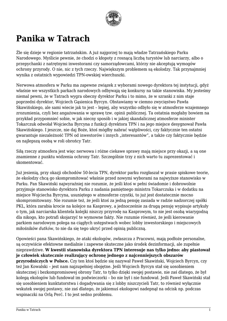 Panika w Tatrach Źle się dzieje w regionie tatrzańskim. A już najgorzej to mają władze Tatrzańskiego Parku Narodowego. Myślicie pewnie, że chodzi o kłopoty z rosnącą liczbą turystów lub narciarzy, albo o przepychanki z natrętnymi inwestorami czy samorządowcami, którzy nie akceptują wymogów ochrony przyrody. O nie, nic z tych rzeczy. Największym problemem są ekolodzy. Tak przynajmniej wynika z ostatnich wypowiedzi TPN-owskiej wierchuszki. Nerwowa atmosfera w Parku ma zapewne związek z wyborami nowego dyrektora tej instytucji, gdyż właśnie we wszystkich parkach narodowych odbywają się konkursy na takie stanowiska. My jesteśmy niemal pewni, że w Tatrach wygra obecny dyrektor Parku i to mimo, że w szranki z nim staje poprzedni dyrektor, Wojciech Gąsienica Byrcyn. Obstawiamy w ciemno zwycięstwo Pawła Skawińskiego, ale sami wiecie jak to jest – lepiej, aby wszystko odbyło się w atmosferze wzajemnego zrozumienia, czyli bez angażowania w sprawę tzw. opinii publicznej. Ta ostatnia mogłaby bowiem na przykład przypomnieć sobie, w jak niecny sposób i w jakiej skandalicznej atmosferze minister Tokarczuk odwołał Wojciecha Byrcyna z funkcji dyrektora TPN i na jego miejsce desygnował Pawła Skawińskiego. I jeszcze, nie daj Boże, ktoś mógłby nabrać wątpliwości, czy faktycznie ten ostatni gwarantuje niezależność TPN od inwestorów i innych „interesantów”, a także czy faktycznie będzie on najlepszą osobą w roli obrońcy Tatr. Siłą rzeczy atmosfera jest więc nerwowa i różne ciekawe sprawy mają miejsce przy okazji, a są one znamienne z punktu widzenia ochrony Tatr. Szczególnie trzy z nich warto tu zaprezentować i skomentować. Już jesienią, przy okazji obchodów 50-lecia TPN, dyrektor parku rozgłaszał w prasie spiskowe teorie, że ekolodzy chcą go skompromitować właśnie przed nowymi wyborami na najwyższe stanowisko w Parku. Pan Skawiński najwyraźniej nie rozumie, że jeśli ktoś w pełni świadomie i dobrowolnie przyjmuje stanowisko dyrektora Parku z nadania pamiętnego ministra Tokarczuka i w dodatku na miejsce Wojciecha Byrcyna, usuniętego w atmosferze czystki, to już jest dostatecznie mocno skompromitowany. Nie rozumie też, że jeśli ktoś za jedną pensję zasiada w radzie nadzorczej spółki PKL, która zarabia krocie na kolejce na Kasprowy, a jednocześnie za drugą pensję wypisuje artykuły o tym, jak narciarska klientela kolejki niszczy przyrodę na Kasprowym, to nie jest osobą wiarygodną dla nikogo, kto potrafi skojarzyć te wymowne fakty. Nie rozumie również, że jeśli kierowanie parkiem narodowym polega na ciągłych ustępstwach wobec lobby inwestorskiego i miejscowych miłośników dutków, to nie da się tego ukryć przed opinią publiczną. Opowieści pana Skawińskiego, że ataki ekologów, zwłaszcza z Pracowni, mają podłoże personalne, są oczywiście efektowne medialnie i zapewne skuteczne jako środek dezinformacji, ale zupełnie nieprawdziwe. W kwestii stanowiska dyrektora TPN interesuje nas tylko jedno: aby piastował je człowiek skutecznie realizujący ochronę jednego z najcenniejszych obszarów przyrodniczych w Polsce. Czy ten ktoś będzie się nazywał Paweł Skawiński, Wojciech Byrcyn, czy też Jan Kowalski – jest nam najzupełniej obojętne. Jeśli Wojciech Byrcyn stał się uosobieniem skutecznej i bezkompromisowej obrony Tatr, to tylko dzięki swojej postawie, nie zaś dlatego, że był kolegą ekologów lub fundował im podwieczorki – bo nie był i nie fundował. Jeśli Paweł Skawiński stał się uosobieniem kunktatorstwa i dogadywania się z lobby niszczycieli Tatr, to również wyłącznie wskutek swojej postawy, nie zaś dlatego, że jakiemuś ekologowi nadepnął na odcisk np. podczas wspinaczki na Orlą Perć. I to jest sedno problemu. Panika w Tatrach 1 Szczególnie ciekawym przykładem emocjonalnych reakcji dyrektora TPN, a także wykładnią postrzegania przezeń swojej roli jest list, jaki dyrekcja TPN wystosowała do organizatorów konferencji naukowej „Polskie parki narodowe i krajobrazowe – możliwości oraz problemy ochrony przyrody”, która odbyła się na początku grudnia na Katolickim Uniwersytecie Lubelskim. Na konferencję tę organizatorzy zaprosili zarówno przedstawicieli TPN-u, jak i drugą stronę głośnego nie od dziś sporu wokół ochrony Tatr, czyli ekologów, m.in. z Pracowni. Organizujący konferencję pracownicy Katedry Ochrony Środowiska KUL chcieli umożliwić obu stronom zaprezentowanie swoich racji na forum publicznym. Taka dyskusja nie była jednak w smak szefostwu TPN. Co innego wymądrzać się w parkowym czasopiśmie albo wobec zaprzyjaźnionych stronniczych dziennikarzy, a co innego porozmawiać z adwersarzami przed bezstronną publiką. Oto więc zamiast wizyty na konferencji władze TPN wystosowały do jej organizatorów pismo. Paweł Skawiński plus dwóch wicedyrektorów – Zbigniew Krzan i Stanisław Czubernat, najpierw zaprezentowali w nim wyliczankę swoich „sukcesów” w dziedzinie ochrony Tatr, której fragment warto zacytować, bo dobrze oddaje poziom intelektualny i moralny autorów: „Atmosfera konfliktów i sprzeczności tak szeroko rozpowszechnionych [w TPN] jeszcze kilka lat temu, ulega obecnie wyciszeniu i uspokojeniu. Negocjacje, rozmowy i liczne spotkania dyrekcji Parku w ciągu ostatnich 3 lat doprowadziły do konsensusu w wielu spornych kwestiach, a w konsekwencji do nawiązania partnerskiej współpracy z przedstawicielami władz lokalnych, organizacjami obecnymi w Tatrach, oraz stowarzyszeniami społecznymi zainteresowanymi problematyką Tatr”. Jednym słowem: za Byrcyna (te 3 lata wstecz) było źle i konfliktowo, za Skawińskiego jest dobrze, a Park i samorządy plus „stowarzyszenia społeczne” (jakie? – Stowarzyszenie Miłośników Kolejek Linowych? Czy może Grupa Wsparcia Antropopresji w Tatrach?) razem skutecznie bronią naszych pięknych gór w duchu jedności, szacunku i wzajemneg