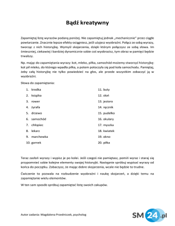 Bądź kreatywny Zapamiętaj listę wyrazów podaną poniżej. Nie zapamiętuj jednak „mechanicznie” przez ciągłe powtarzanie. Znacznie lepsze efekty osiągniesz, jeśli użyjesz wyobraźni. Połącz ze sobą wyrazy, tworząc z nich historyjkę. Wymyśl skojarzenia, dzięki którym połączysz ze sobą słowa. Im śmieszniej, ciekawiej i bardziej dynamicznie sobie coś wyobrazisz, tym obraz w pamięci będzie trwalszy. Np. mając do zapamiętania wyrazy: kot, mleko, piłka, samochód możemy stworzyć historyjkę: kot pił mleko, do którego wpadła piłka, a potem potoczyła się pod koła samochodu. Pamiętaj, żeby całą historyjkę nie tylko powiedzieć na głos, ale przede wszystkim zobaczyć ją w wyobraźni. Słowa do zapamiętania: 1. kredka 11. buty 2. książka 12. słoń 3. rower 13. jezioro 4. żyrafa 14. ręcznik 5. drzewo 15. pudełko 6. samochód 16. okulary 7. chłopiec 17. myszka 8. lekarz 18. kwiatek 9. marchewka 19. okno 10. garnek 20. piłka Teraz zasłoń wyrazy i wypisz je po kolei. Jeśli czegoś nie pamiętasz, pomiń wyraz i staraj się przypomnieć sobie kolejne elementy swojej historyjki. Następnie spróbuj wypisać wyrazy od końca do początku. Zobaczysz, że mając dobre skojarzenia, wcale nie będzie to trudne. Ćwiczenie to pozwala na rozbudzenie wyobraźni i naukę skojarzeń, a dzięki temu na zapamiętanie wielu elementów. W ten sam sposób spróbuj zapamiętać listę swoich zakupów. Autor zadania: Magdalena Przedniczek, psycholog