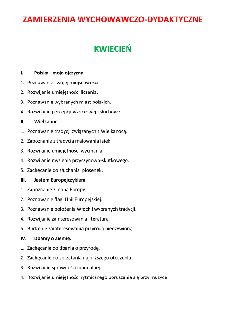 ZAMIERZENIA WYCHOWAWCZO-DYDAKTYCZNE KWIECIEŃ I. Polska - moja ojczyzna 1. Poznawanie swojej miejscowości. 2. Rozwijanie umiejętności liczenia. 3. Poznawanie wybranych miast polskich. 4. Rozwijanie percepcji wzrokowej i słuchowej. II. Wielkanoc 1. Poznawanie tradycji związanych z Wielkanocą. 2. Zapoznanie z tradycją malowania jajek. 3. Rozwijanie umiejętności wycinania. 4. Rozwijanie myślenia przyczynowo-skutkowego. 5. Zachęcanie do słuchania piosenek. III. Jestem Europejczykiem 1. Zapoznanie z mapą Europy. 2. Poznawanie flagi Unii Europejskiej. 3. Poznawanie położenia Włoch i wybranych tradycji. 4. Rozwijanie zainteresowania literaturą. 5. Budzenie zainteresowania przyrodą nieożywioną. IV. Dbamy o Ziemię. 1. Zachęcanie do dbania o przyrodę. 2. Zachęcanie do sprzątania najbliższego otoczenia. 3. Rozwijanie sprawności manualnej. 4. Rozwijanie umiejętności rytmicznego poruszania się przy muzyce Wiersz do nauki „Pisanki” H. Szayerowa Zniosła mi kura jajek sześć. Pytam więc kurę, czy mogę je zjeść. Ko, ko, ko... Zaprzecza hardo. Ani sadzonych, ani na twardo. Spojrzała na mnie... Jak na osła... i zagdakała wielce wyniosła, Że jaja na pisanki zniosła. Piosenka do nauki „Pisanki” I. Pisanki, pisanki, II. Na jednej kogucik, jajka malowane, a na drugiej słońce, nie ma Wielkanocy śmieją się na trzeciej bez barwnych pisanek! laleczki tańczące. Pisanki, pisanki, Na czwartej kwiatuszki, jajka kolorowe, a na piątej gwiazdki. na nich malowane Na każdej pisance bajki pisankowe. piękne opowiastki.