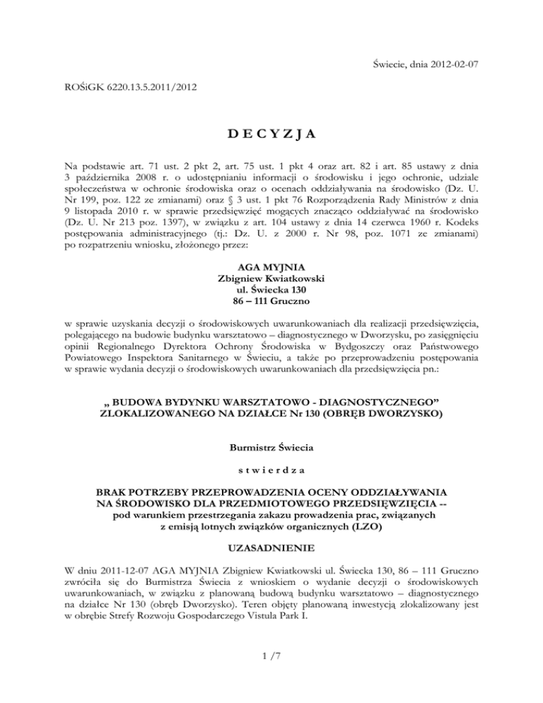 Świecie, dnia 2012-02-07 ROŚiGK 6220.13.5.2011/2012 DECYZJA Na podstawie art. 71 ust. 2 pkt 2, art. 75 ust. 1 pkt 4 oraz art. 82 i art. 85 ustawy z dnia 3 października 2008 r. o udostępnianiu informacji o środowisku i jego ochronie, udziale społeczeństwa w ochronie środowiska oraz o ocenach oddziaływania na środowisko (Dz. U. Nr 199, poz. 122 ze zmianami) oraz § 3 ust. 1 pkt 76 Rozporządzenia Rady Ministrów z dnia 9 listopada 2010 r. w sprawie przedsięwzięć mogących znacząco oddziaływać na środowisko (Dz. U. Nr 213 poz. 1397), w związku z art. 104 ustawy z dnia 14 czerwca 1960 r. Kodeks postępowania administracyjnego (tj.: Dz. U. z 2000 r. Nr 98, poz. 1071 ze zmianami) po rozpatrzeniu wniosku, złożonego przez: AGA MYJNIA Zbigniew Kwiatkowski ul. Świecka 130 86 – 111 Gruczno w sprawie uzyskania decyzji o środowiskowych uwarunkowaniach dla realizacji przedsięwzięcia, polegającego na budowie budynku warsztatowo – diagnostycznego w Dworzysku, po zasięgnięciu opinii Regionalnego Dyrektora Ochrony Środowiska w Bydgoszczy oraz Państwowego Powiatowego Inspektora Sanitarnego w Świeciu, a także po przeprowadzeniu postępowania w sprawie wydania decyzji o środowiskowych uwarunkowaniach dla przedsięwzięcia pn.: „ BUDOWA BYDYNKU WARSZTATOWO - DIAGNOSTYCZNEGO” ZLOKALIZOWANEGO NA DZIAŁCE Nr 130 (OBRĘB DWORZYSKO) Burmistrz Świecia stwierdza BRAK POTRZEBY PRZEPROWADZENIA OCENY ODDZIAŁYWANIA NA ŚRODOWISKO DLA PRZEDMIOTOWEGO PRZEDSIĘWZIĘCIA -pod warunkiem przestrzegania zakazu prowadzenia prac, związanych z emisją lotnych związków organicznych (LZO) UZASADNIENIE W dniu 2011-12-07 AGA MYJNIA Zbigniew Kwiatkowski ul. Świecka 130, 86 – 111 Gruczno zwróciła się do Burmistrza Świecia z wnioskiem o wydanie decyzji o środowiskowych uwarunkowaniach, w związku z planowaną budową budynku warsztatowo – diagnostycznego na działce Nr 130 (obręb Dworzysko). Teren objęty planowaną inwestycją zlokalizowany jest w obrębie Strefy Rozwoju Gospodarczego Vistula Park I. 1 /7 Do wniosku o wydanie decyzji załączona została karta informacyjna przedsięwzięcia, wypis z rejestru gruntów, wyrys z mapy ewidencyjnej, mapa sytuacyjno – wysokościowa oraz wypis i wyrys z miejscowego planu zagospodarowania przestrzennego. Wniosek o wydanie decyzji o środowiskowych uwarunkowaniach zarejestrowany został w publicznie dostępnym wykazie danych o dokumentach zawierających informację o środowisku i jego ochronie, prowadzonym na stronach internetowych Biuletynu Informacji Publicznej Urzędu Miejskiego w Świeciu www.bip.um-swiecie.pl pod Nr 599/2011. Przedmiotowe przedsięwzięcie polegać będzie na budowie budynku warsztatowo – diagnostycznego o konstrukcji stalowej, na fundamencie betonowym z jednym stanowiskiem naprawczym, wyposażonym w kanał o głębokości 1,6 m. W zakładzie nie będą prowadzone prace lakiernicze. Na działce objętej planowaną inwestycją realizowana jest obecnie budowa myjni dla samochodów ciężarowych wraz z budynkiem socjalnym oraz infrastrukturą towarzyszącą. Teren przeznaczony pod planowane przedsięwzięcie jest objęty miejscowym planem zagospodarowania przestrzennego (uchwała Nr 272/05 Rady Miejskiej w Świeciu z dnia 31 marca 2005 r. w sprawie miejscowego planu zagospodarowania przestrzennego dla terenu strefy rozwoju gospodarczego we wsi Dworzysko, publikacja: Dziennik Urzędowy Województwa Kujawsko – Pomorskiego z dnia 22 czerwca 2005 r. Nr 76, poz. 1418). Zgodnie z zapisami miejscowego planu, teren objęty planowanym przedsięwzięciem znajduje się w jednostce strukturalnej 11 P/U, przeznaczonej pod funkcje podstawowe: produkcyjną, składową, usługową (w tym obiekty handlowe o powierzchni sprzedaży do 2000 m2) oraz funkcje uzupełniające m.in.: mieszkalną (dla właściciela nieruchomości), komunikacyjną, infrastrukturalną lub inną (obiekty małej architektury, zieleń, nośniki reklamowe). Lokalizacja planowanej inwestycji jest zgodna z ustaleniami miejscowego planu zagospodarowania przestrzennego. Zgodnie z art. 61 § 4 ustawy z dnia 14 czerwca 1960 r. Kodeks postępowania administracyjnego (Dz. U. z 2000 r. Nr 98, poz. 1071 z późniejszymi zmianami) Burmistrz Świecia, pismem znak: ROŚiGK 6220.13.1.2011 z dnia 2011-12-22 zawiadomił strony o wszczęciu przedmiotowego postępowania. Informacja o rozpoczęciu procedury administracyjnej została podana do publicznej wiadomości na stronach www.bip.um-swiecie.pl oraz na tablicy ogłoszeń w siedzibie UM Świecie. Na podstawie § 3 ust. 1 pkt 76 Rozporządzenia Rady Ministrów z dnia 9 listopada 2010 roku w sprawie przedsięwzięć mogących znacząco oddziaływać na środowisko (Dz. U. Nr 213, poz. 1397) przedmiotową inwestycję zakwalifikowano do przedsięwzięć mogących potencjalnie znacząco oddziaływać na środowisko, dla których przeprowadzenie oceny oddziaływania na środowisko może być wymagane (stacje obsługi lub remontowe środków transportu). Zgodnie z art. 64 ust. 1 i 2 ustawy z dnia 3 października 2008 r. o udostępnianiu informacji o środowisku i jego ochronie, udziale społeczeństwa w ochronie środowiska oraz o ocenach oddziaływania na środowisko (Dz. U. Nr 199, poz. 1227 ze zmianami) - w dniu 2011-12-19 Burmistrz Świecia zwrócił się do Regionalnego Dyrektora Ochrony Środowiska w Bydgoszczy oraz Państwowego Powiatowego Inspektora Sanitarnego w Świeciu o wyrażenie opinii w sprawie konieczności przeprowadzenia oceny oddziaływania na środowisko oraz określenie ewentualnego zakresu raportu OOŚ dla przedmiotowego przedsięwzięcia. W dniu 2011-12-27 Państwowy Powiatowy Inspektor Sanitarny wyraził opinię znak: N.NZ-4200-84/113/246/11 o braku konieczności przeprowadzenia oceny oddziaływania przedmiotowego przedsięwzięcia na środowisko. Dokument ten zarejestrowany został 2 /7 w publicznie dostępnym wykazie danych o dokumentach zawierających informację o środowisku i jego ochronie, prowadzonym na