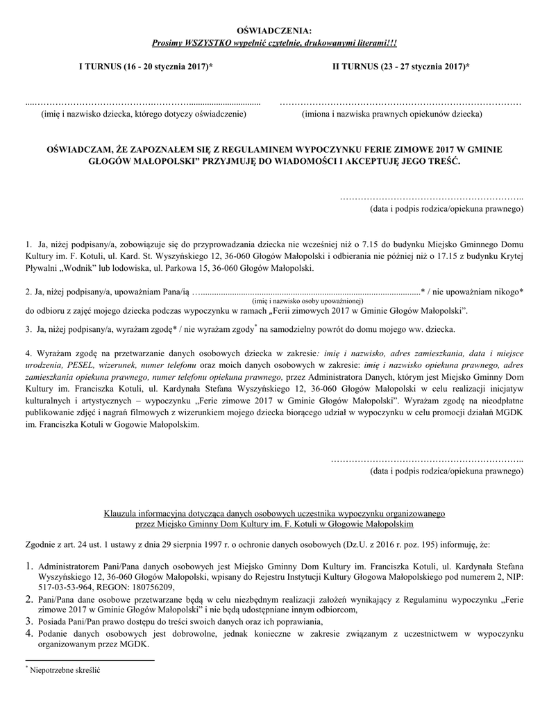 OŚWIADCZENIA: Prosimy WSZYSTKO wypełnić czytelnie, drukowanymi literami!!! I TURNUS (16 - 20 stycznia 2017)* II TURNUS (23 - 27 stycznia 2017)* ....………………………………….…………................................ (imię i nazwisko dziecka, którego dotyczy oświadczenie) ……………………………………………………………………… (imiona i nazwiska prawnych opiekunów dziecka) OŚWIADCZAM, ŻE ZAPOZNAŁEM SIĘ Z REGULAMINEM WYPOCZYNKU FERIE ZIMOWE 2017 W GMINIE GŁOGÓW MAŁOPOLSKI” PRZYJMUJĘ DO WIADOMOŚCI I AKCEPTUJĘ JEGO TREŚĆ. …………………………………………………….. (data i podpis rodzica/opiekuna prawnego) 1. Ja, niżej podpisany/a, zobowiązuje się do przyprowadzania dziecka nie wcześniej niż o 7.15 do budynku Miejsko Gminnego Domu Kultury im. F. Kotuli, ul. Kard. St. Wyszyńskiego 12, 36-060 Głogów Małopolski i odbierania nie później niż o 17.15 z budynku Krytej Pływalni „Wodnik” lub lodowiska, ul. Parkowa 15, 36-060 Głogów Małopolski. 2. Ja, niżej podpisany/a, upoważniam Pana/ią …..................................................................................................* / nie upoważniam nikogo* (imię i nazwisko osoby upoważnionej) do odbioru z zajęć mojego dziecka podczas wypoczynku w ramach „Ferii zimowych 2017 w Gminie Głogów Małopolski”. 3. Ja, niżej podpisany/a, wyrażam zgodę* / nie wyrażam zgody* na samodzielny powrót do domu mojego ww. dziecka. 4. Wyrażam zgodę na przetwarzanie danych osobowych dziecka w zakresie: imię i nazwisko, adres zamieszkania, data i miejsce urodzenia, PESEL, wizerunek, numer telefonu oraz moich danych osobowych w zakresie: imię i nazwisko opiekuna prawnego, adres zamieszkania opiekuna prawnego, numer telefonu opiekuna prawnego, przez Administratora Danych, którym jest Miejsko Gminny Dom Kultury im. Franciszka Kotuli, ul. Kardynała Stefana Wyszyńskiego 12, 36-060 Głogów Małopolski w celu realizacji inicjatyw kulturalnych i artystycznych – wypoczynku „Ferie zimowe 2017 w Gminie Głogów Małopolski”. Wyrażam zgodę na nieodpłatne publikowanie zdjęć i nagrań filmowych z wizerunkiem mojego dziecka biorącego udział w wypoczynku w celu promocji działań MGDK im. Franciszka Kotuli w Gogowie Małopolskim. ……………………………………………………….. (data i podpis rodzica/opiekuna prawnego) Klauzula informacyjna dotycząca danych osobowych uczestnika wypoczynku organizowanego przez Miejsko Gminny Dom Kultury im. F. Kotuli w Głogowie Małopolskim Zgodnie z art. 24 ust. 1 ustawy z dnia 29 sierpnia 1997 r. o ochronie danych osobowych (Dz.U. z 2016 r. poz. 195) informuję, że: 1. Administratorem Pani/Pana danych osobowych jest Miejsko Gminny Dom Kultury im. Franciszka Kotuli, ul. Kardynała Stefana 2. 3. 4. * Wyszyńskiego 12, 36-060 Głogów Małopolski, wpisany do Rejestru Instytucji Kultury Głogowa Małopolskiego pod numerem 2, NIP: 517-03-53-964, REGON: 180756209, Pani/Pana dane osobowe przetwarzane będą w celu niezbędnym realizacji założeń wynikający z Regulaminu wypoczynku „Ferie zimowe 2017 w Gminie Głogów Małopolski” i nie będą udostępniane innym odbiorcom, Posiada Pani/Pan prawo dostępu do treści swoich danych oraz ich poprawiania, Podanie danych osobowych jest dobrowolne, jednak konieczne w zakresie związanym z uczestnictwem w wypoczynku organizowanym przez MGDK. Niepotrzebne skreślić