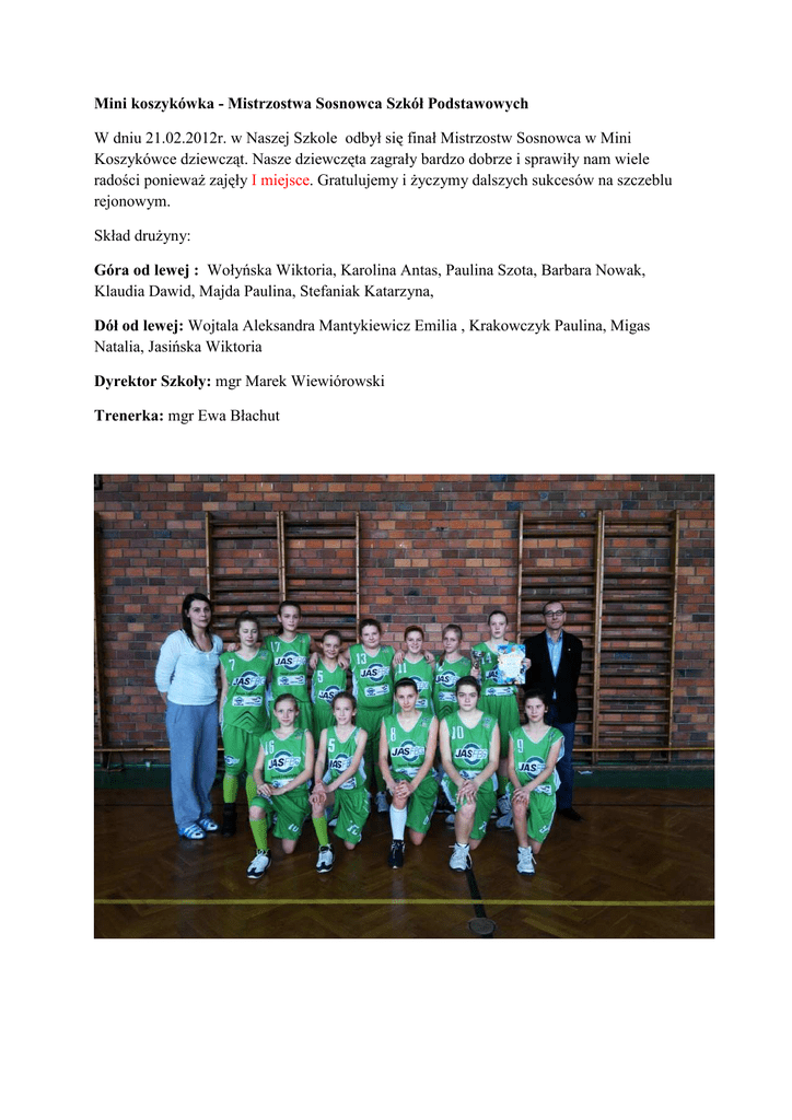 Mini koszykówka - Mistrzostwa Sosnowca Szkół Podstawowych W dniu 21.02.2012r. w Naszej Szkole odbył się finał Mistrzostw Sosnowca w Mini Koszykówce dziewcząt. Nasze dziewczęta zagrały bardzo dobrze i sprawiły nam wiele radości ponieważ zajęły I miejsce. Gratulujemy i życzymy dalszych sukcesów na szczeblu rejonowym. Skład drużyny: Góra od lewej : Wołyńska Wiktoria, Karolina Antas, Paulina Szota, Barbara Nowak, Klaudia Dawid, Majda Paulina, Stefaniak Katarzyna, Dół od lewej: Wojtala Aleksandra Mantykiewicz Emilia , Krakowczyk Paulina, Migas Natalia, Jasińska Wiktoria Dyrektor Szkoły: mgr Marek Wiewiórowski Trenerka: mgr Ewa Błachut